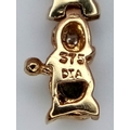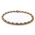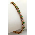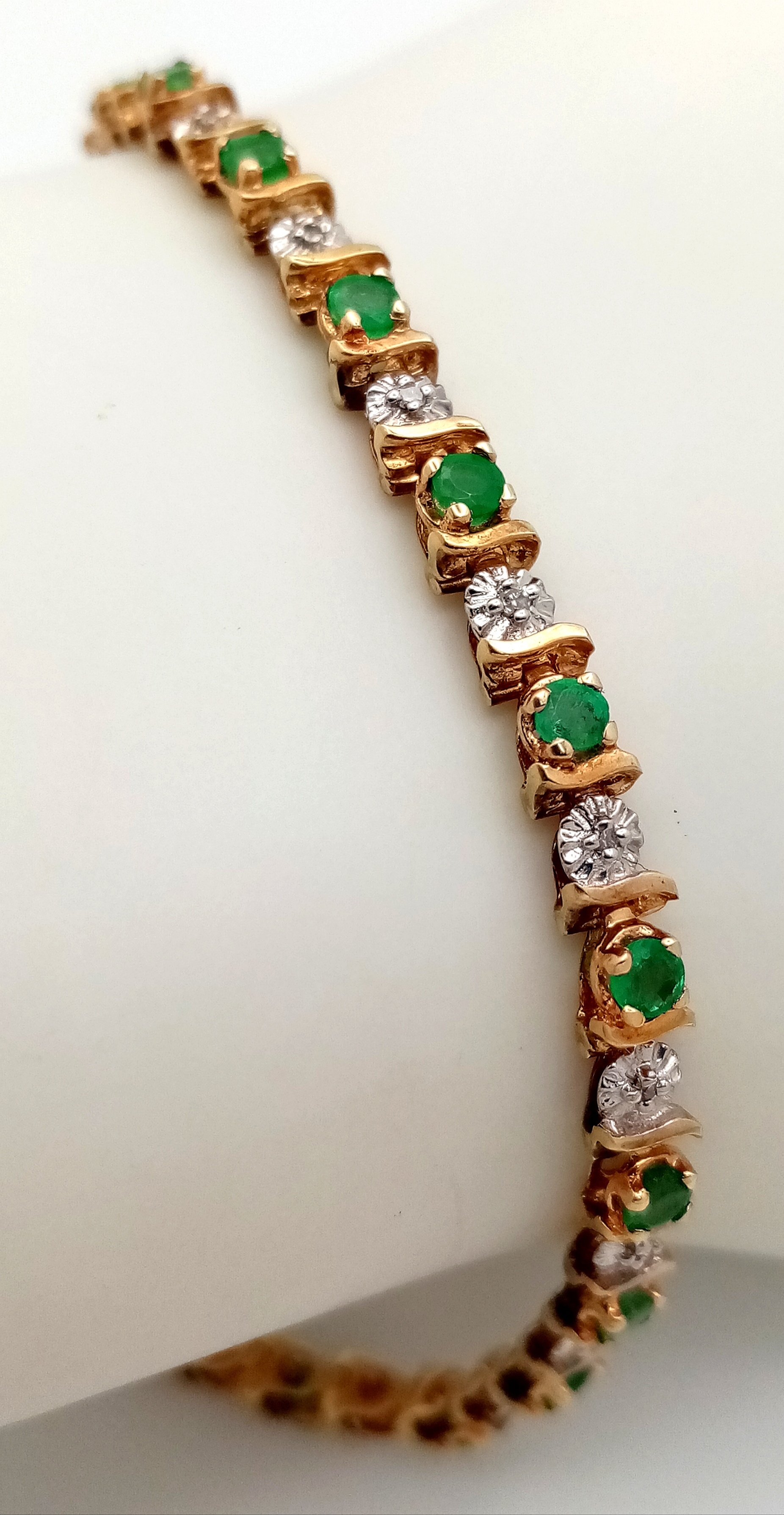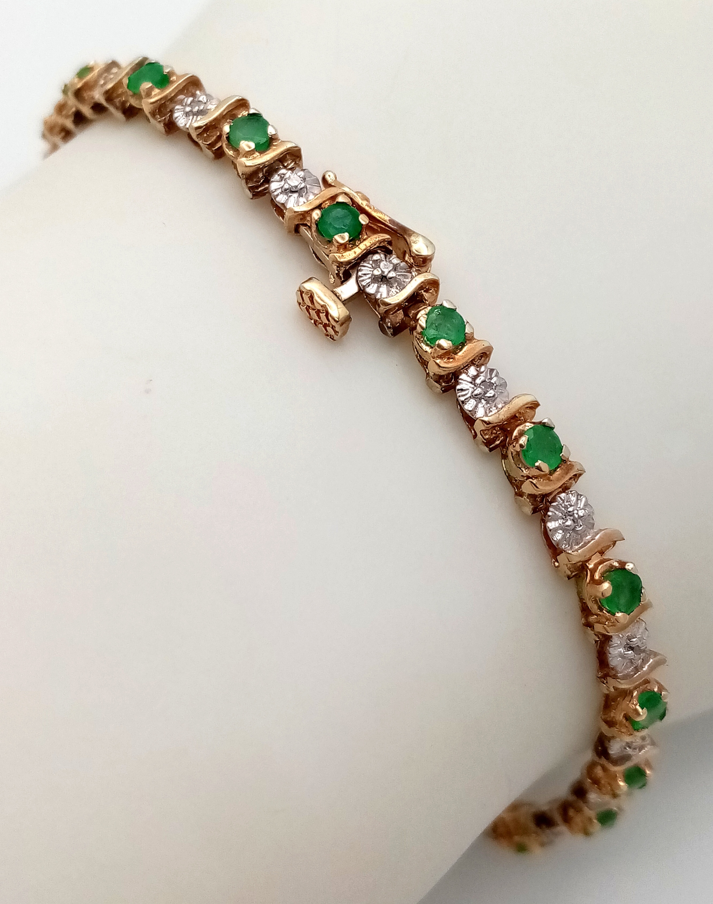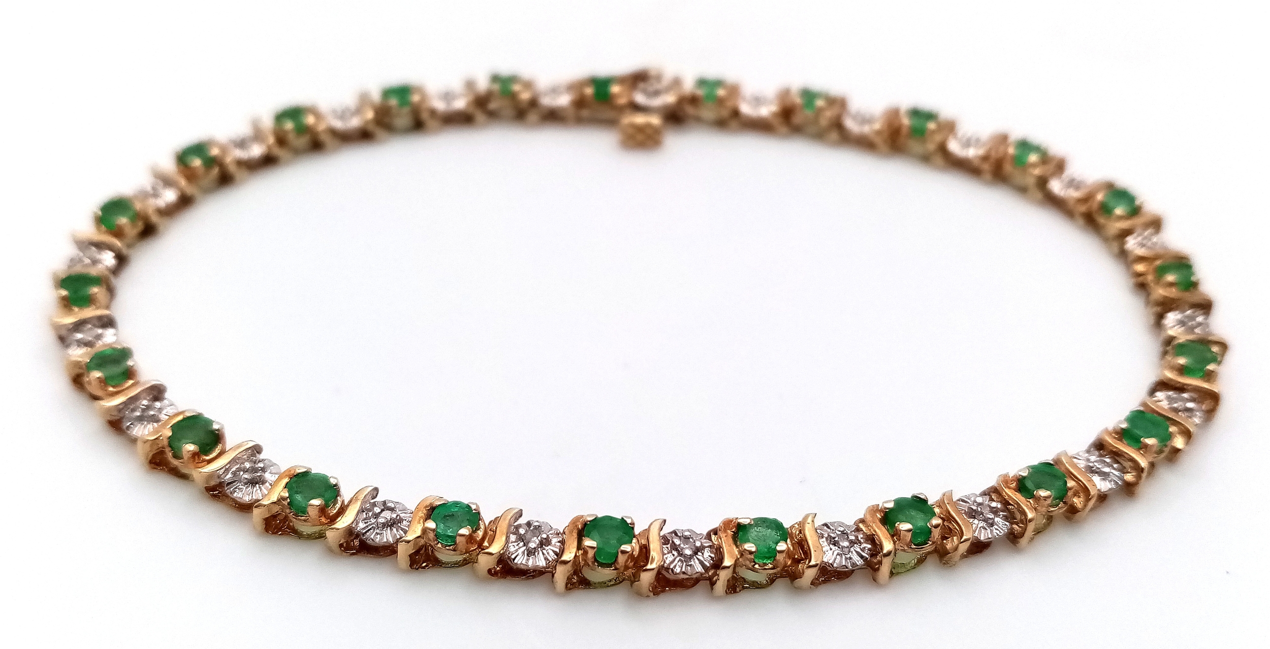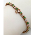 A 9K YELLOW GOLD, DIAMOND AND EMERALD BRACELET. 6.6G. WITH SAFETY CATCH FITTING. 17CM. SC7021.