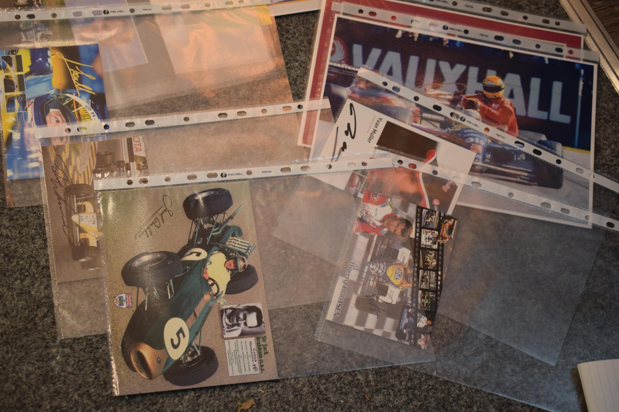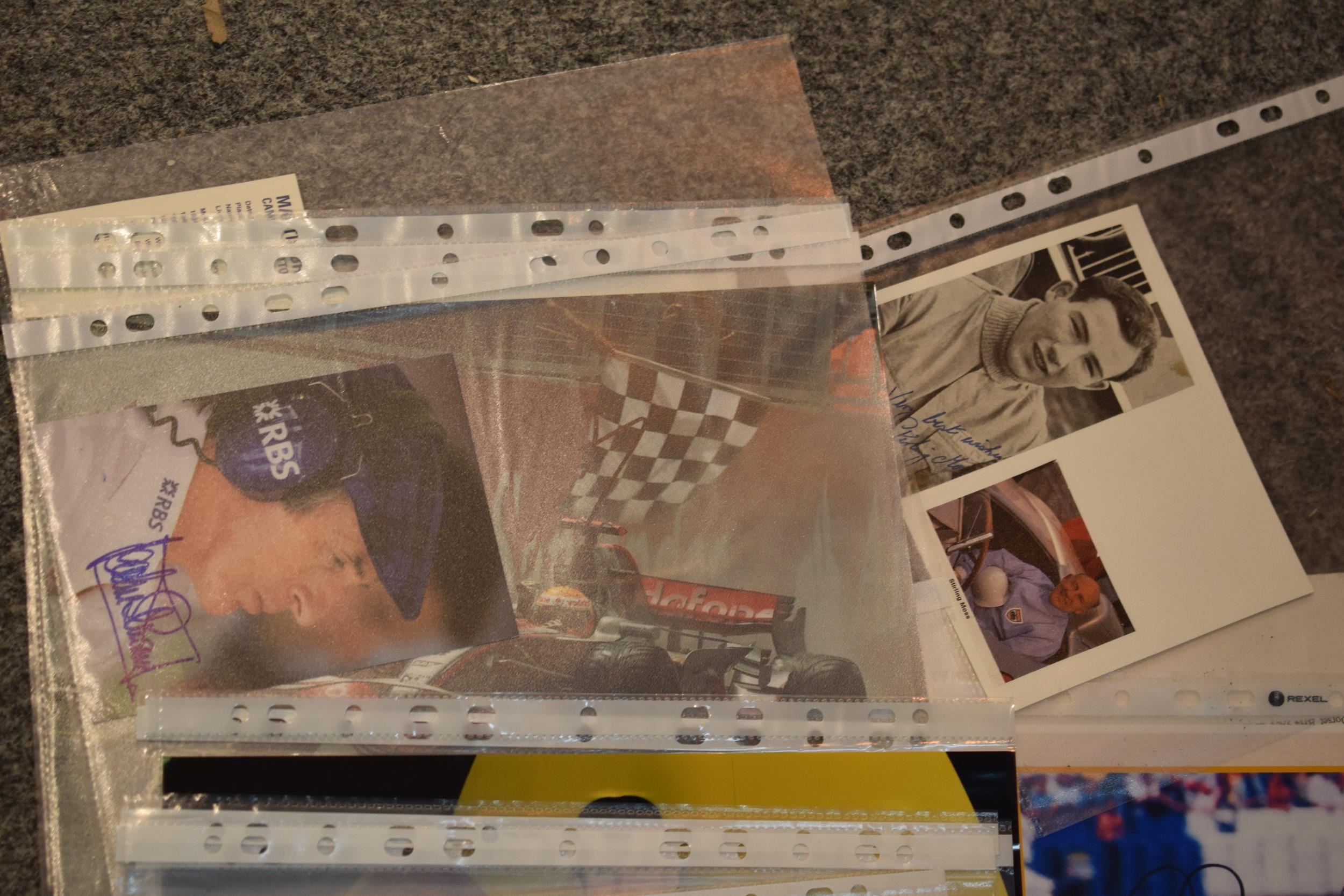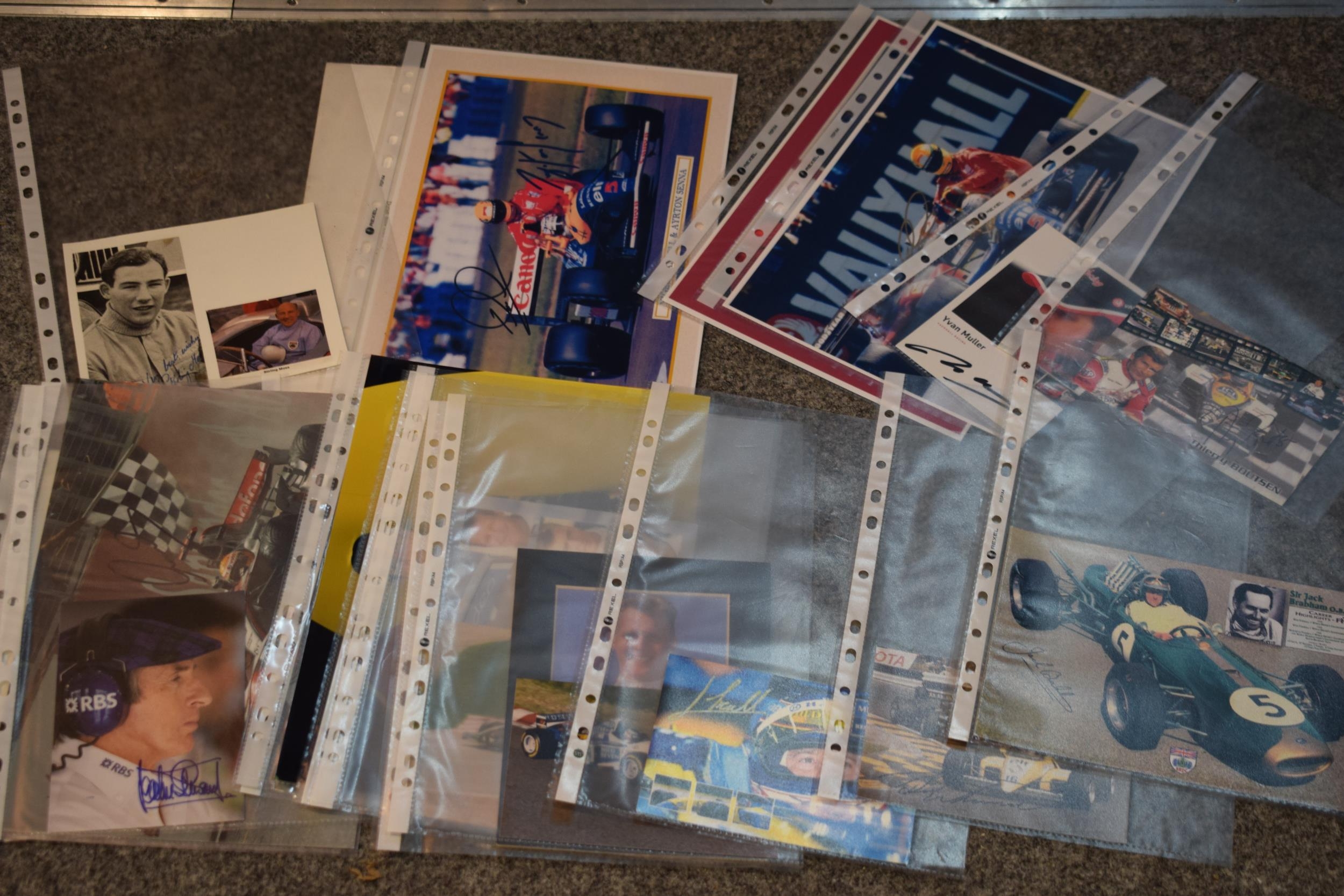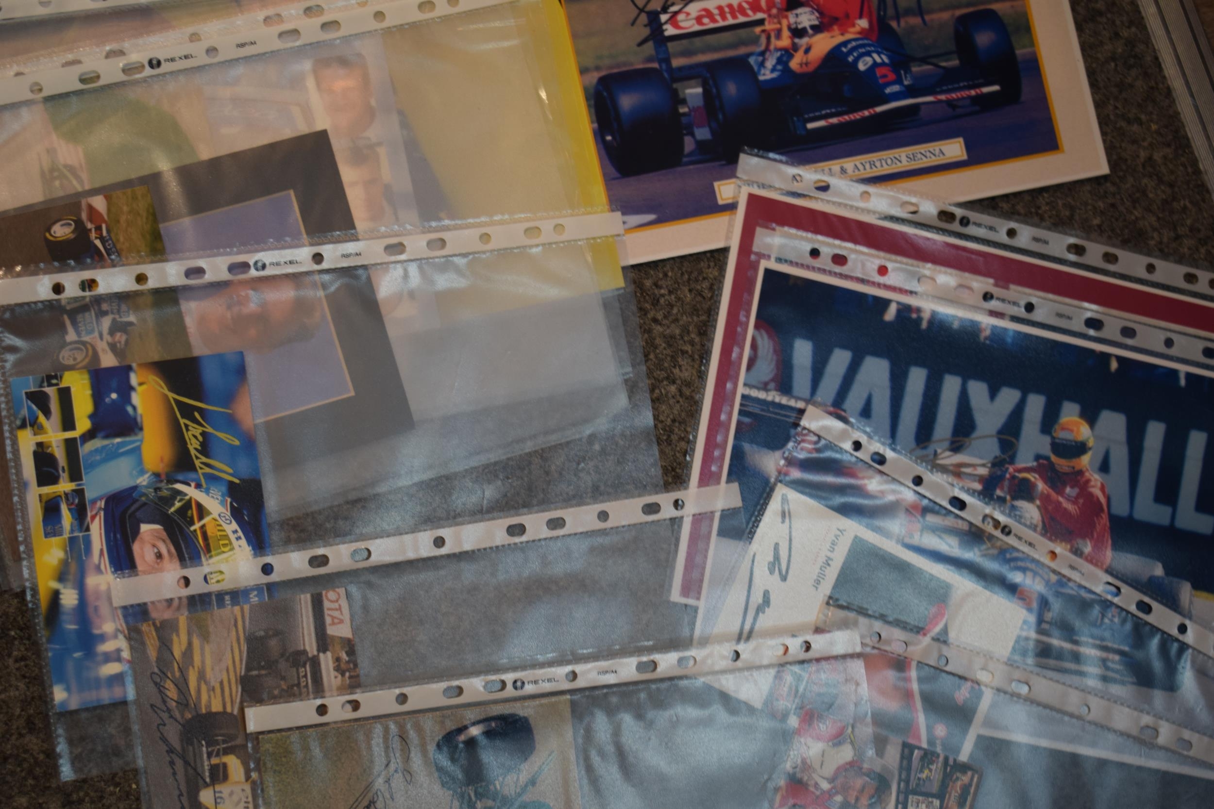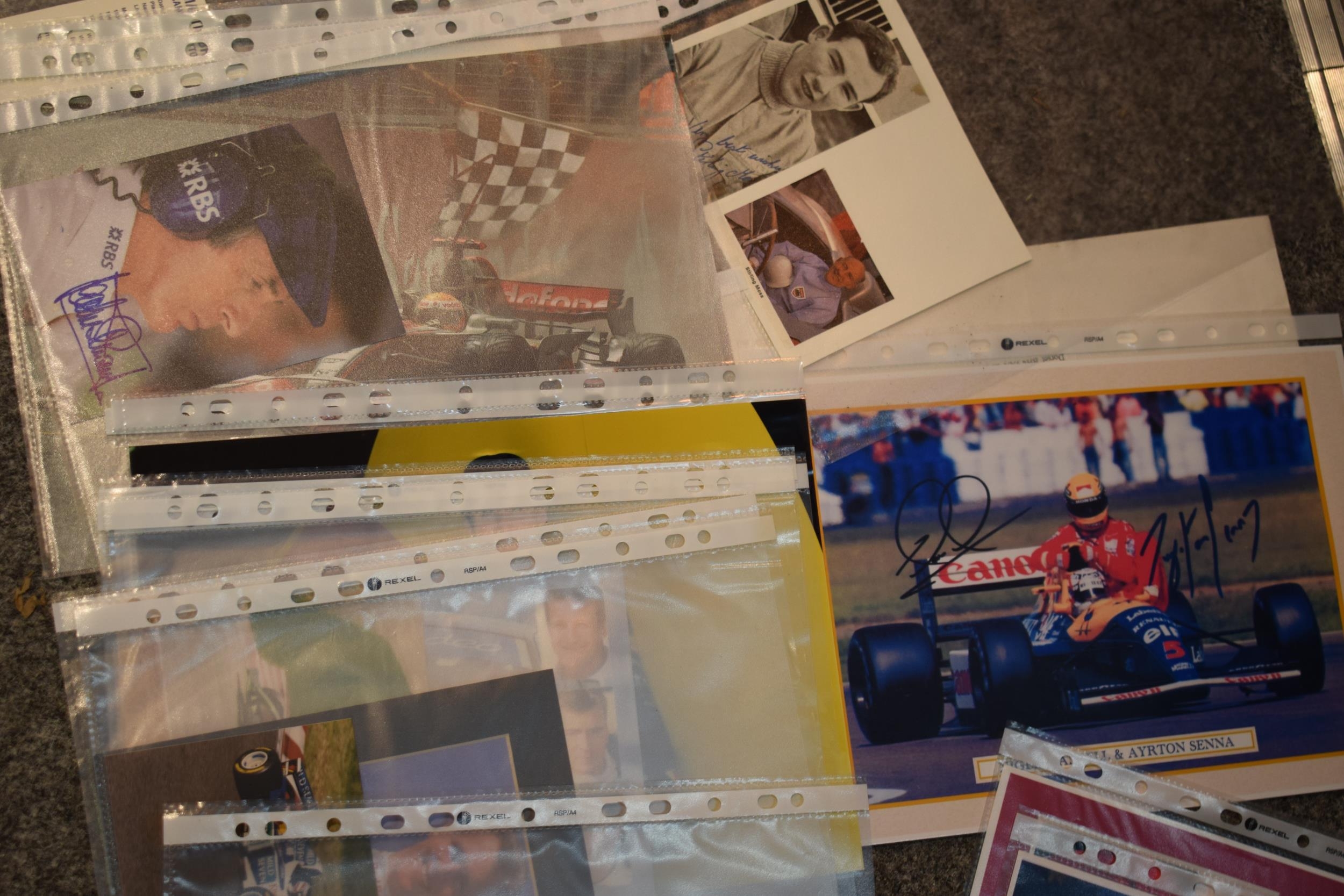A collection of autographs and facsimiles on studio photographs, some with printed certificates, to include famous names of F1 and motorsport interest such as, Ayrton Senna, Thierry Boutsen, Martin Brundle and Stirling Moss. (17)