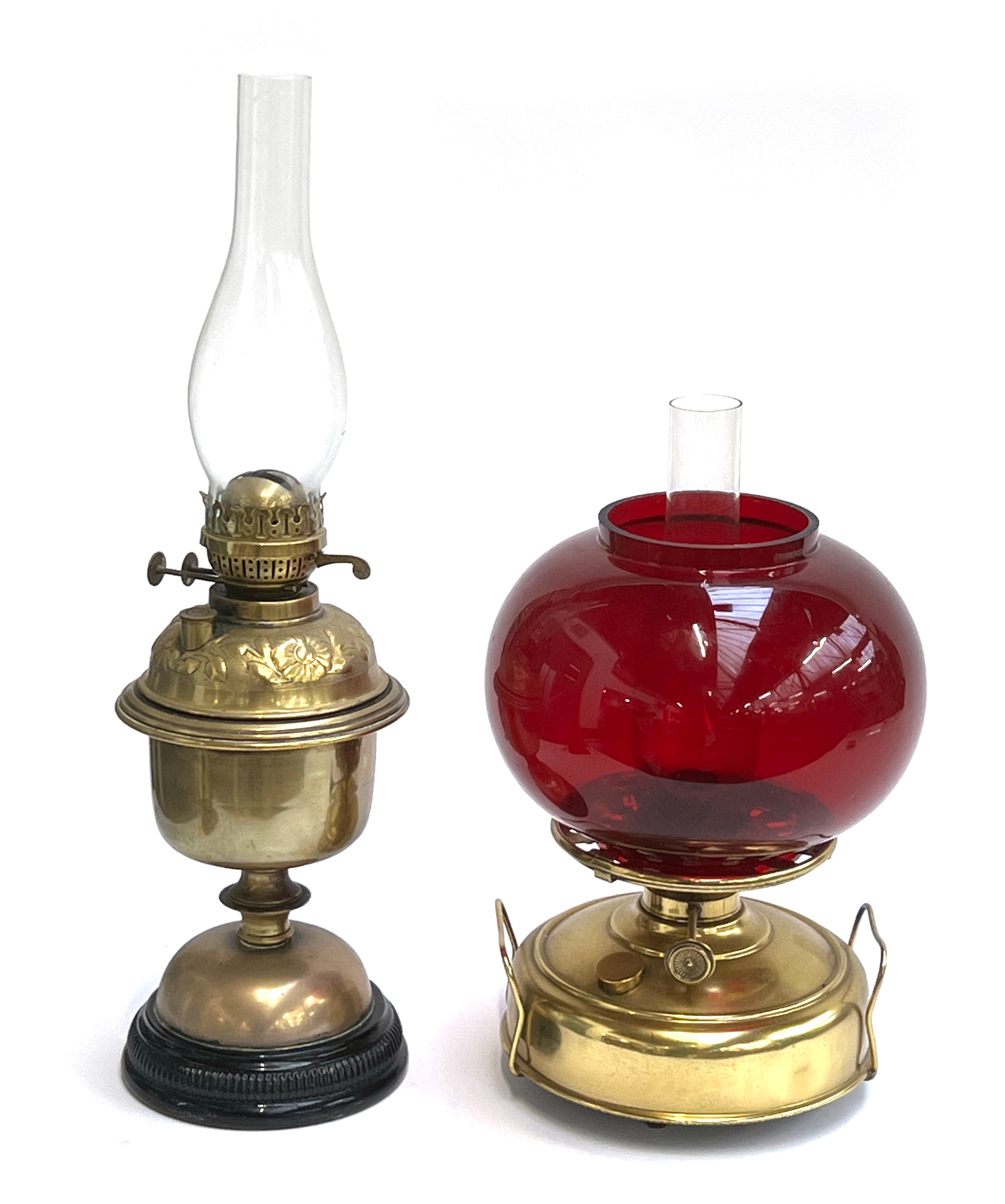 Two oil lamps, one with ruby glass shade, 56cm and 45cm high overall