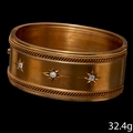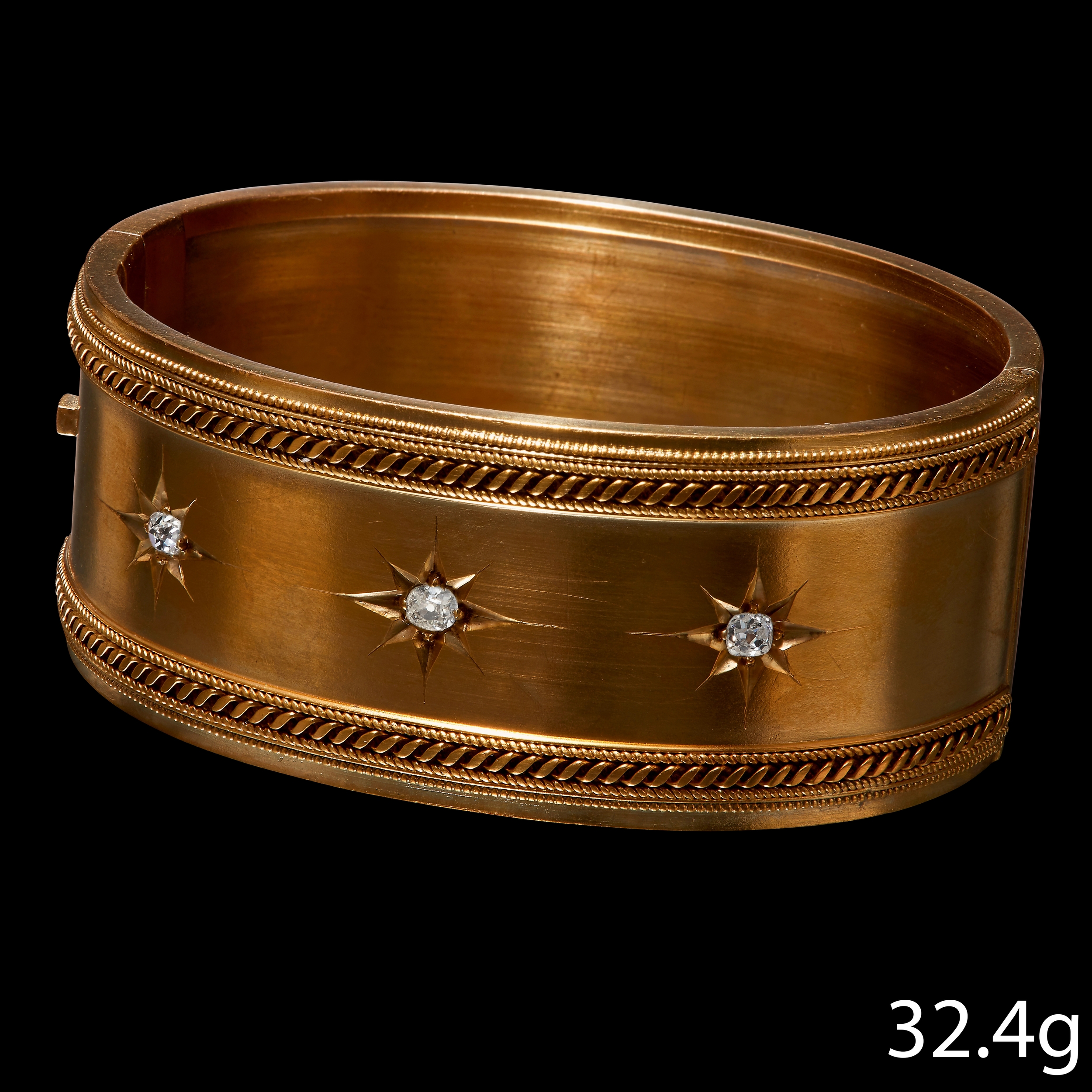 ANTIQUE VICTORIAN DIAMOND WIDE HINGED BANGLE, Set with 3 bright and lively old cut diamonds. W. 2.5 cm. Inner diam. 5.7 cm. 32.4 grams.
