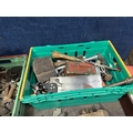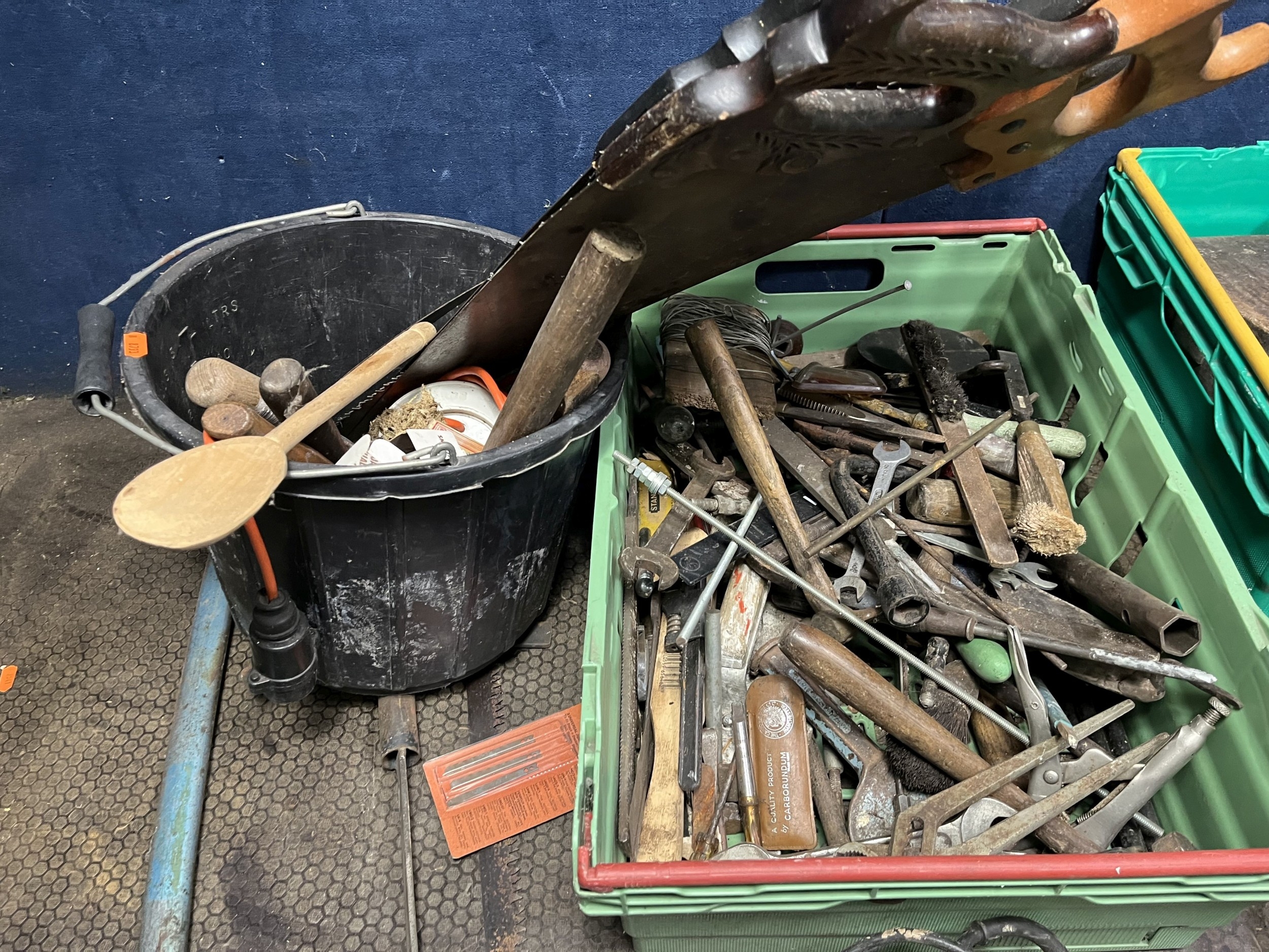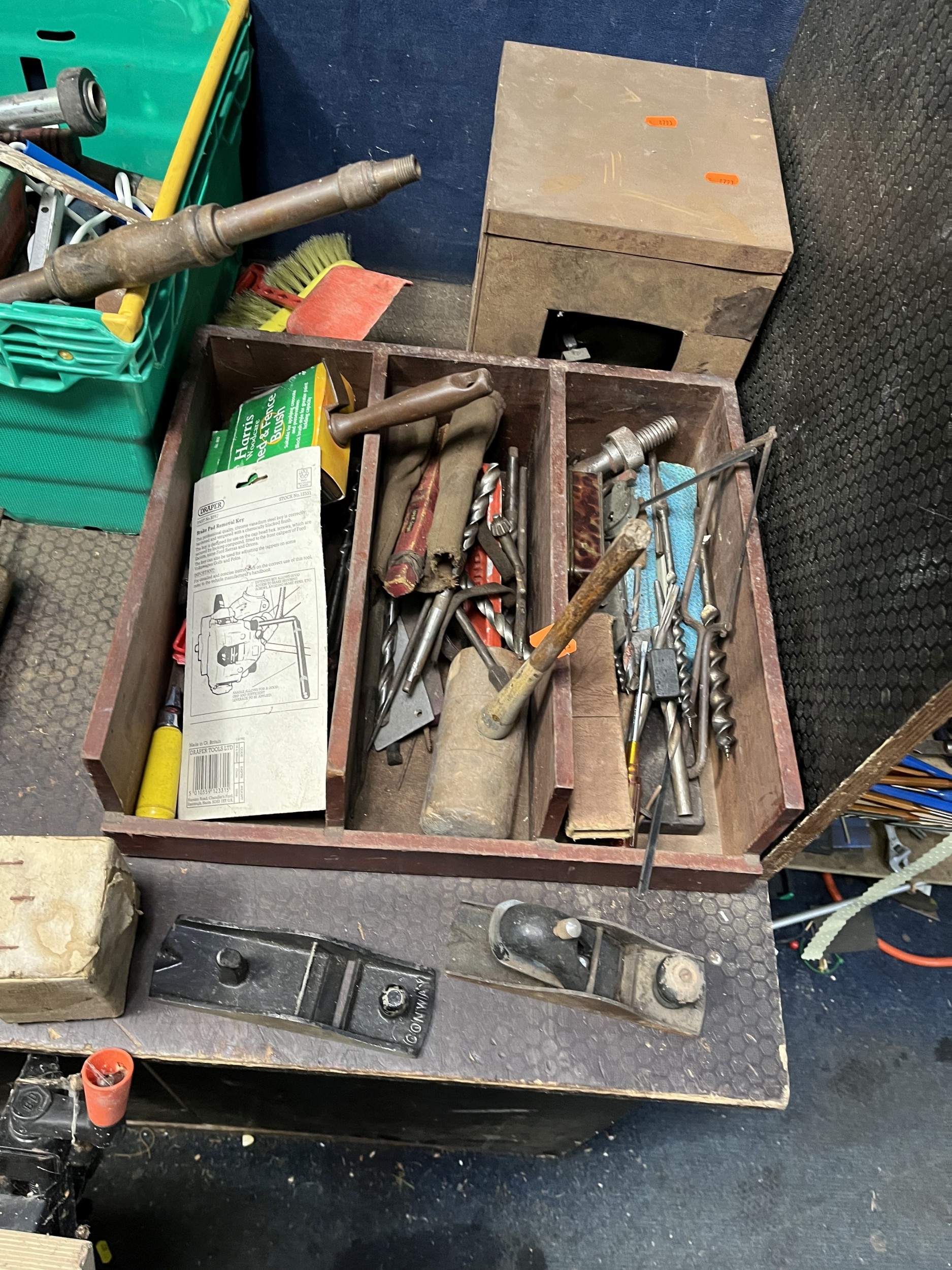 THREE TRAYS AND A BUCKET CONTAINING TOOLS, including a Stanley No.4 1/2 plane, a Fleetway shoulder brace and bits, planes, mallets, hammers, files, drill bits, a die set, etc