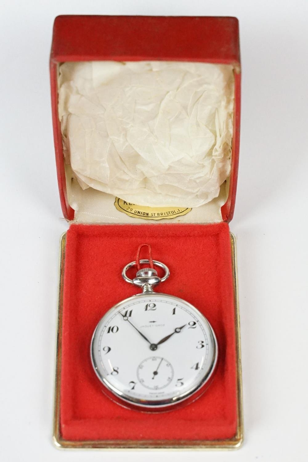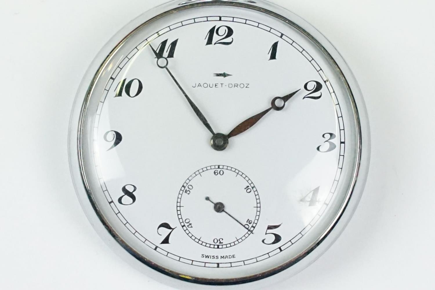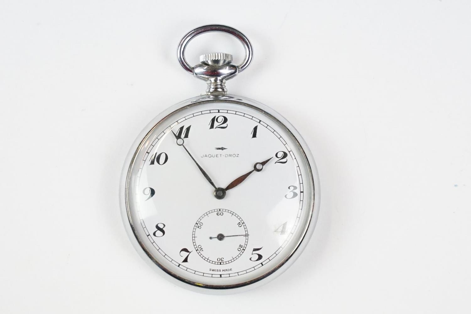 Jaquet-Droz swiss made chrome manual wind pocket watch in original box