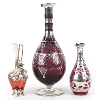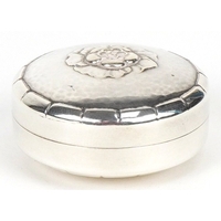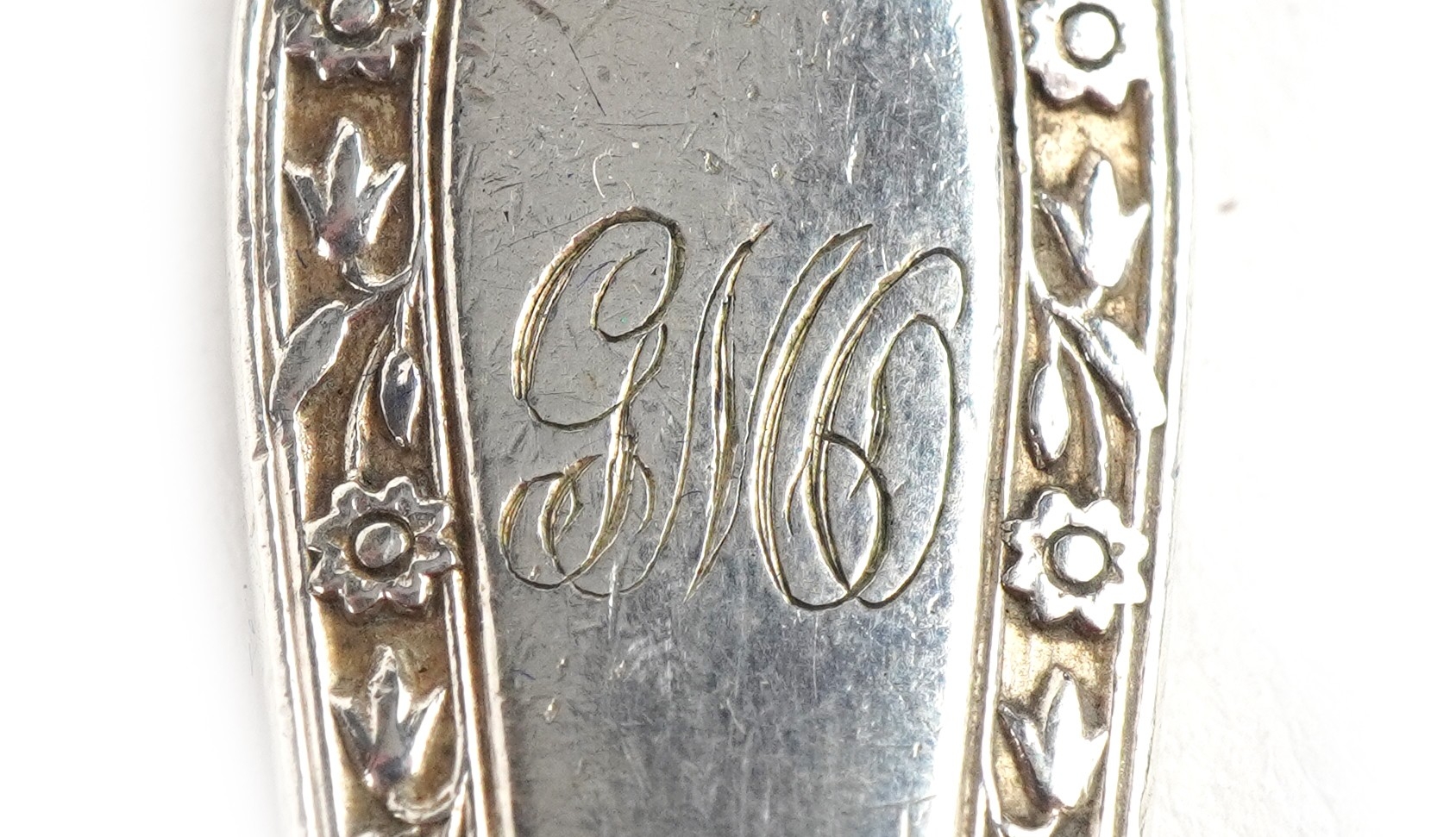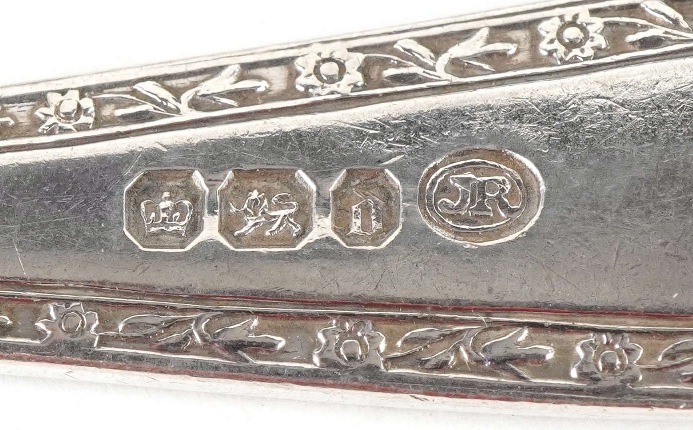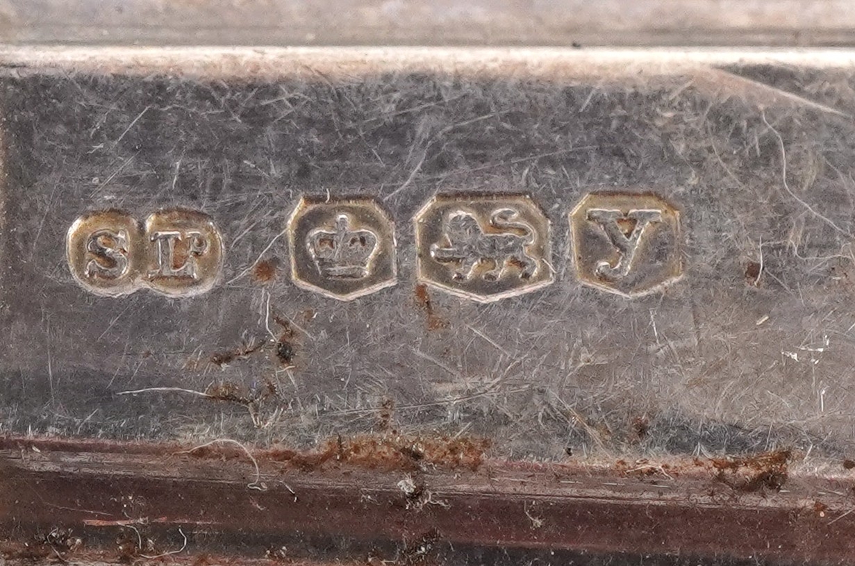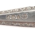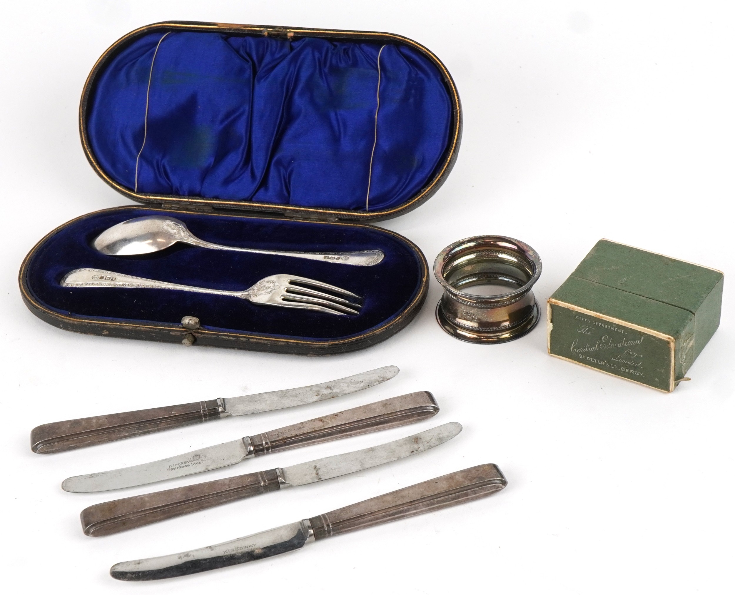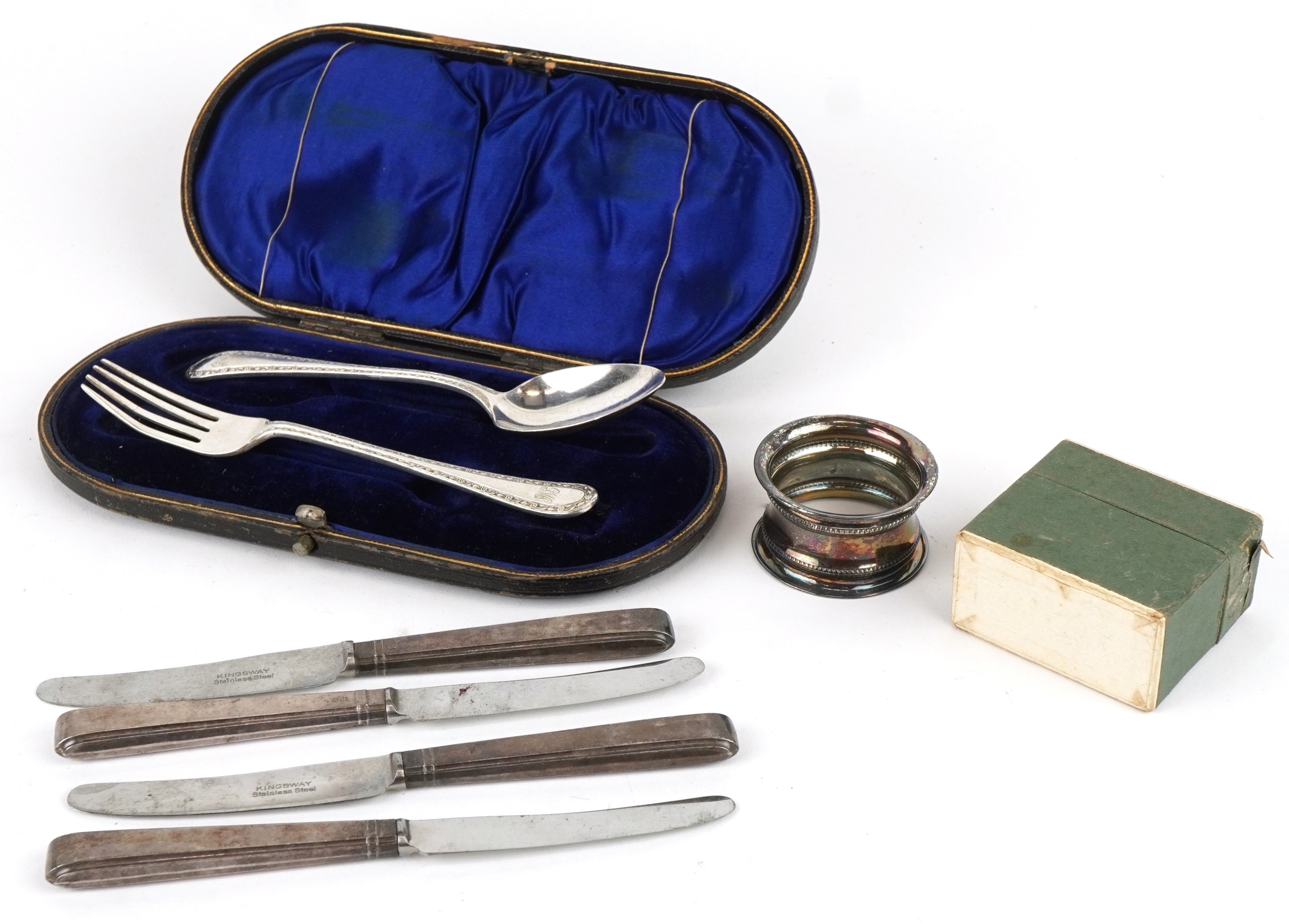 Antique and later silver including a cased christening fork and spoon, napkin ring and set of four silver handled butter knives with stainless steel blades, the largest 16cm in length, weighable silver 75.0g.
