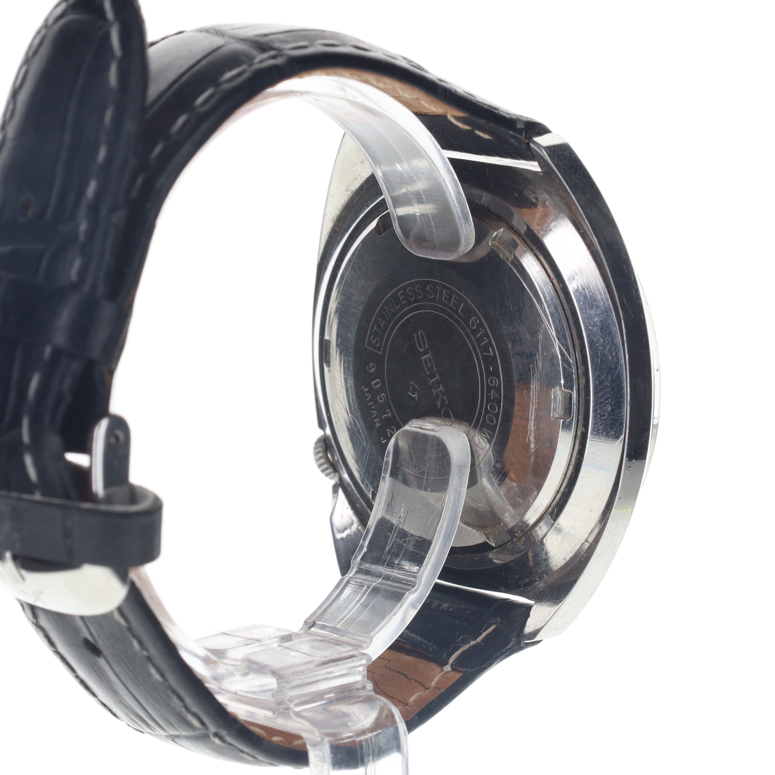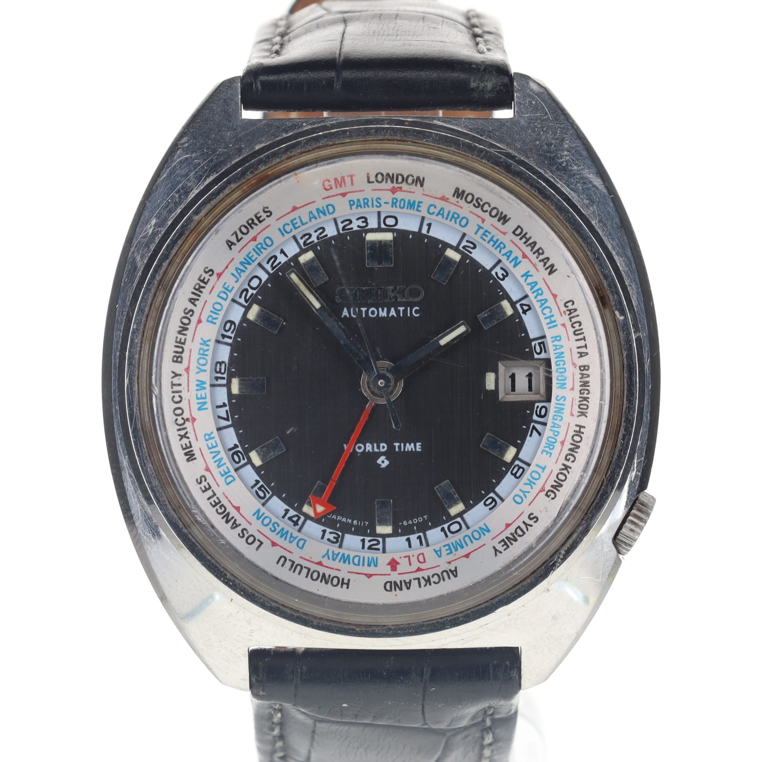 Seiko - World Time Watch. Seiko Cal. 6117 Automatic movement. Stainless steel case with an aftermarket black leather strap. An acrylic crystal with minor scratches. Grey dial with inner rotating bezel for world time function. Date window at 3'o clock. Watch reference number 6117-6400. The watch is working, winds & runs. No box or papers included.