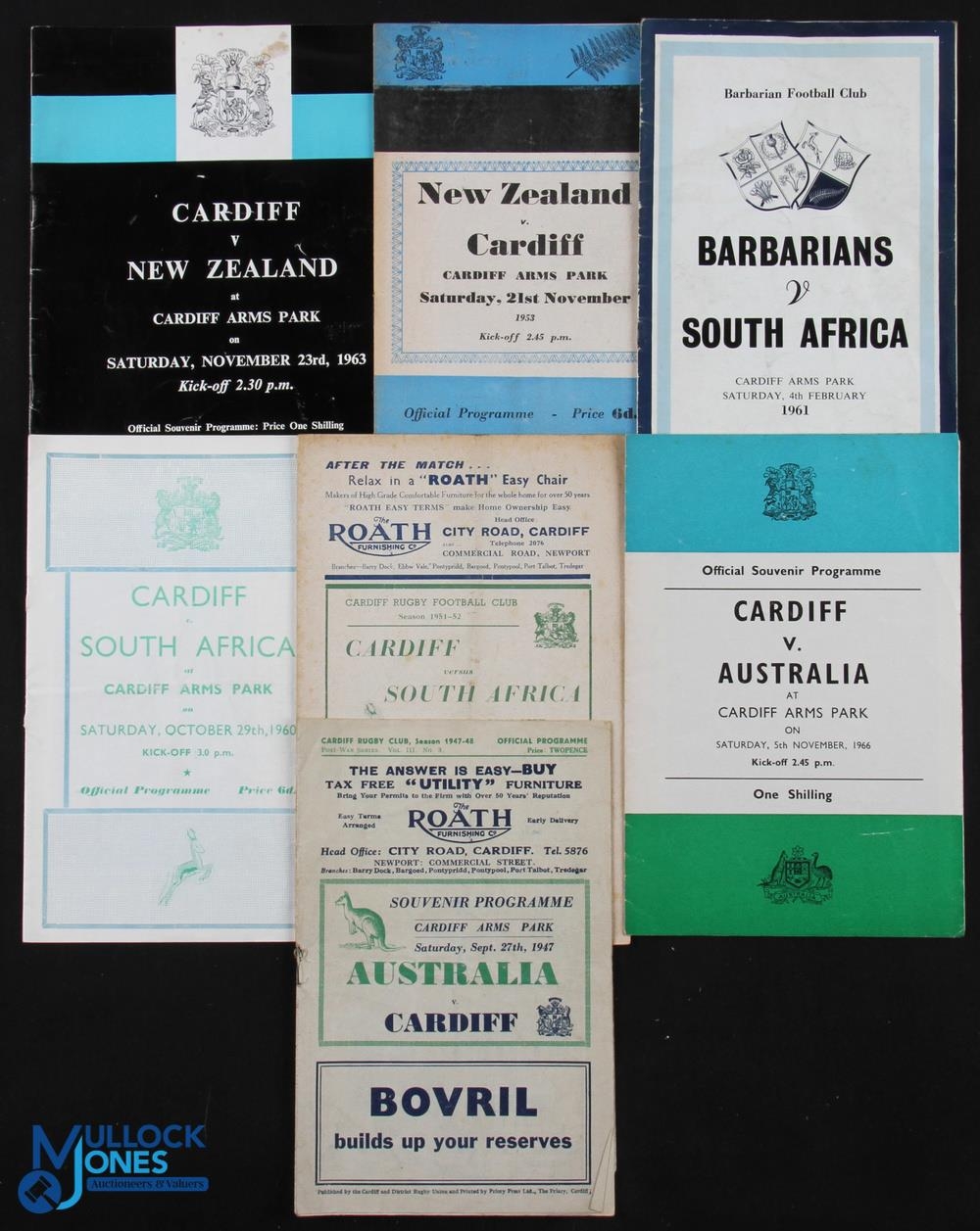 1947-63 Cardiff etc v Tourists Rugby Programmes (7): Cardiff v NZ 1953 and 1963, Australia 1947 & 1966, v S Africa 1951 & 1960 plus Barbarians v S Africa 1961 (Boks' only tour defeat). Generally G or better