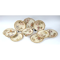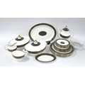 A Royal Doulton Porcelain Dinner Service in the 'Carlyle' Pattern, with blue and gilt flowers within a dark green band, printed marks, comprising: two tureens and covers, oval platter, gravy boat stand (and plain gravy boat), six dinner plates, six dessert plates and six side plates, coffee pot and cover, sugar bowl and milk jug. (29)