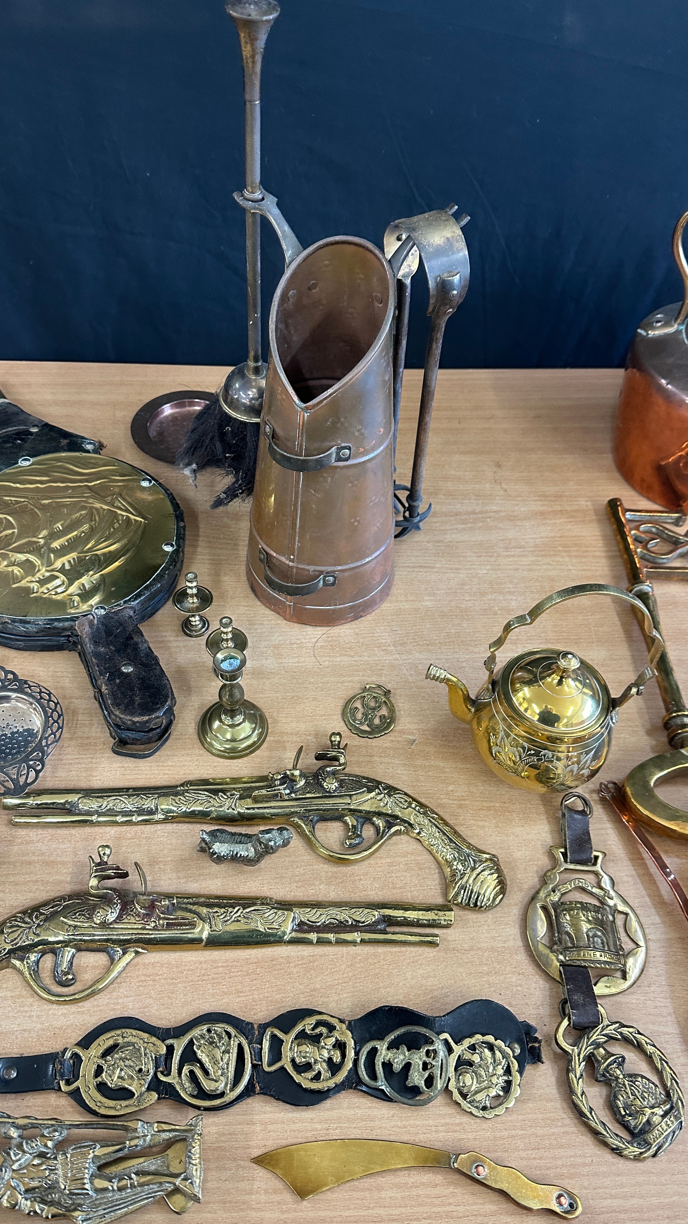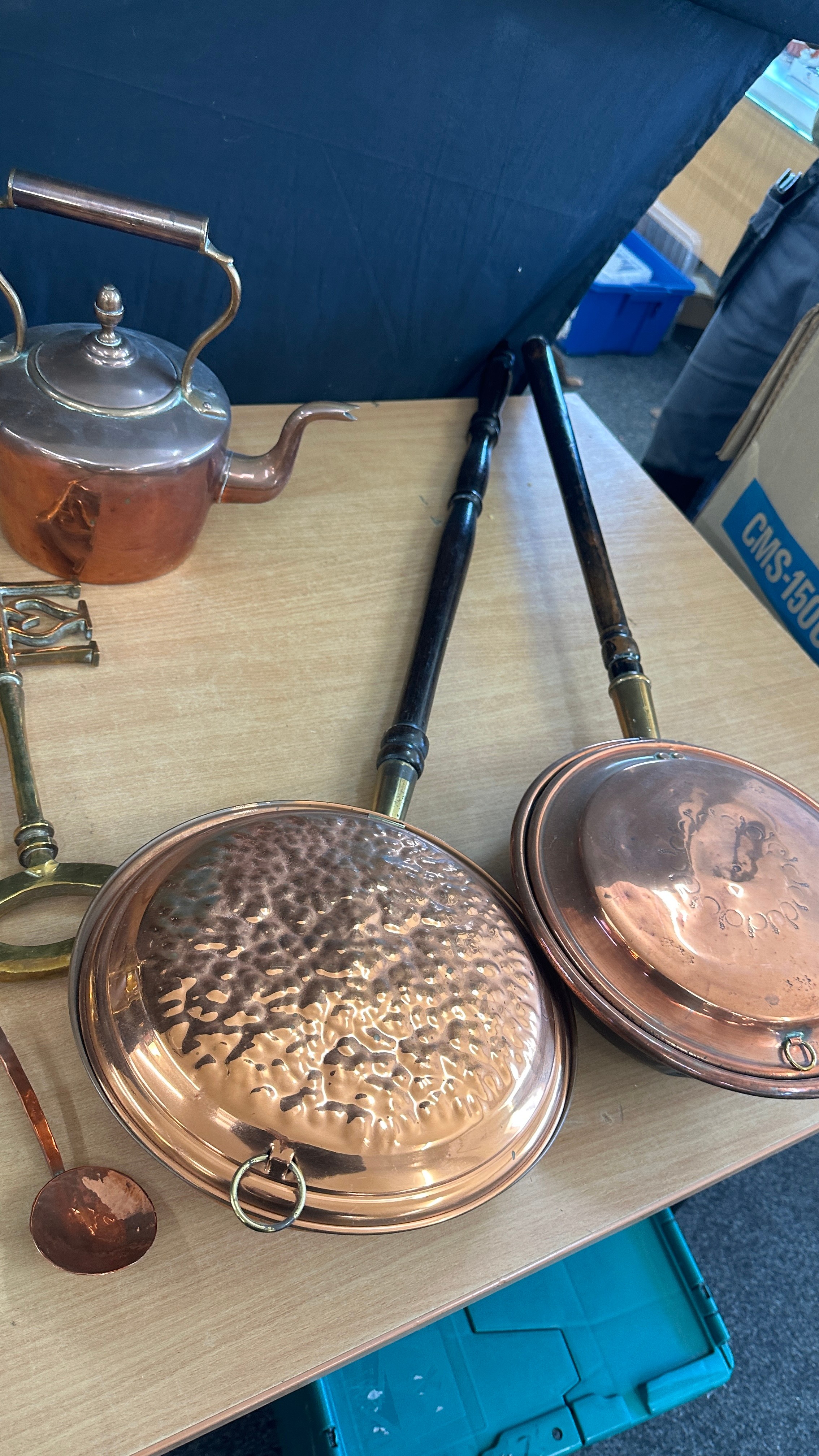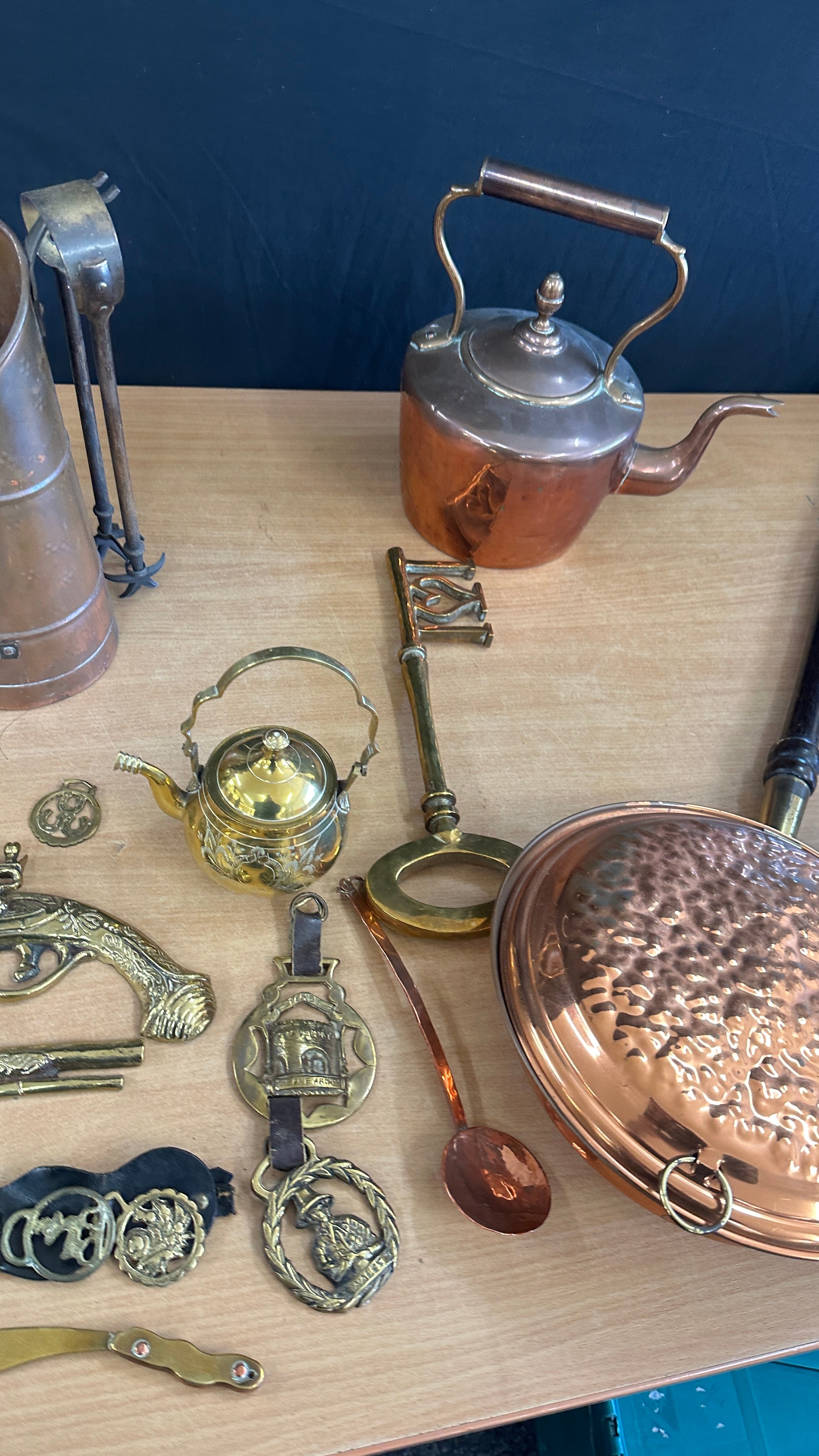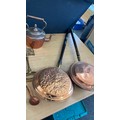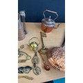 Selection of vintage brass and copper ware to include warming pans, kettles, brass ladies