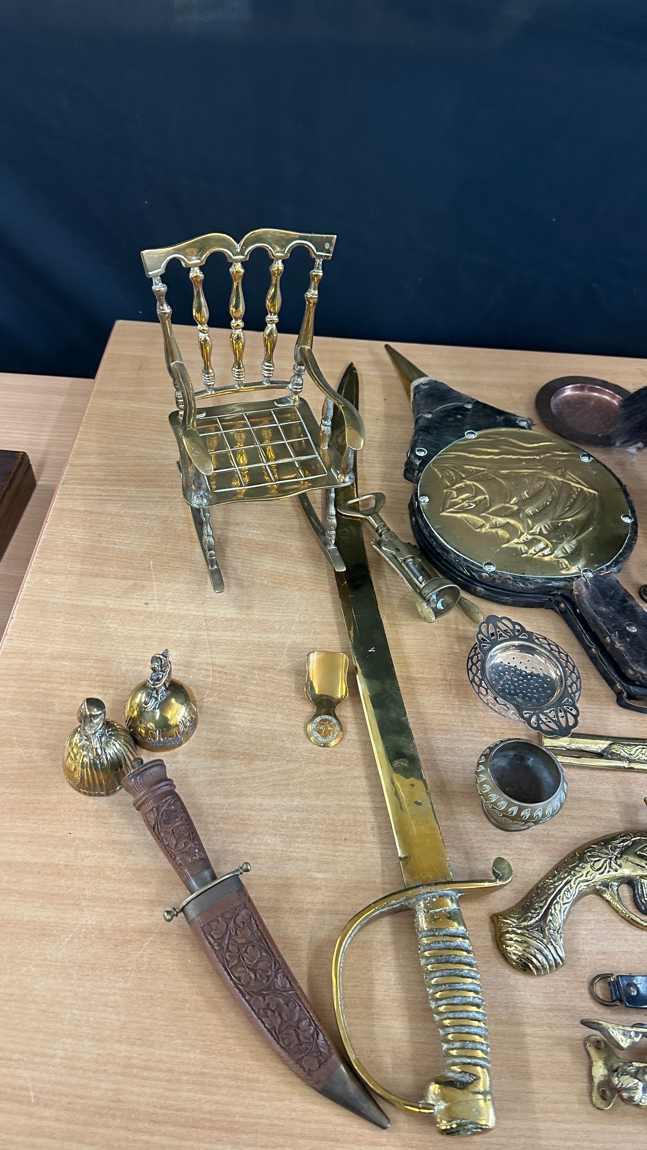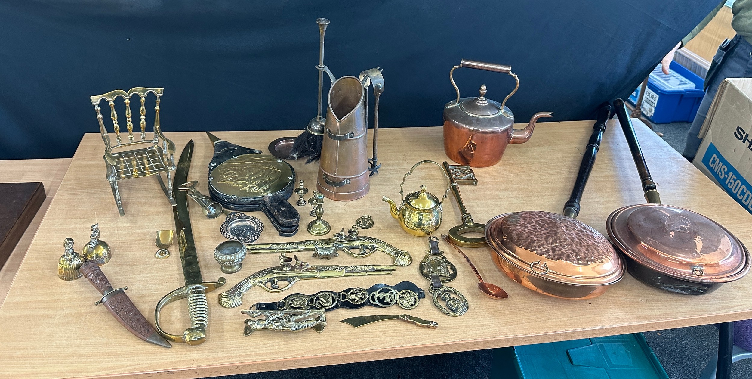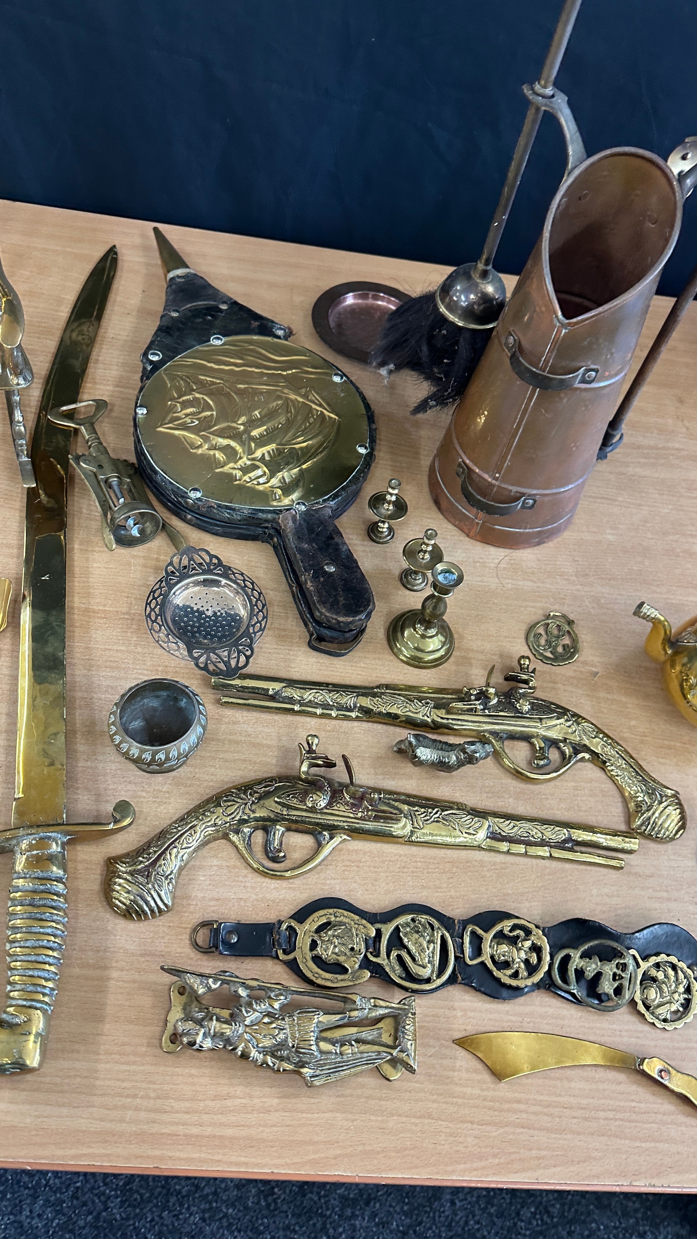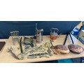 Selection of vintage brass and copper ware to include warming pans, kettles, brass ladies