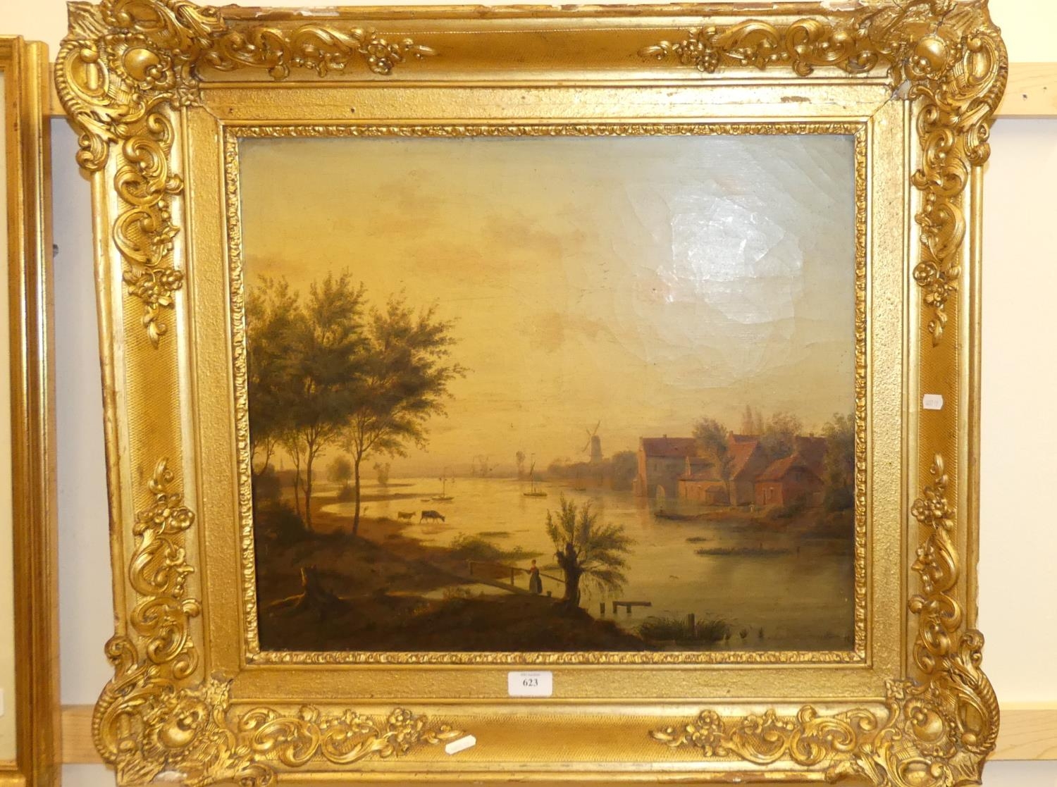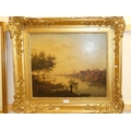 Antique Oil on Board Signed J. Van. Houtum 184?, River Landscape with Buildings and Figures, measuring approx 52 x 44cm.