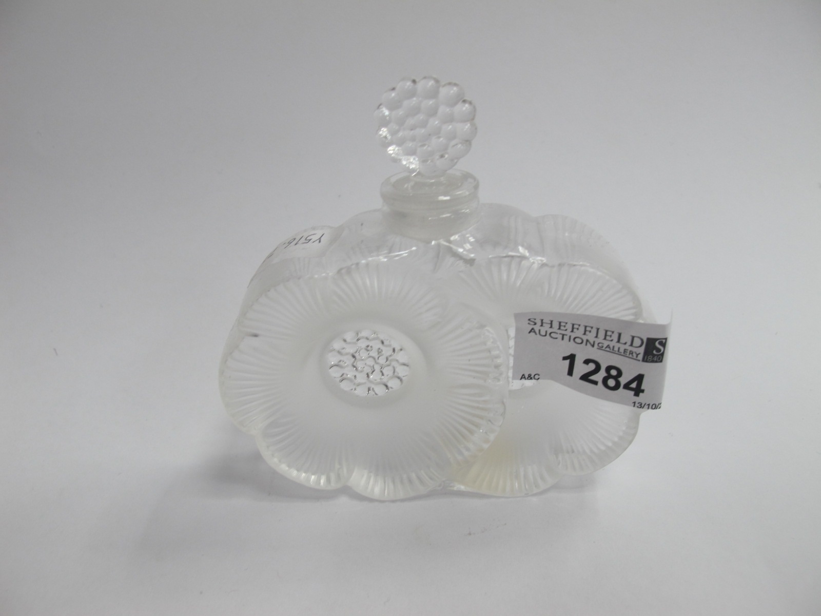Lalique Deux Fleurs Scent Bottle, with frosted flowers, etched signature under base, with stopper, 9.5cm wide.