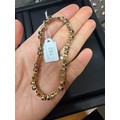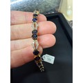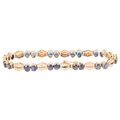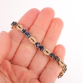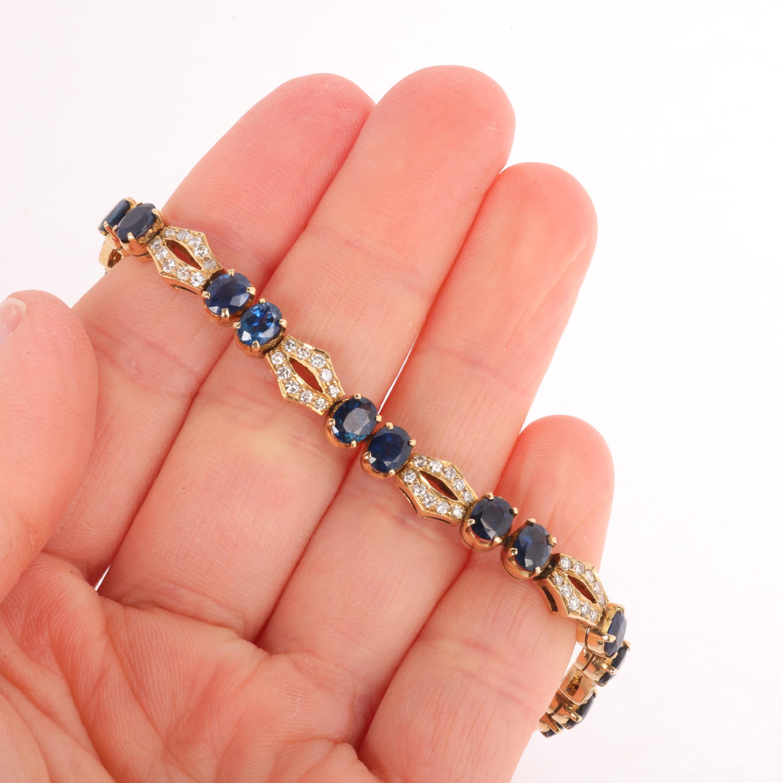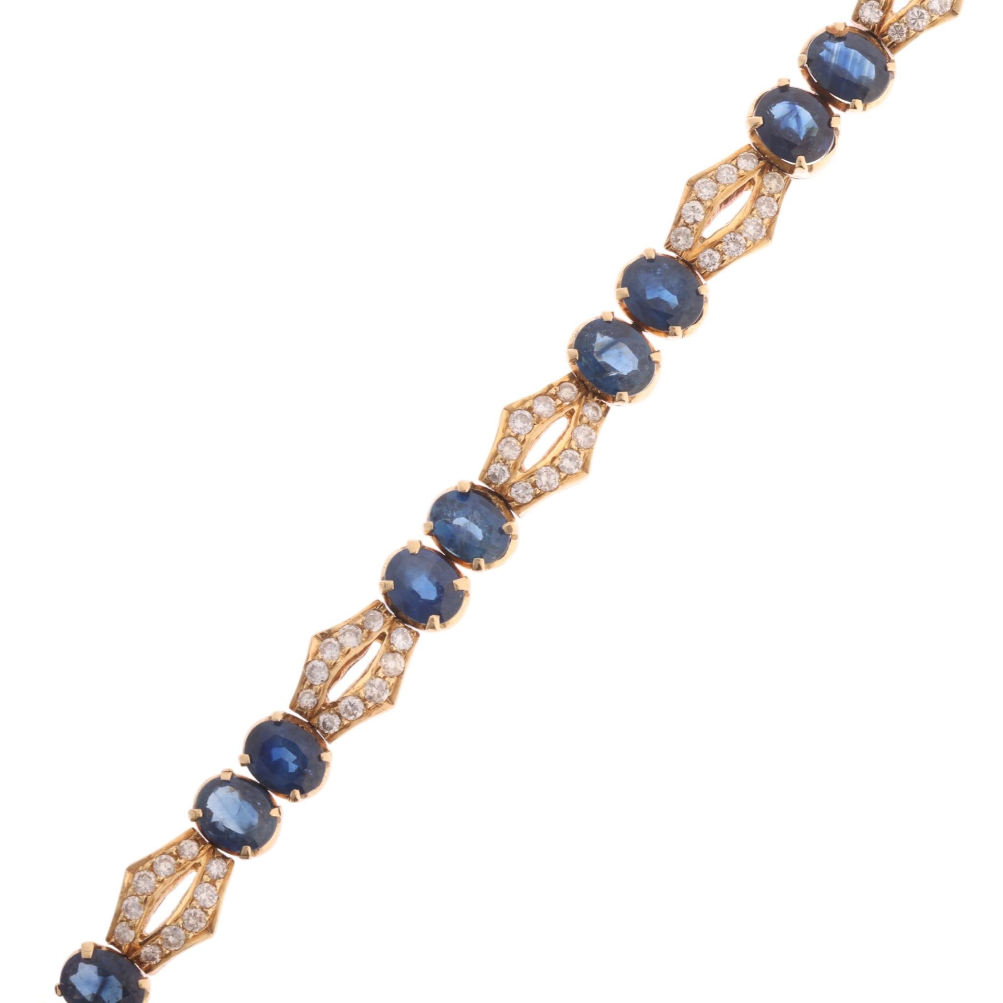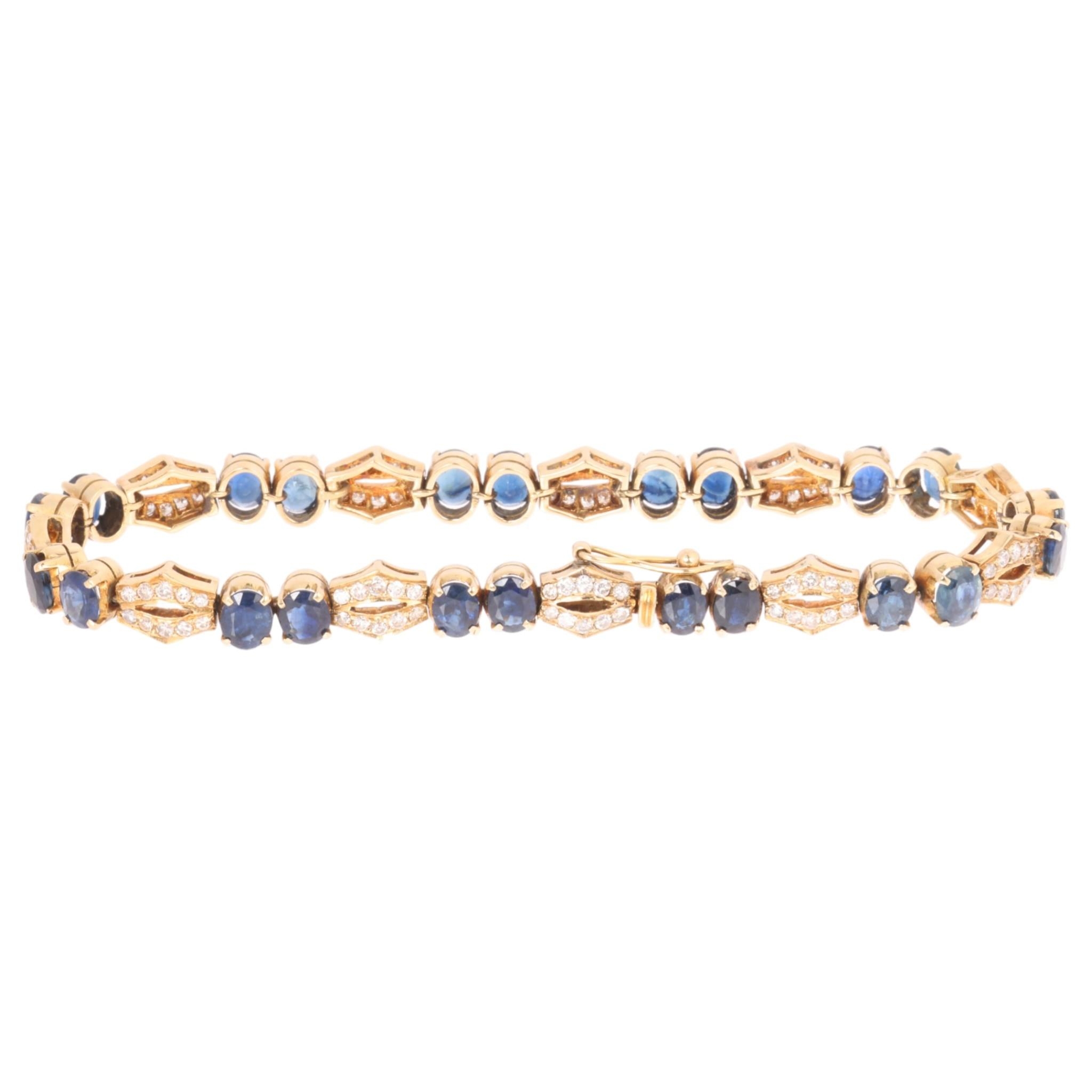 A Contemporary gold sapphire and diamond line bracelet, claw set with pairs of oval mixed-cut sapphires and pave set modern round brilliant-cut diamond geometric spacer links, unmarked but tests as 16ct gold, band width 6.5mm, 19cm, 17.9g
