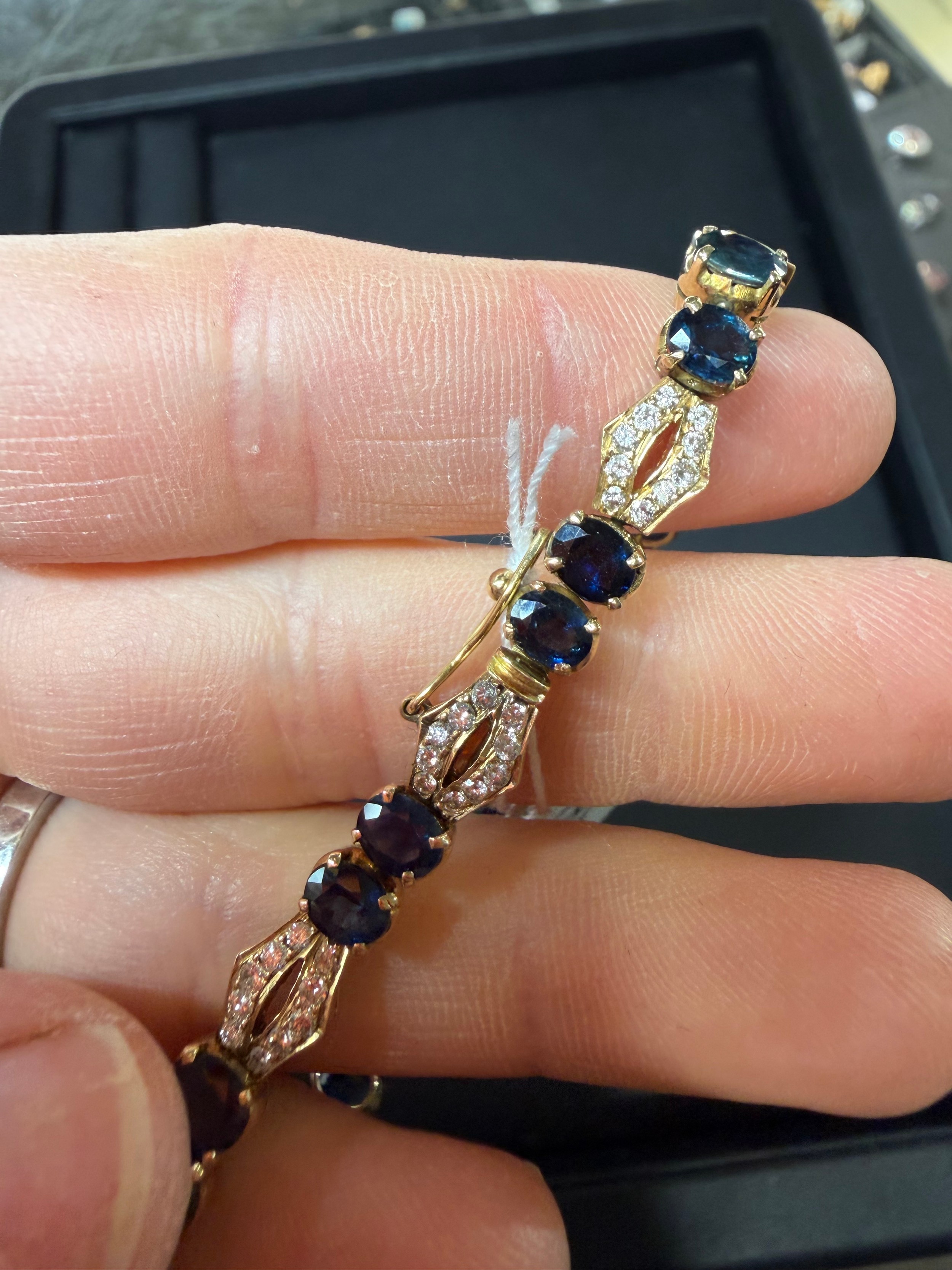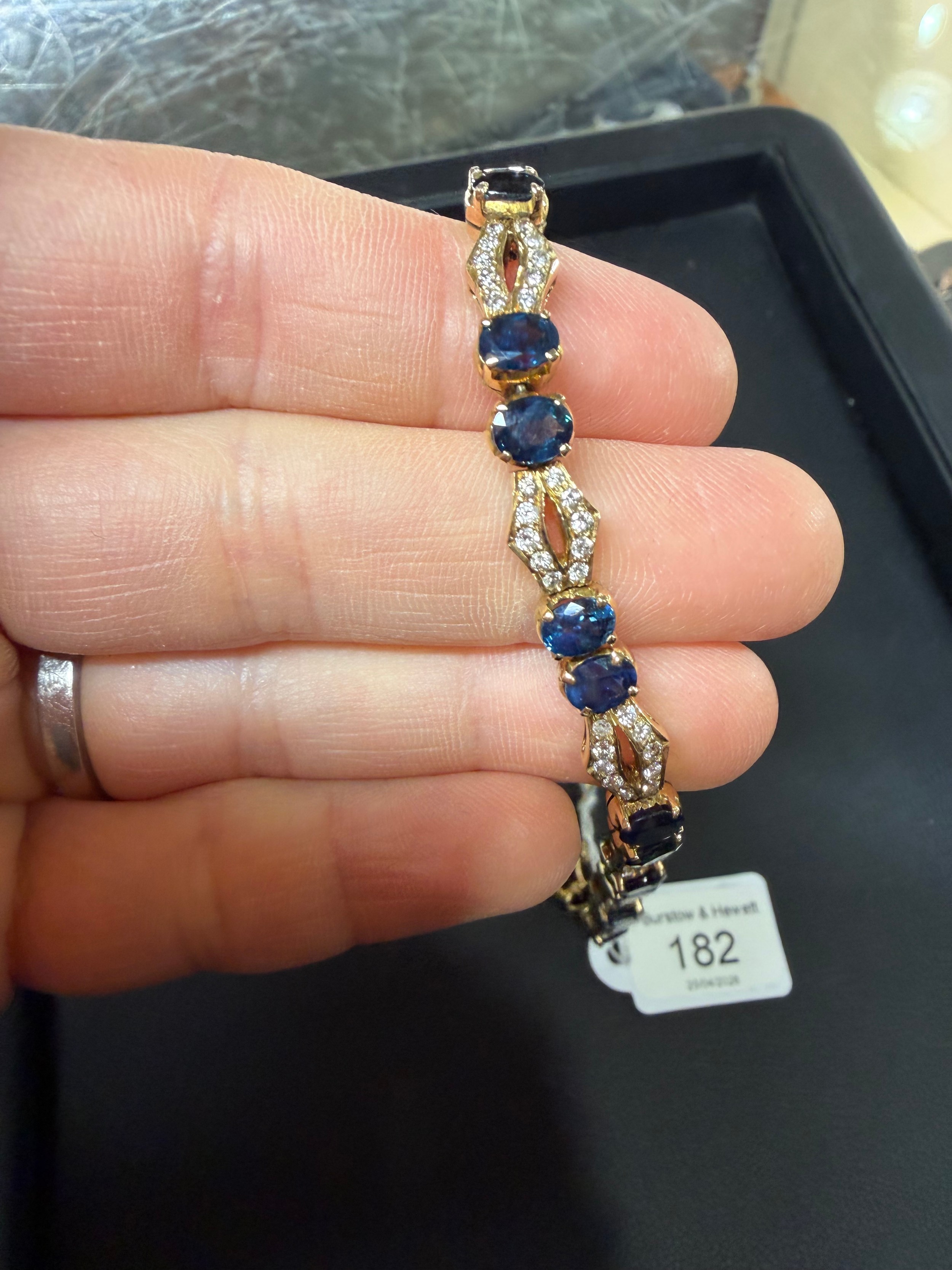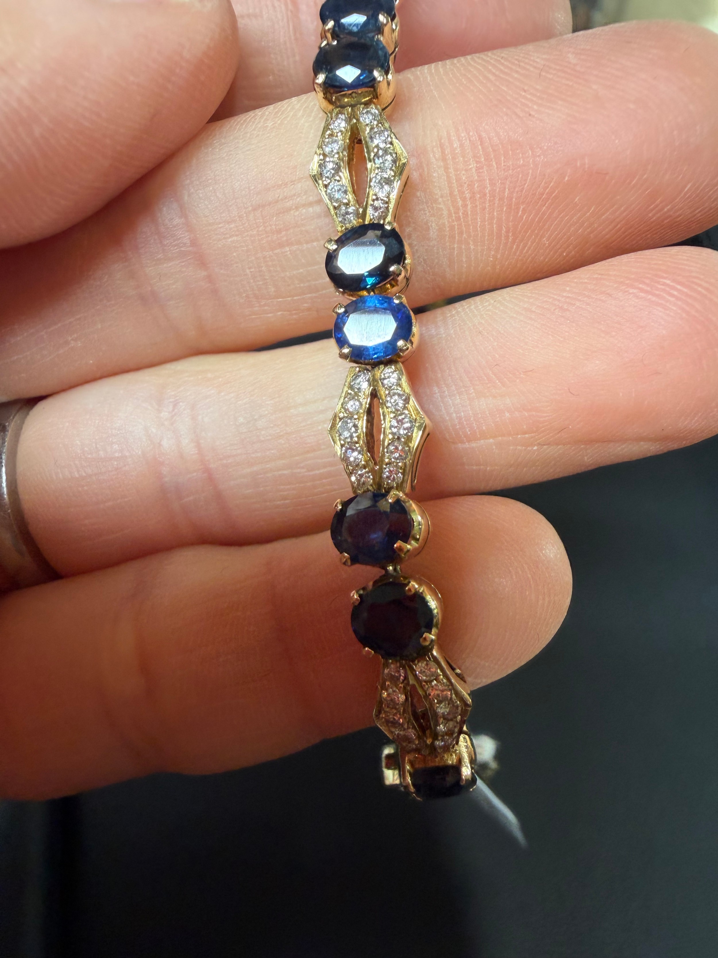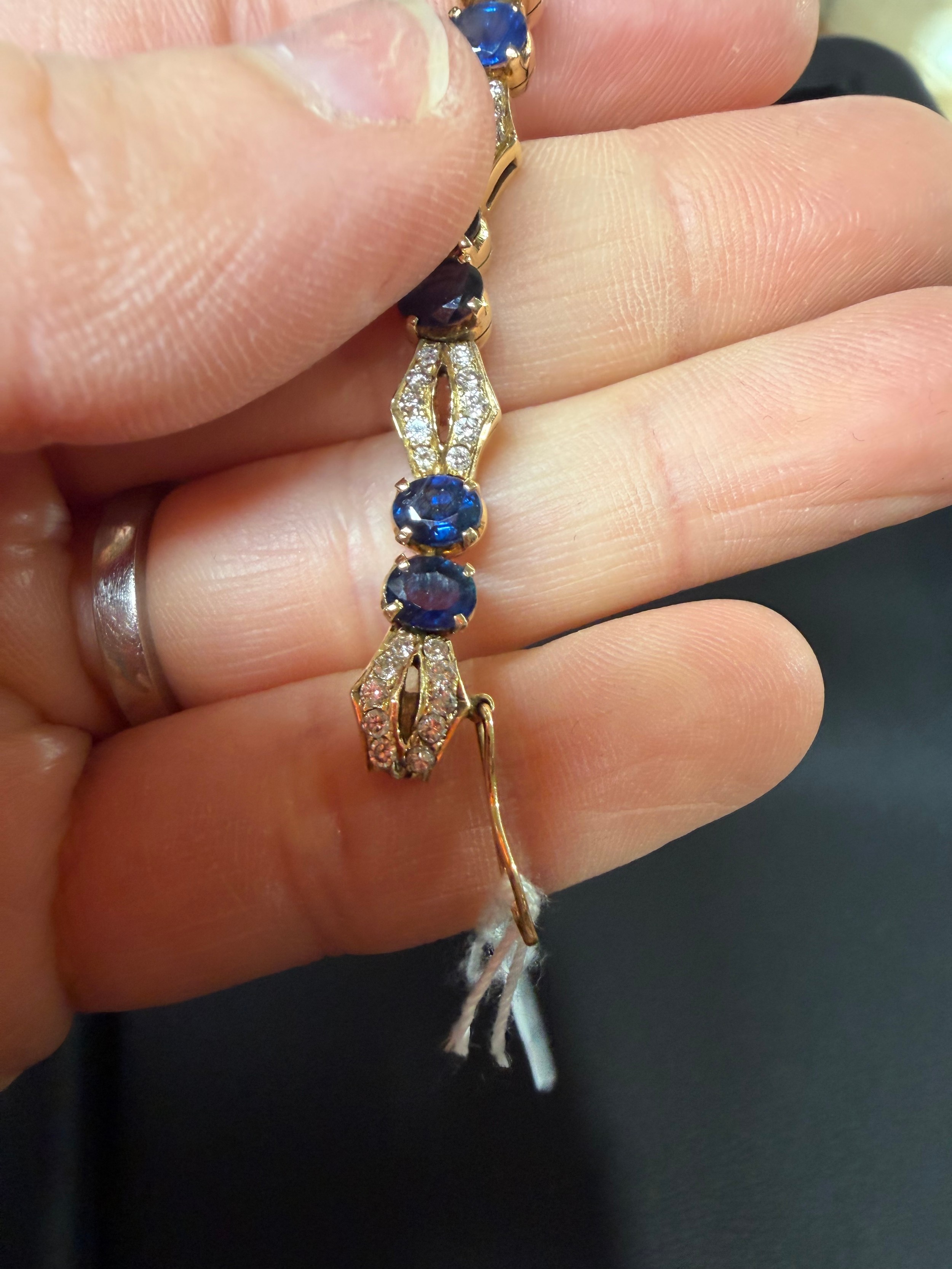 No damage or repair, all stones present, sapphires are a dark blue, diamonds very bright and lively, light wear to mount, no broken links, fitting and safety catch working, unmarked