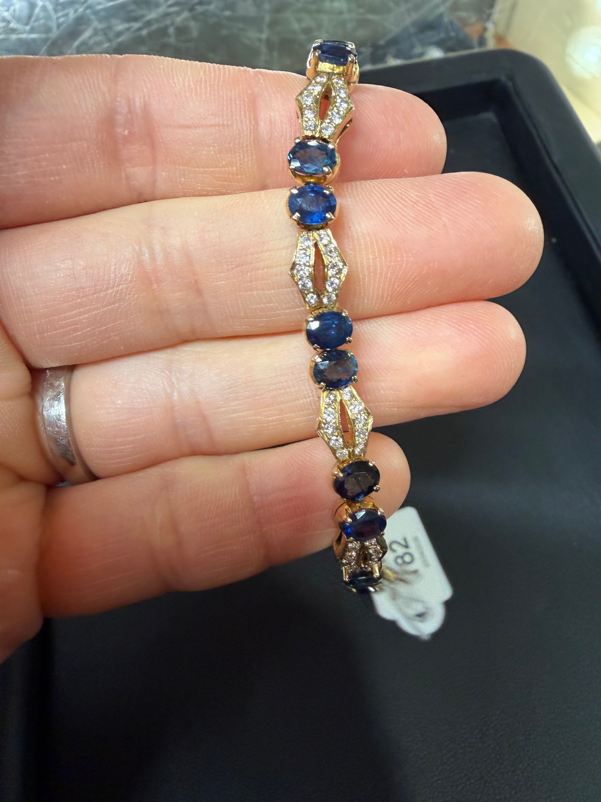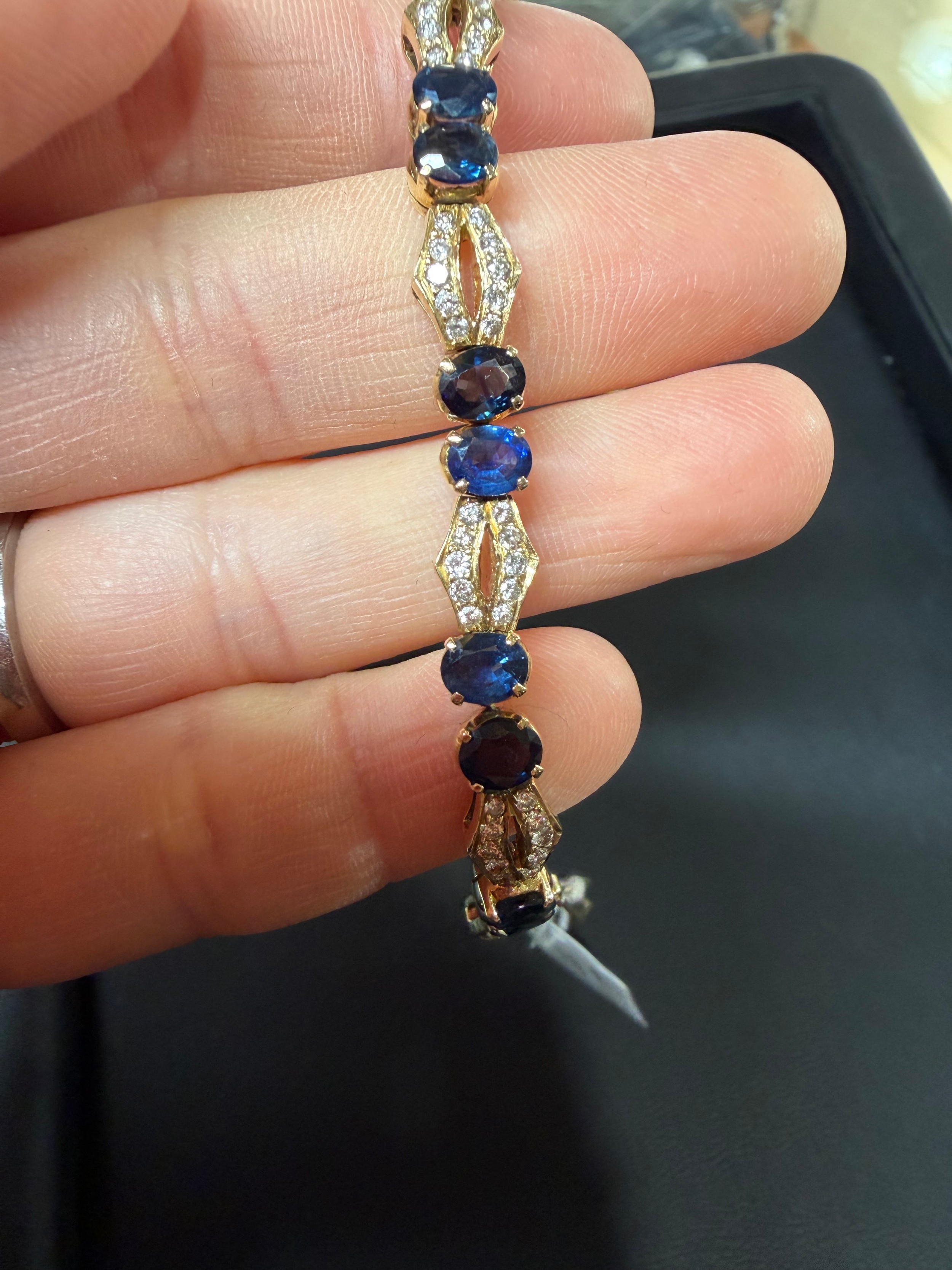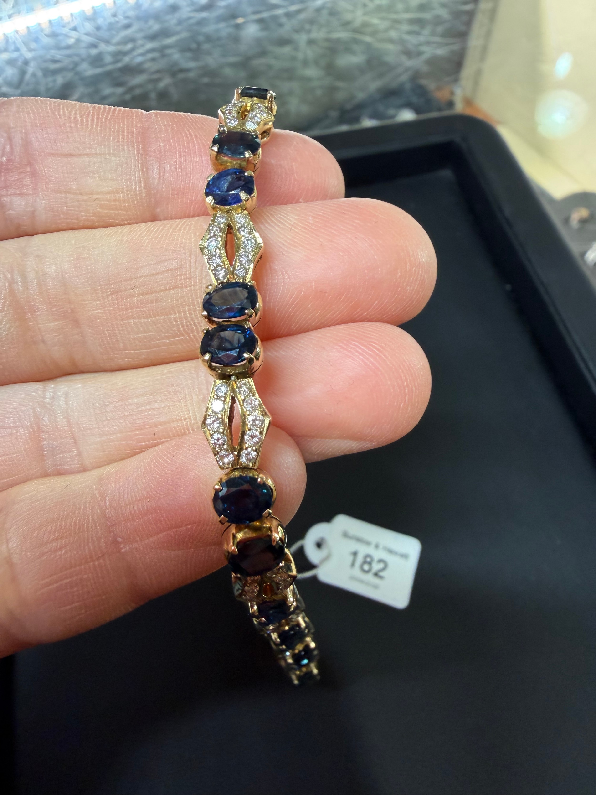 No damage or repair, all stones present, sapphires are a dark blue, diamonds very bright and lively, light wear to mount, no broken links, fitting and safety catch working, unmarked