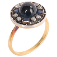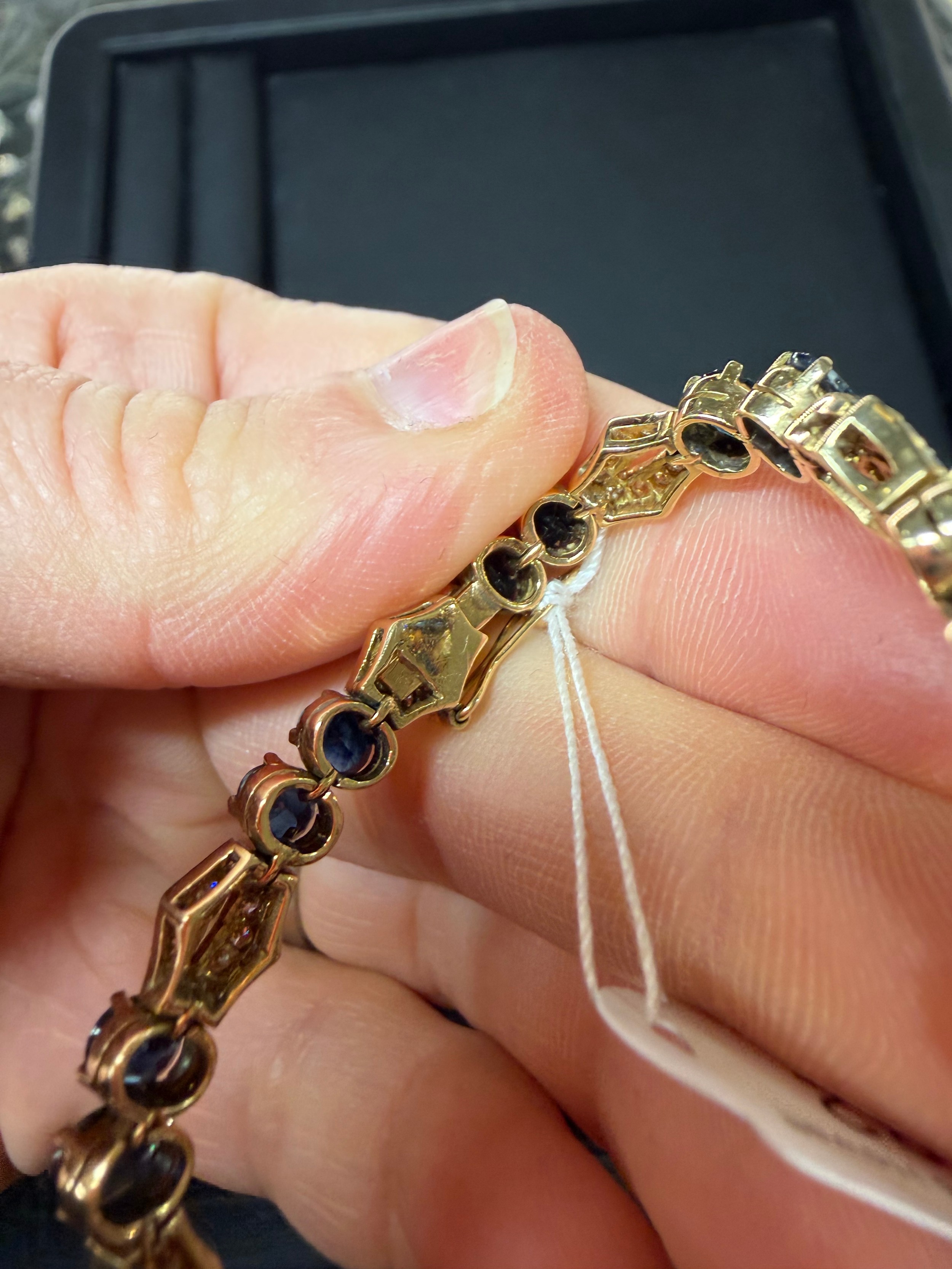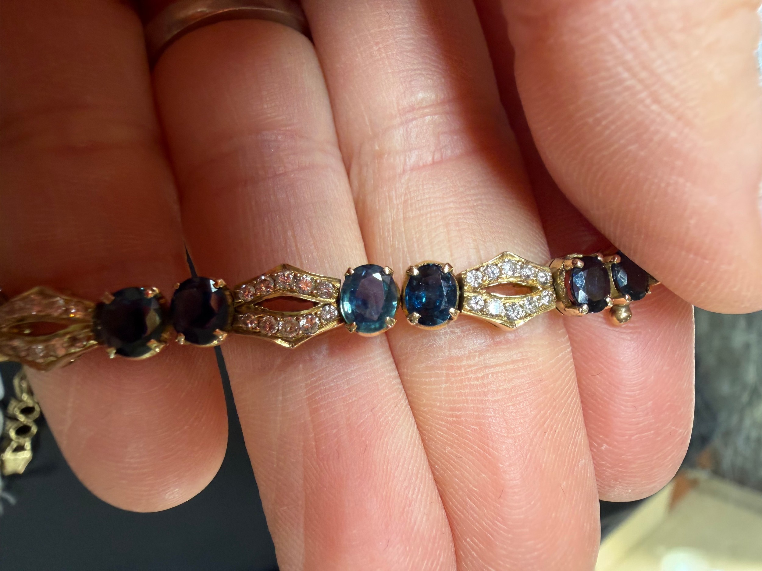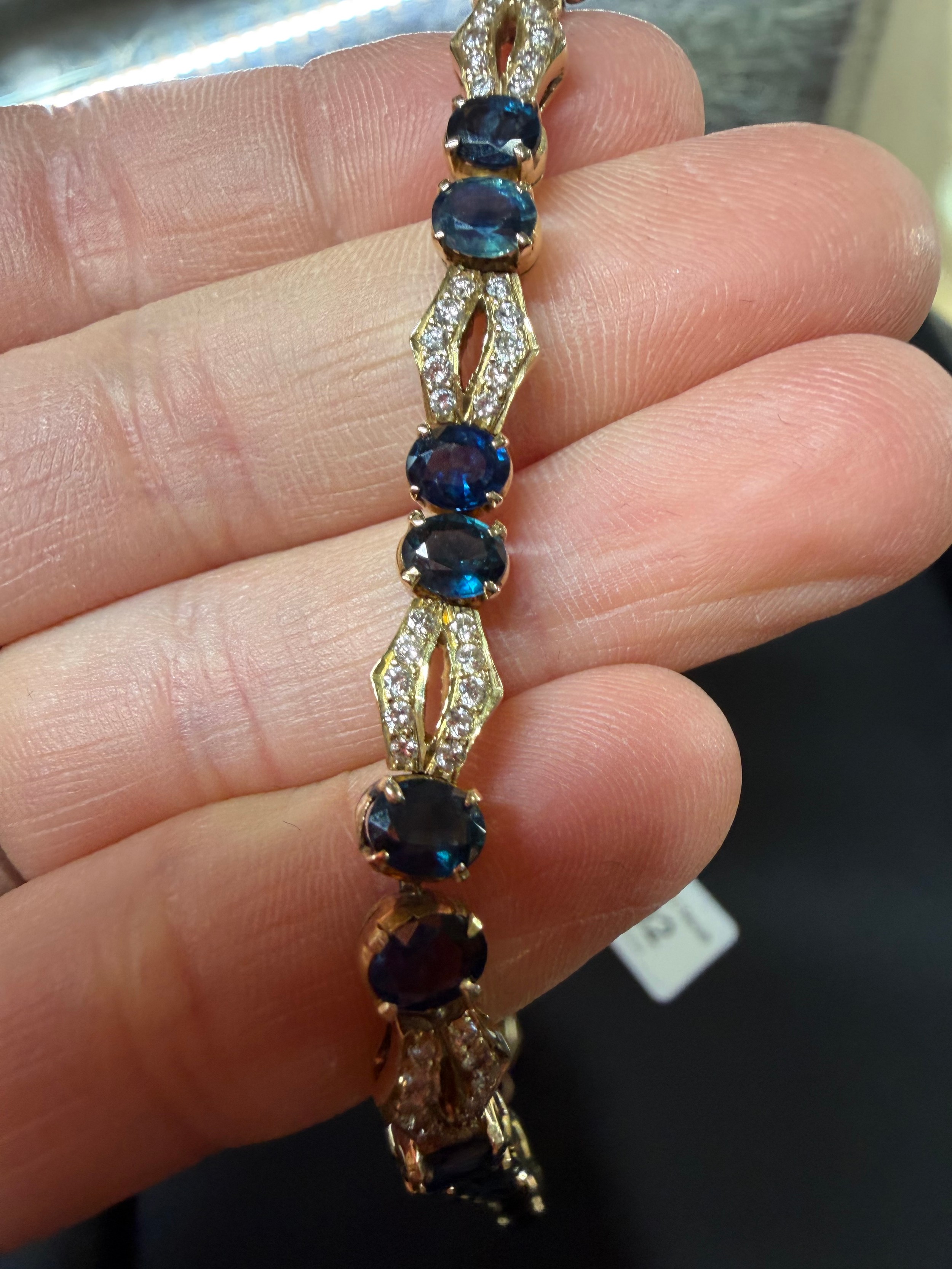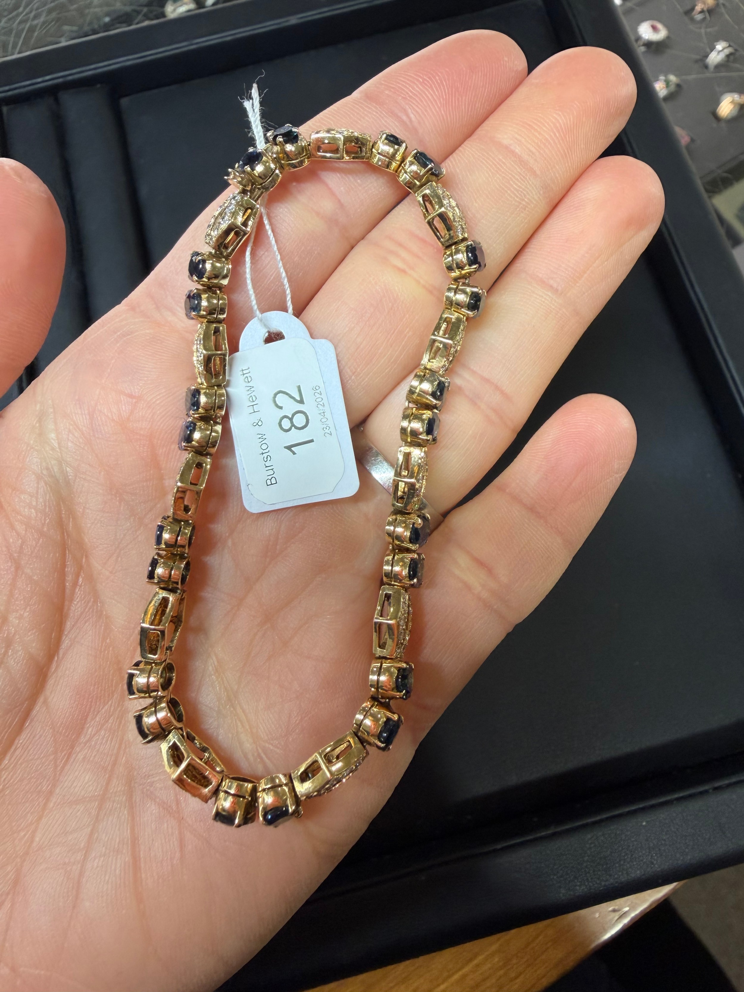 No damage or repair, all stones present, sapphires are a dark blue, diamonds very bright and lively, light wear to mount, no broken links, fitting and safety catch working, unmarked
