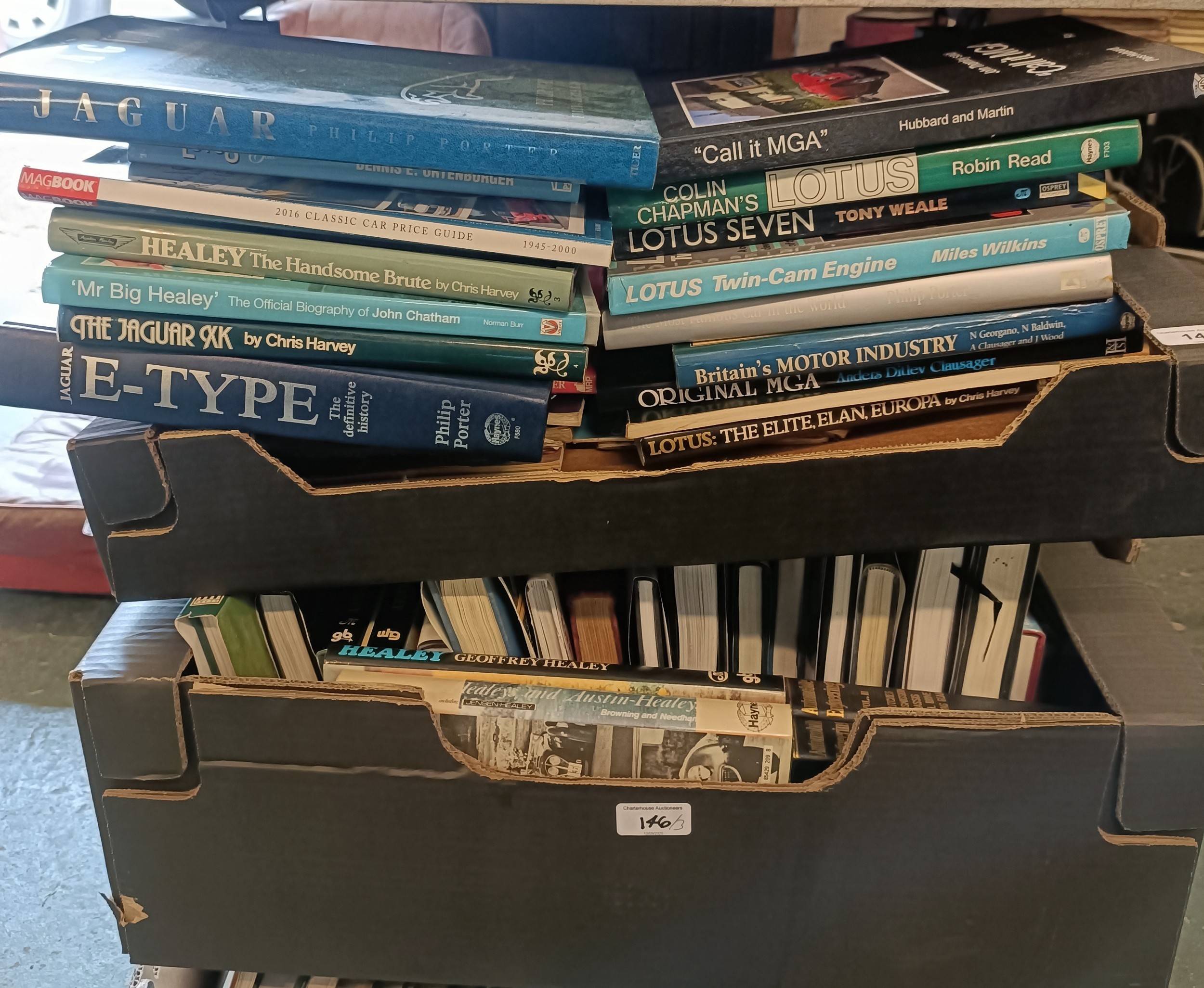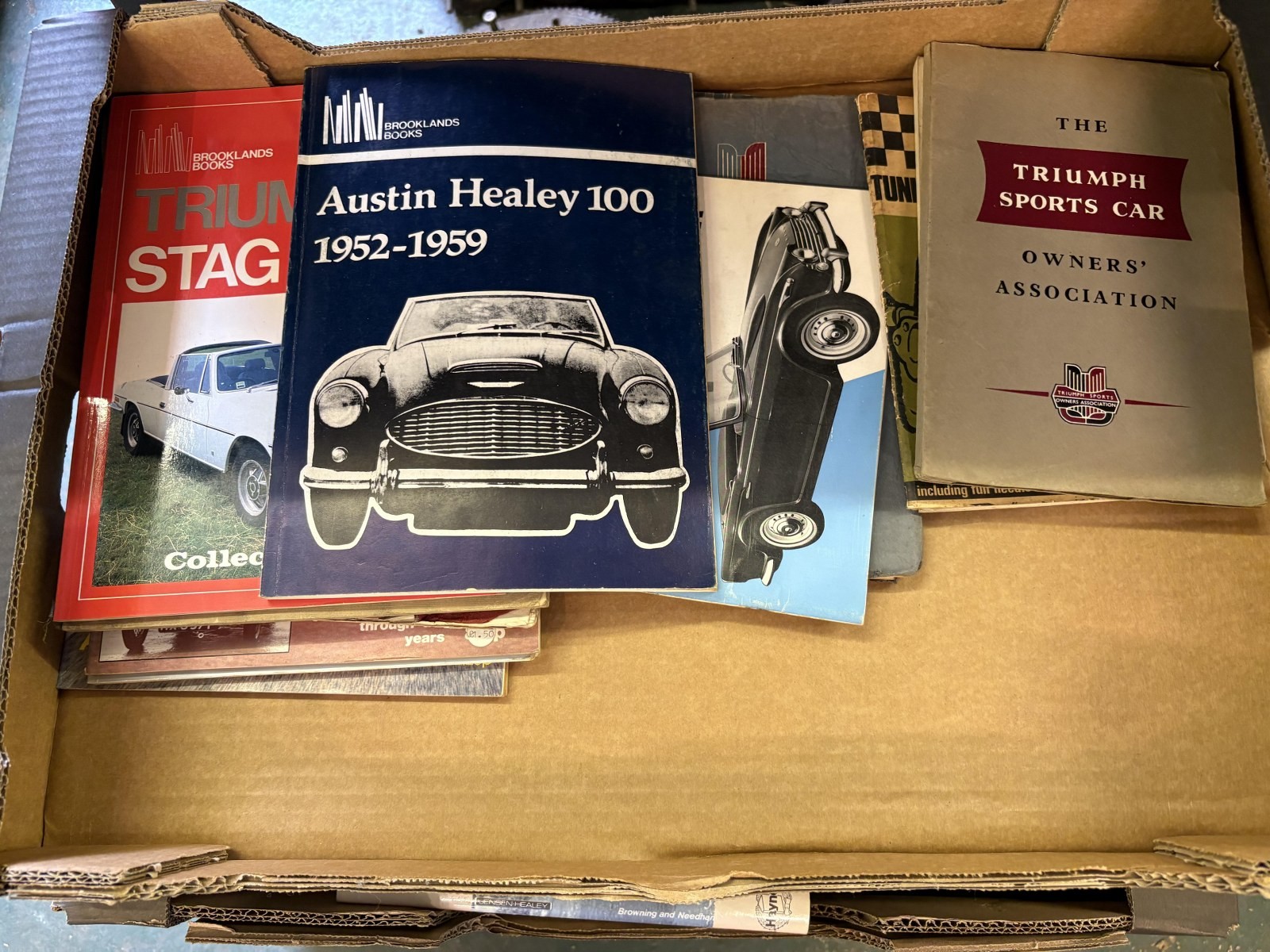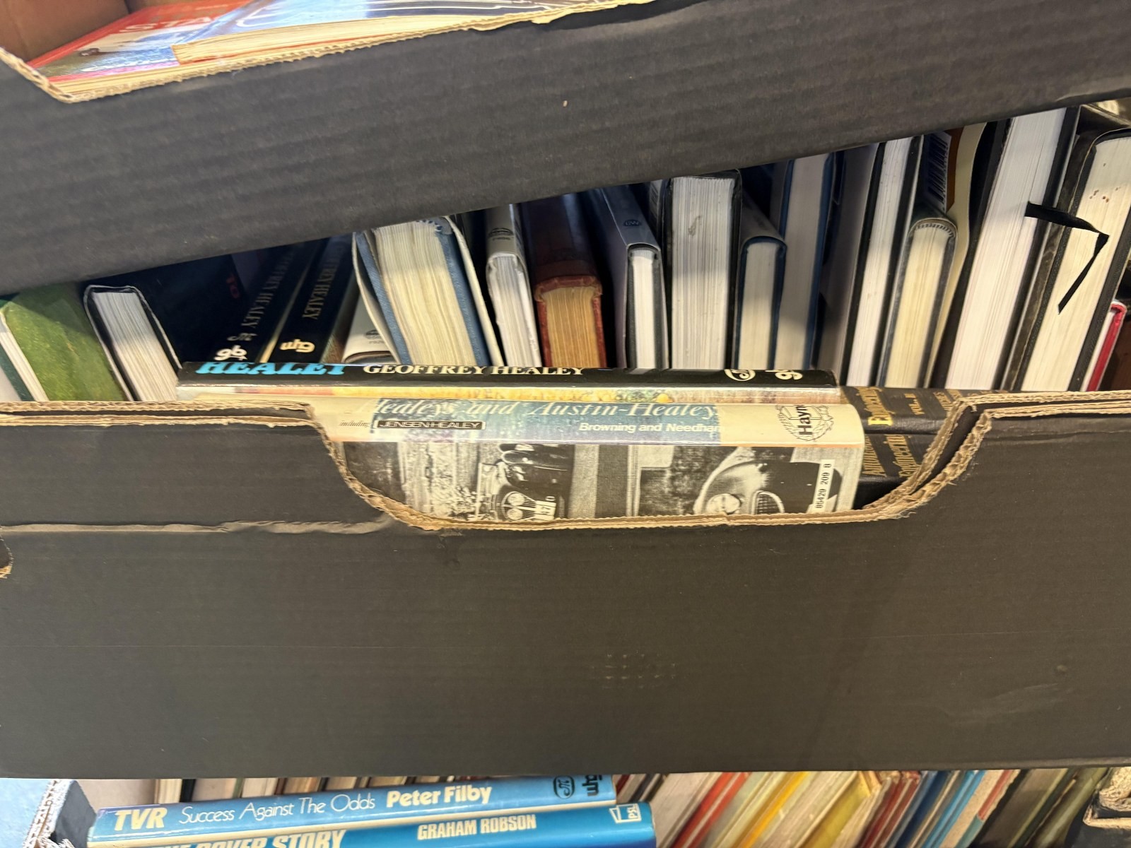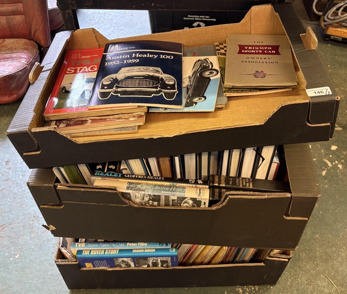 Assorted motoring related books, including Healey's, Lotus, Rover, and others, (3 boxes)
