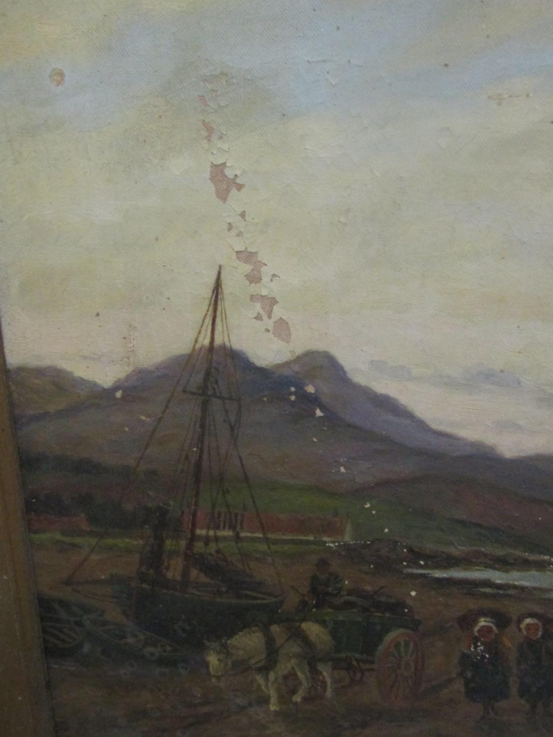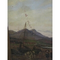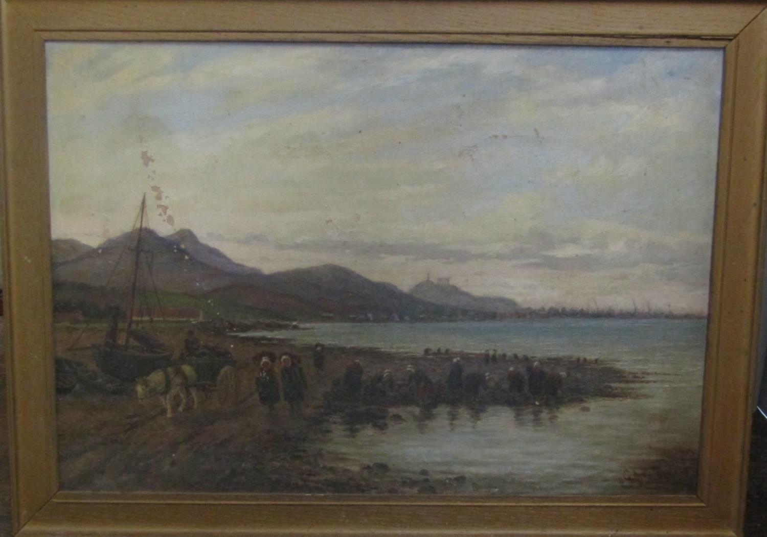 G Aikman (19th century British school) - Scottish coastal landscape with figures gathering seaweed, looking towards Edinburgh and the Calton Hill Monument, oil on canvas, 44.5 x 65cm approx, framed