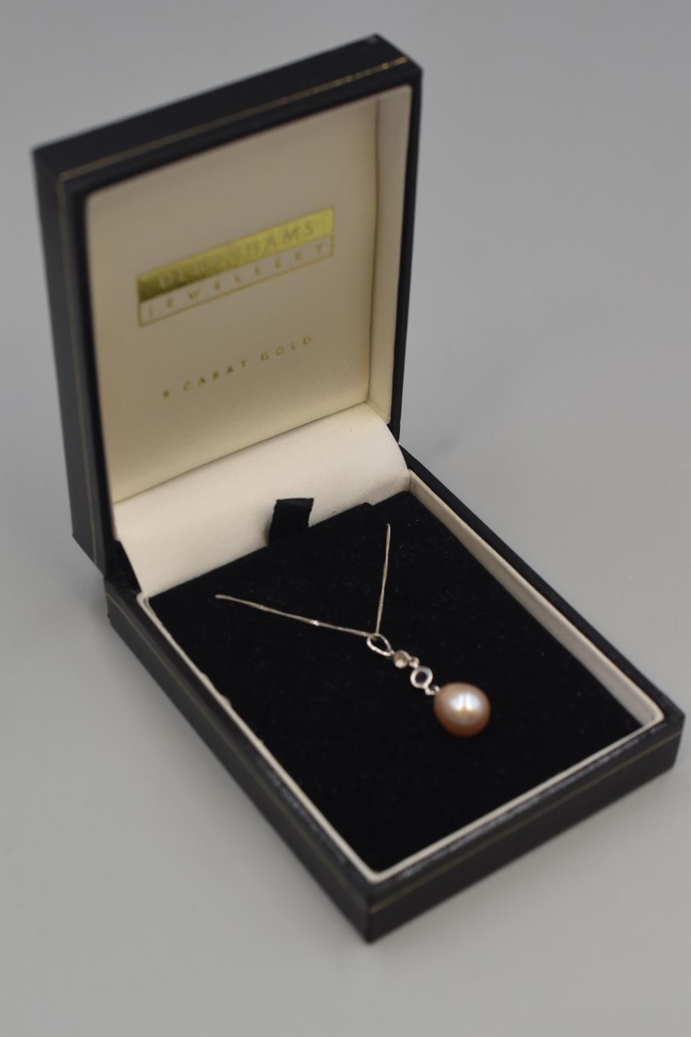 Hallmarked Gold 375 Diamond, Amethyst and Pearl Pendant Necklace Complete with Presentation Case