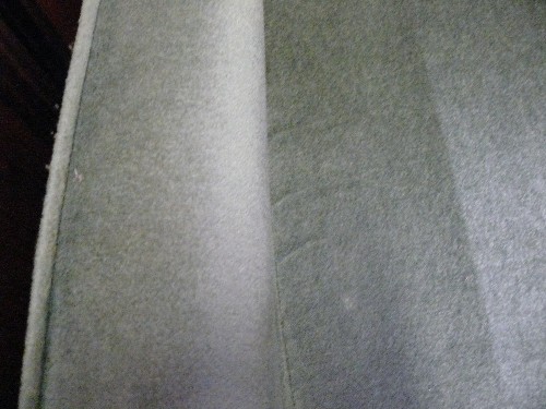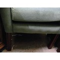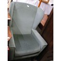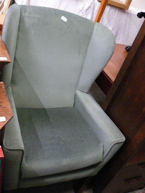 A GREEN WING BACKED ARMCHAIR.