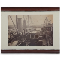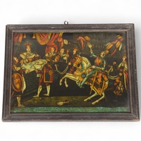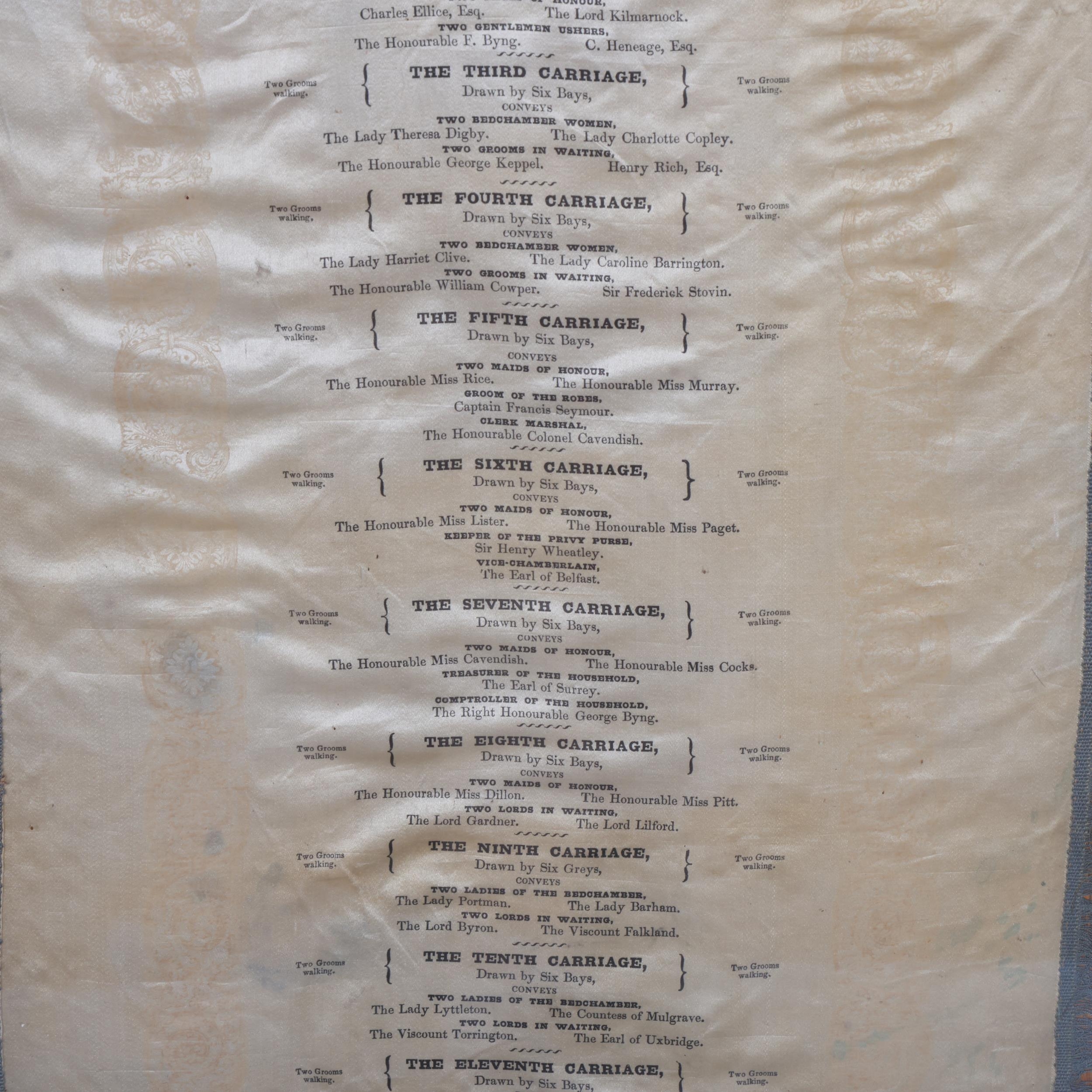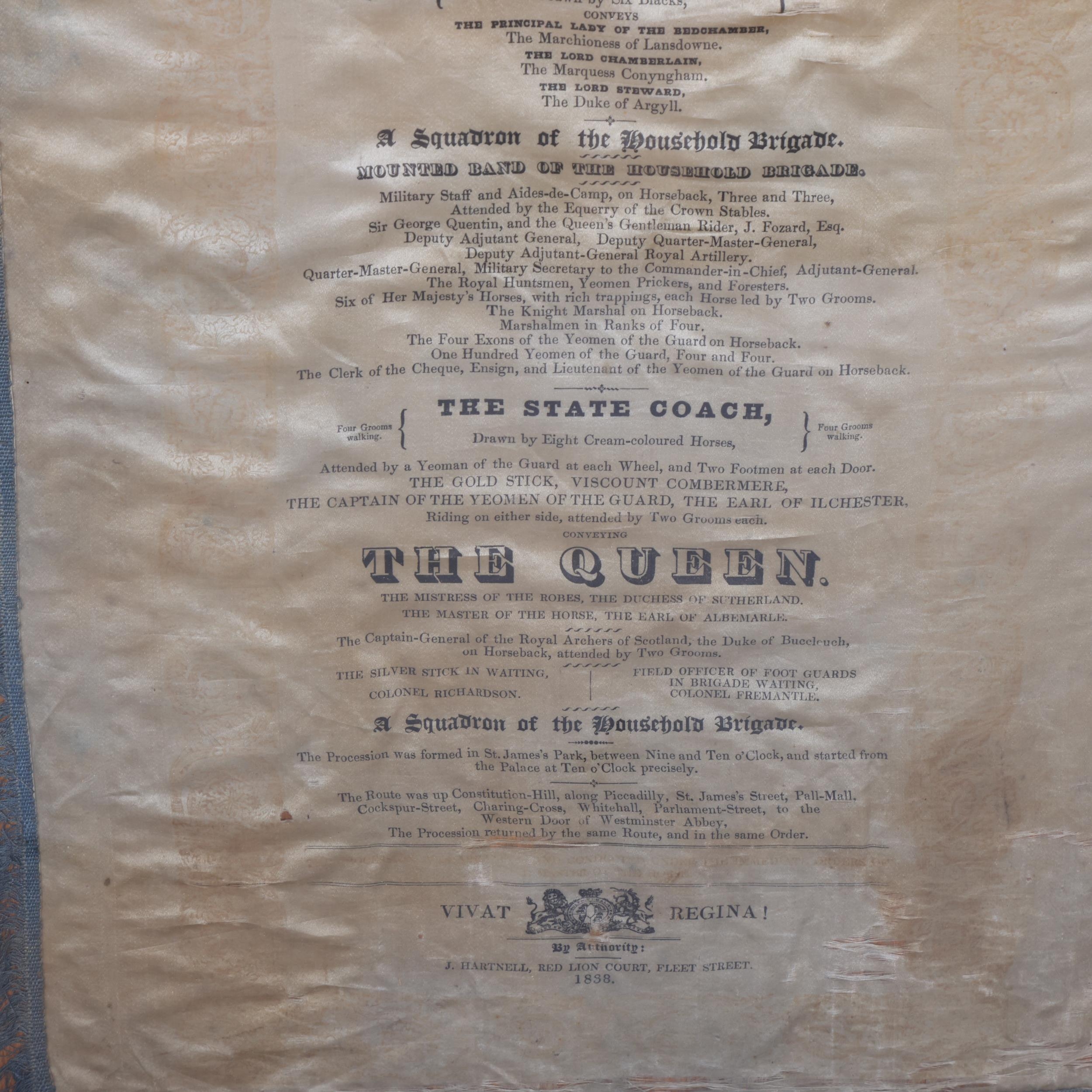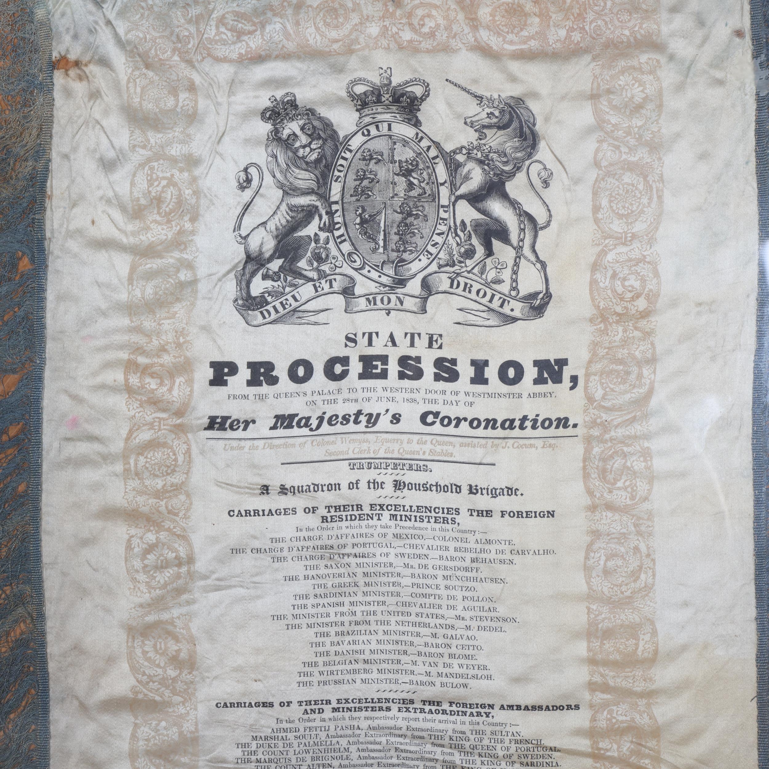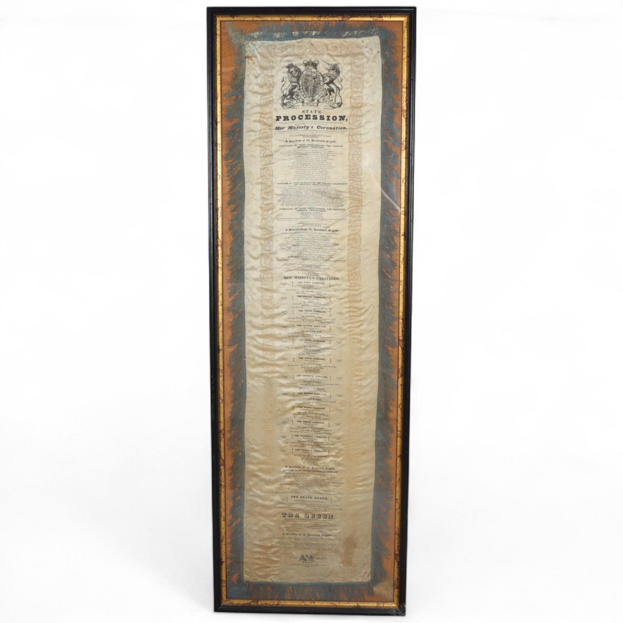 ROYAL INTEREST - The State Procession of Queen Victoria's Coronation, 28th June 1838, printed silk scroll with blue silk fringe, framed, overall frame dimensions 148cm x 48cm