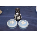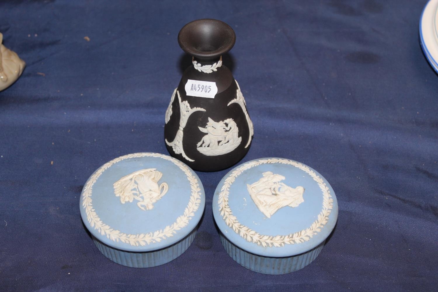 Pair of jasperware lidded trinket boxes and a Wedgwood basalt vase.