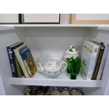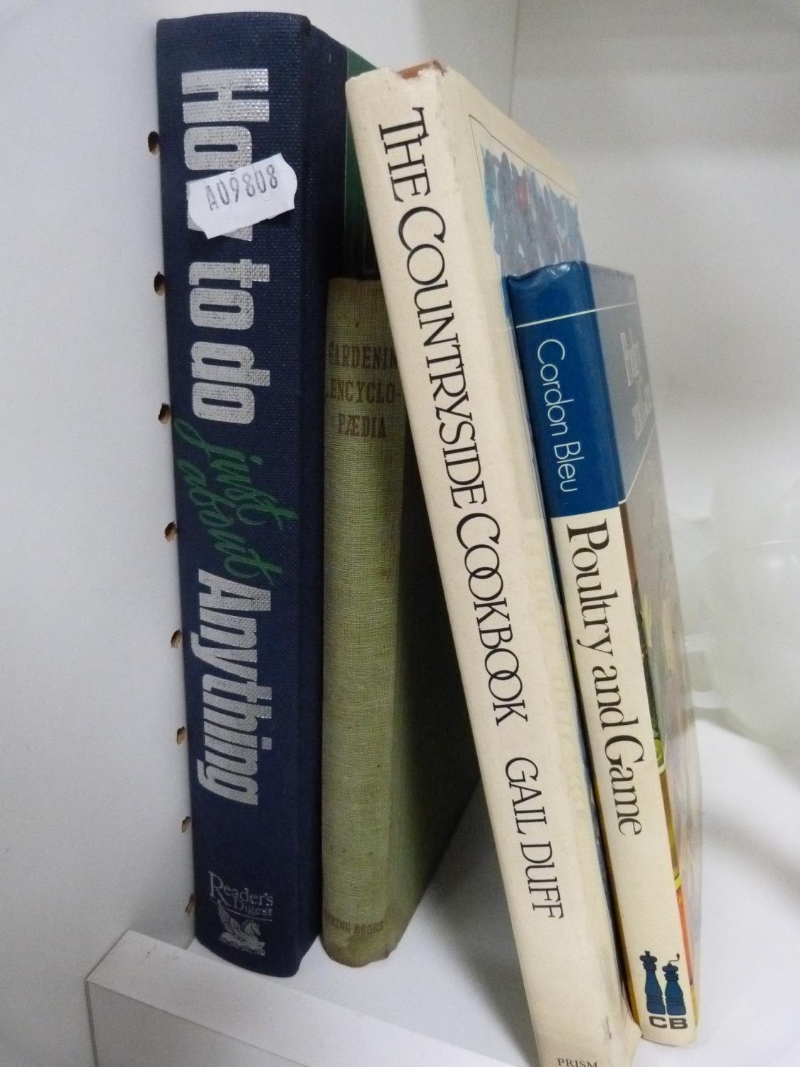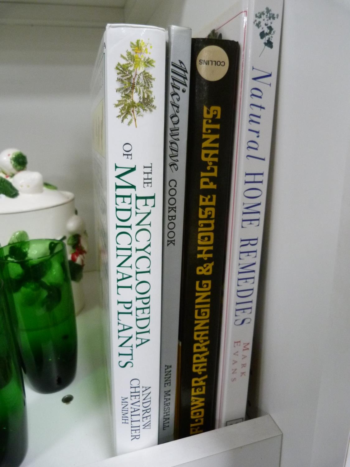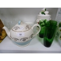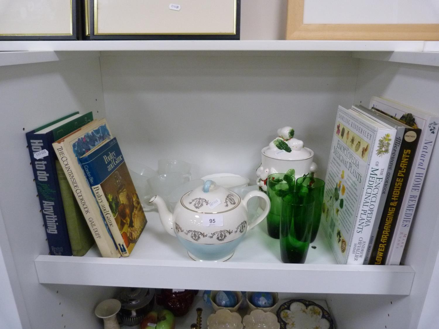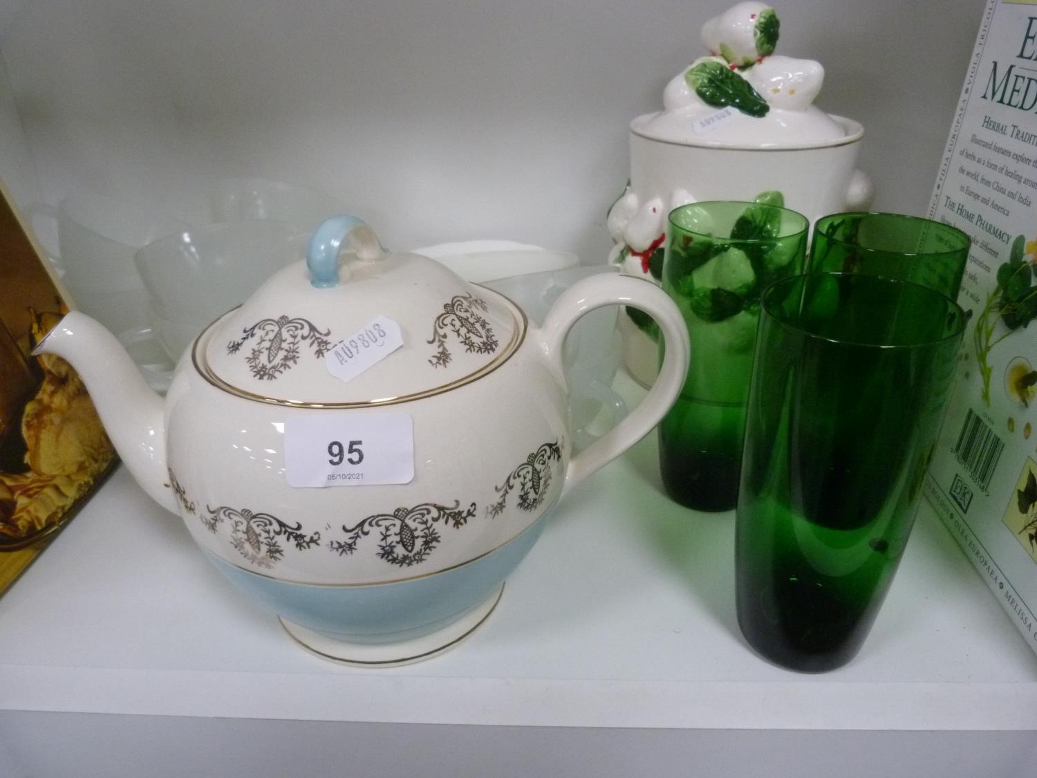 Cookery books, frosted glass cups and saucers, green glass tumblers, biscuit box and cover, Grindley teapot etc.