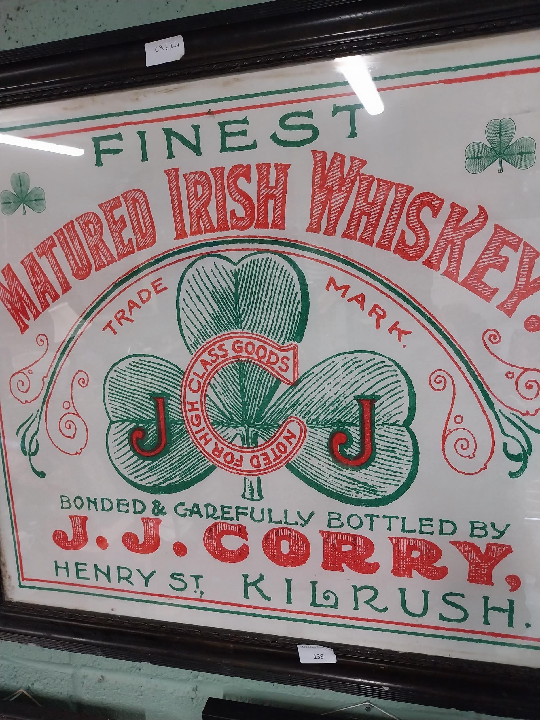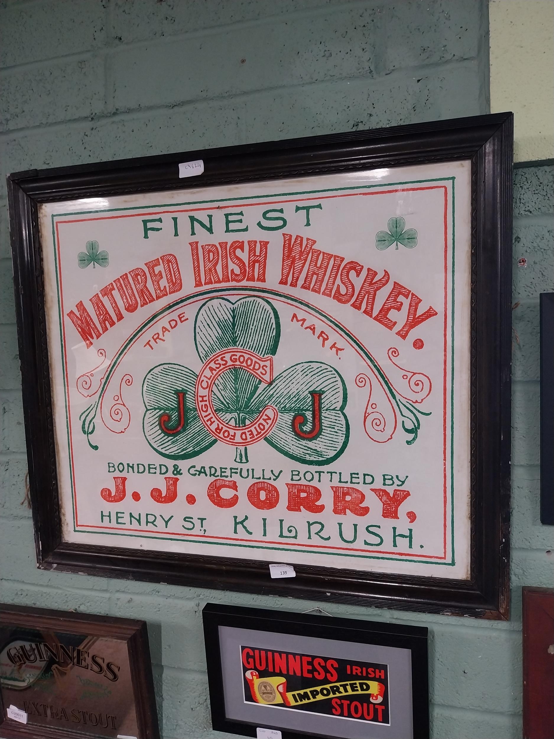 Finest Matured Irish Whiskey JJ Corby Henry Street Kilrush framed advertising print. {65 cm H x 75 cm W}.