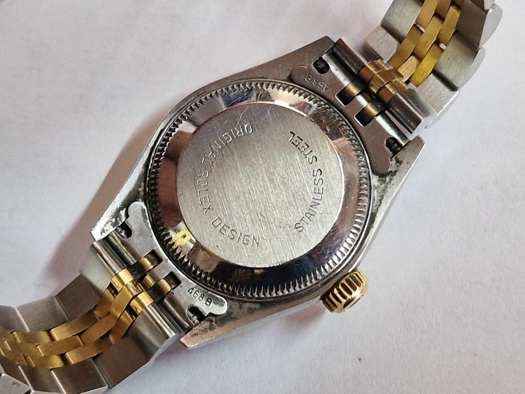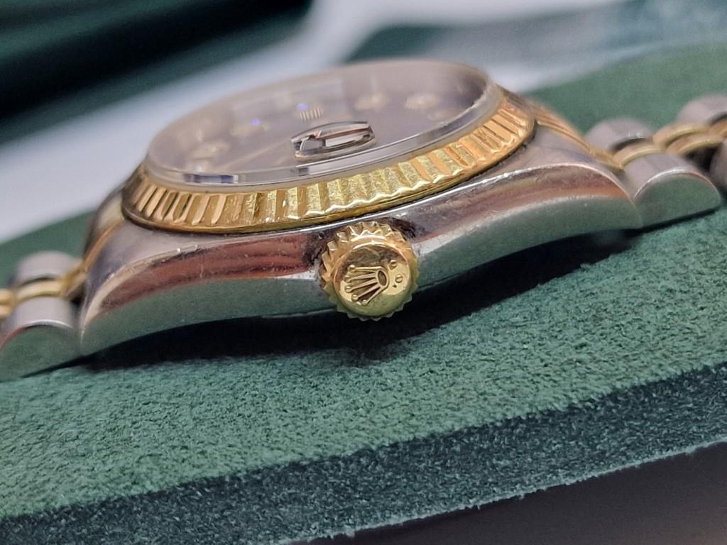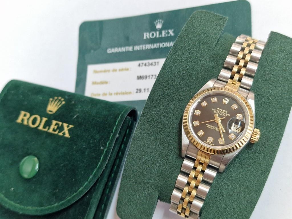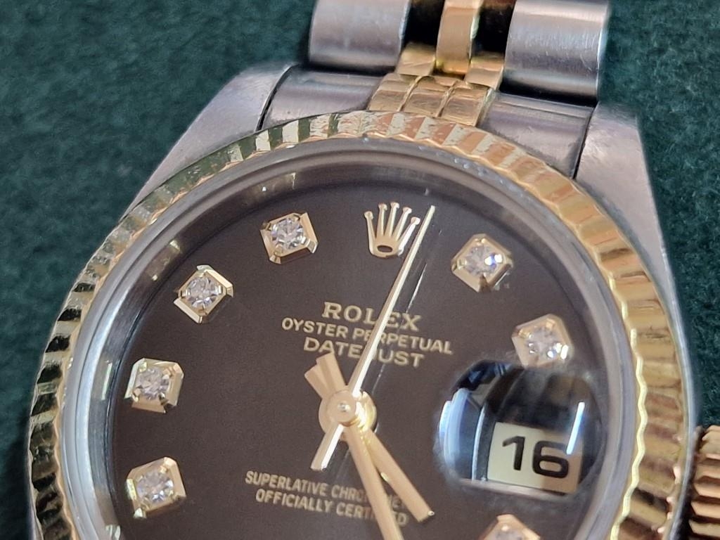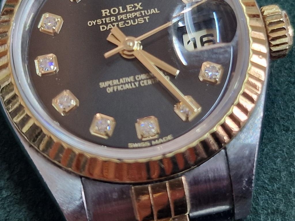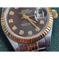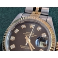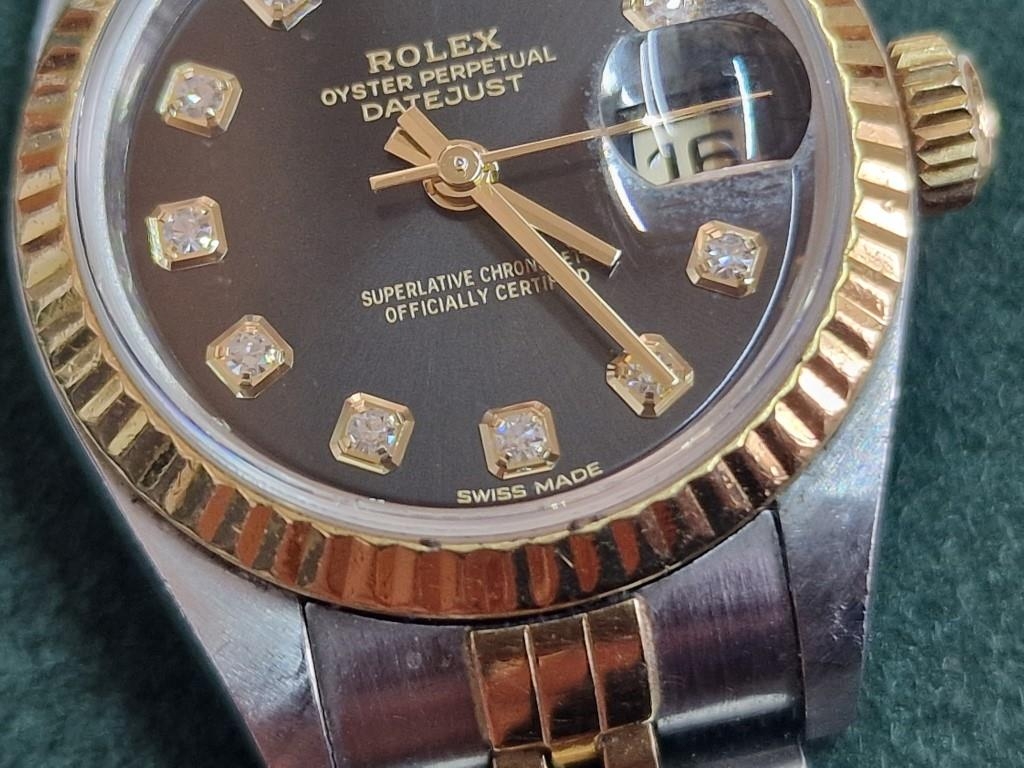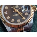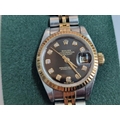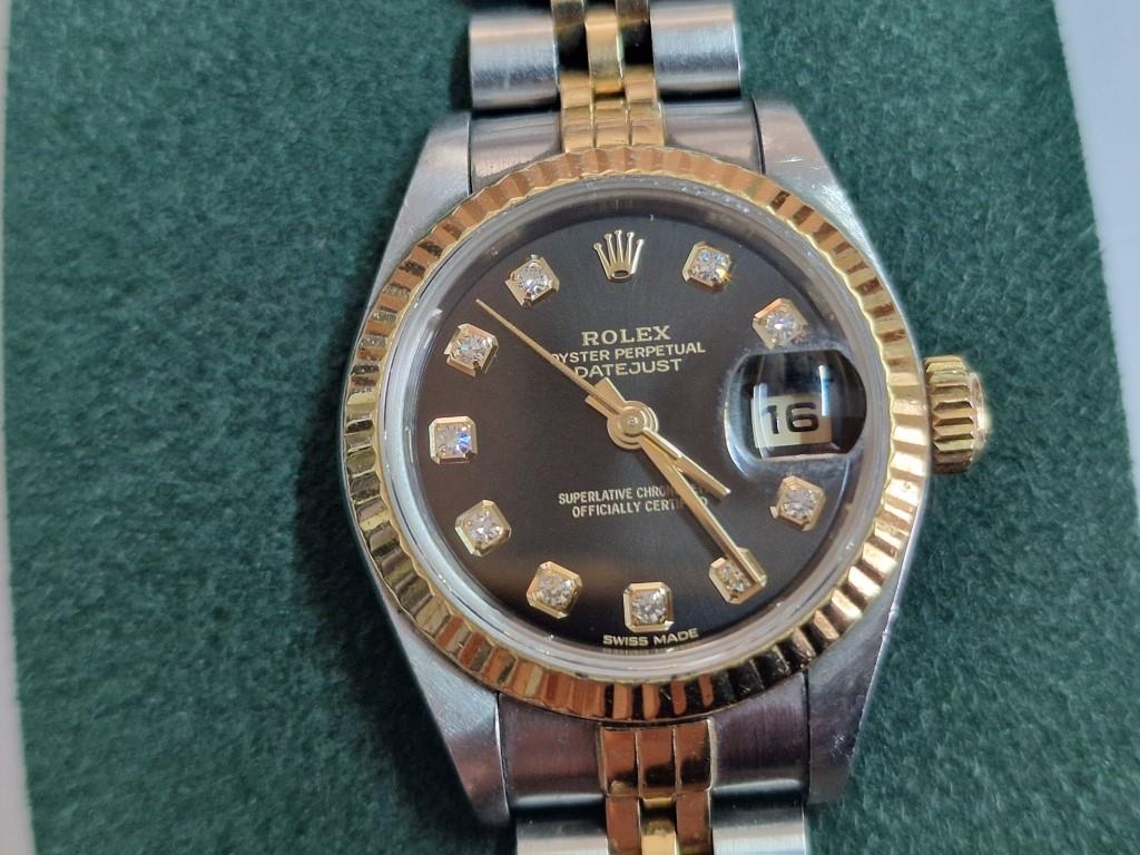 Ladies ROLEX Oyster Perpetual Datejust, with Diamond Hour Markers on Black Face, Date, (Model: 69173), Automatic, Swiss Made, 25mm Stainless Steel Case with Gold Bezel on Two-Tone Bracelet Strap, Serial Number 474XXXX (Circa 1976), Together with Rolex Service Guarantee Card Dated Nov 2021 and Rolex Green Felt Pouch, * Running When Lotted *