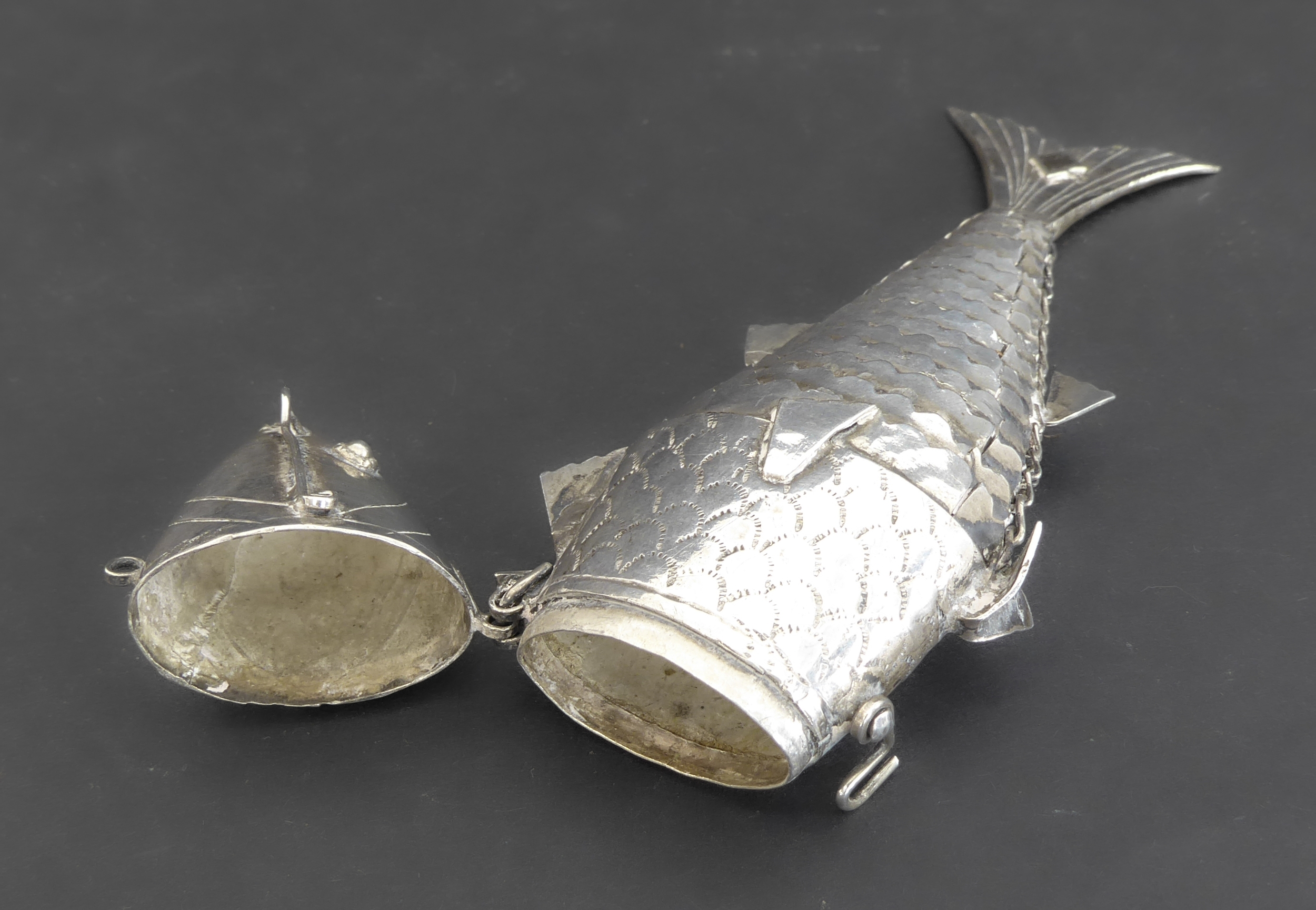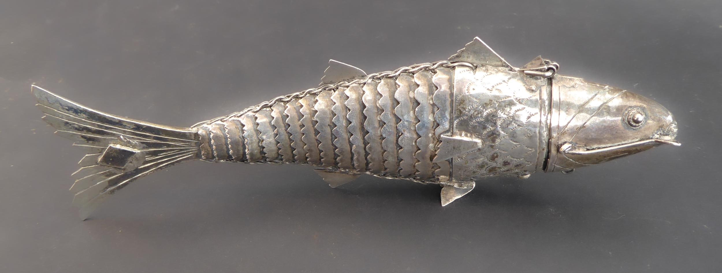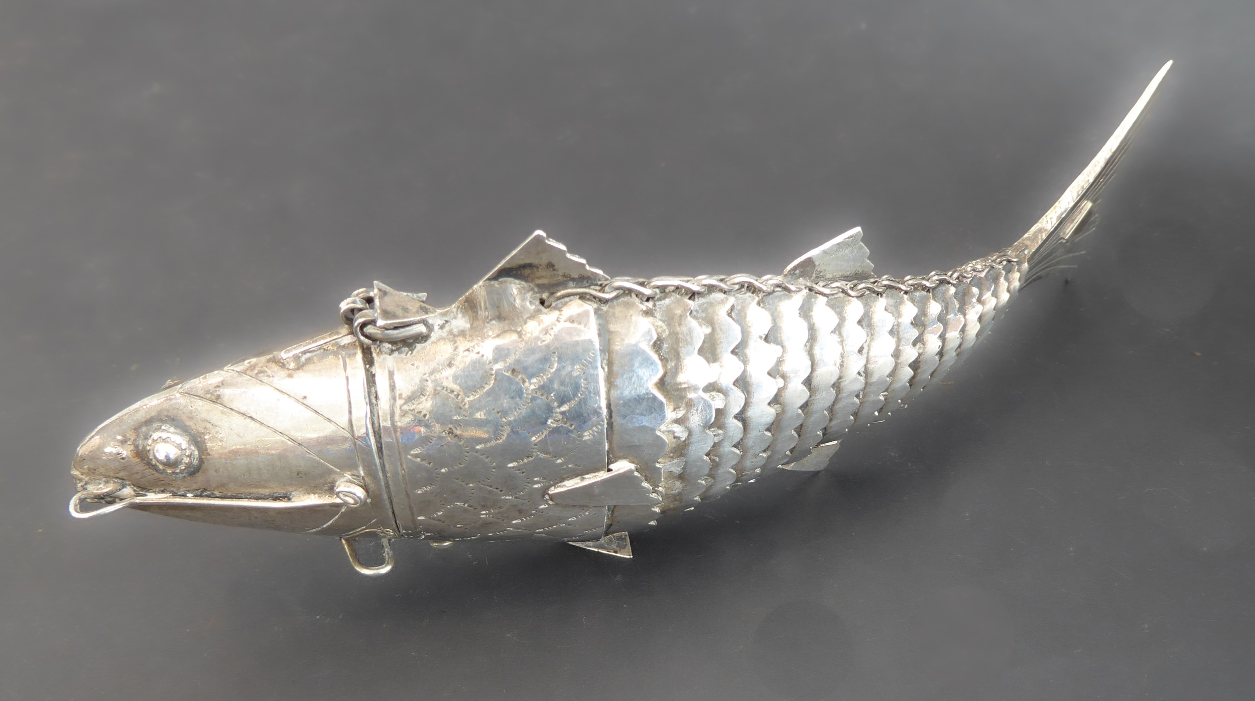 An interesting white-metal model of articulated fish: the hinged head opening to reveal a small compartment (probably Dutch or German) (approx. 47g)