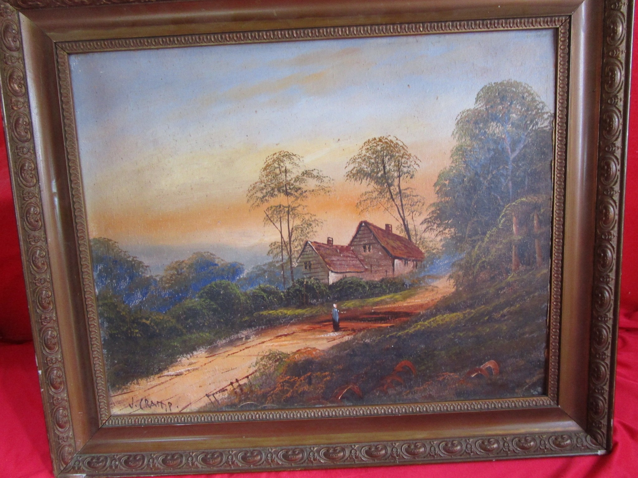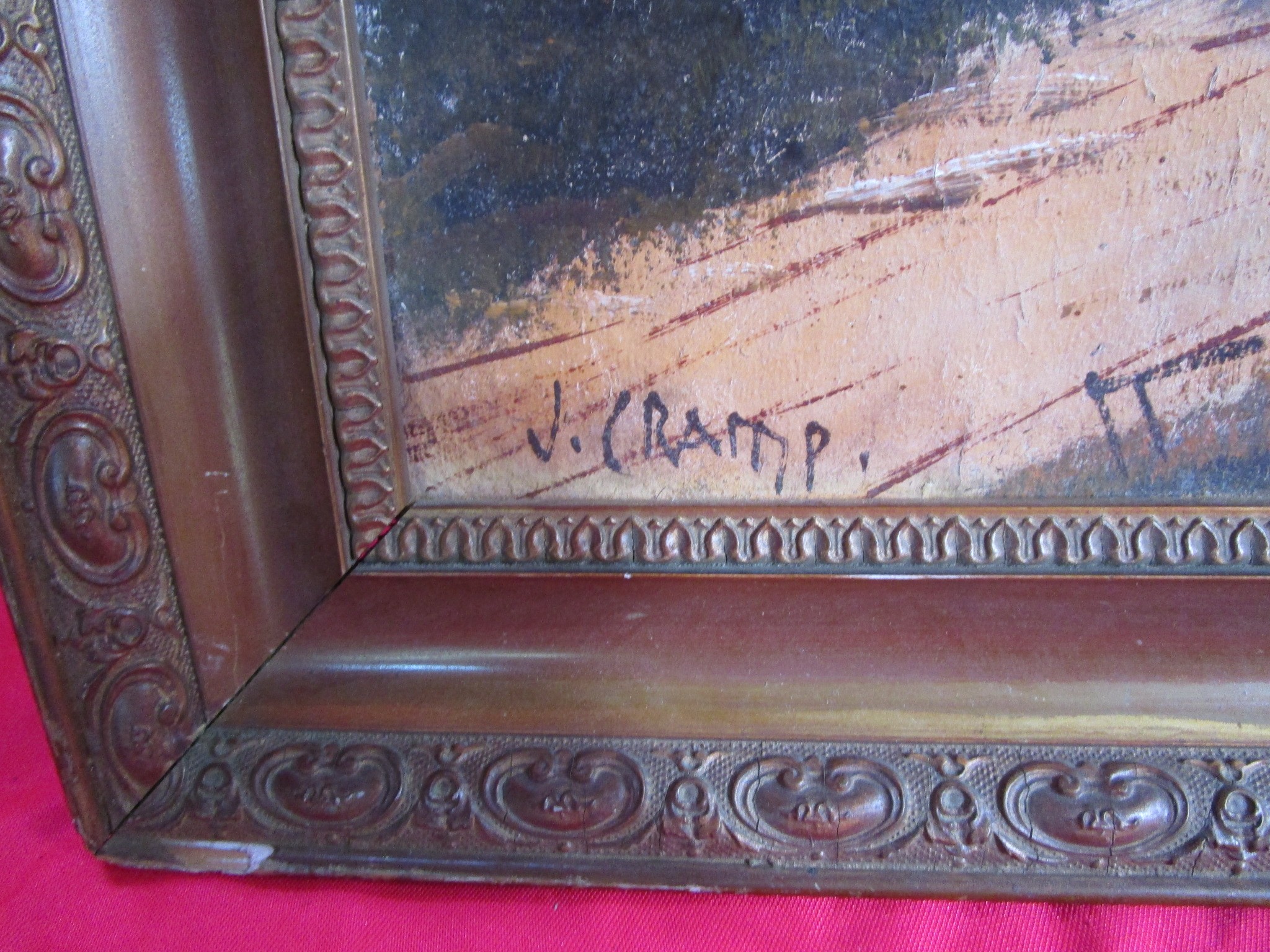 An Oil on board signed J Cramp approx. 20 by 24 inches.