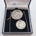 A 1964 90% proof silver Kennedy half-dollar brooch with safety chain. Together with a quarter dollar pendant and sterling silver chain, length 48cm.