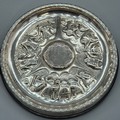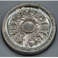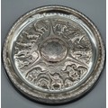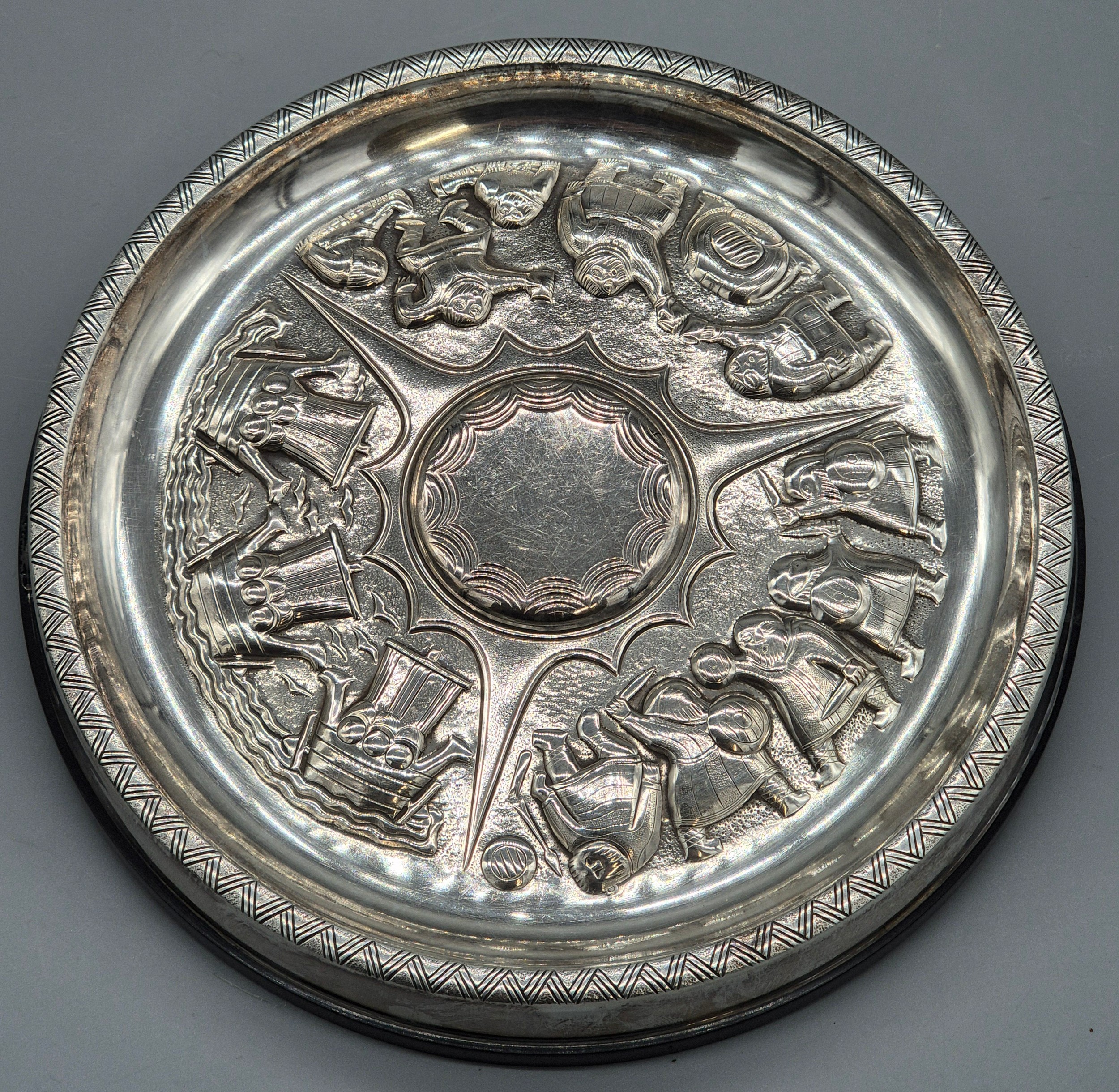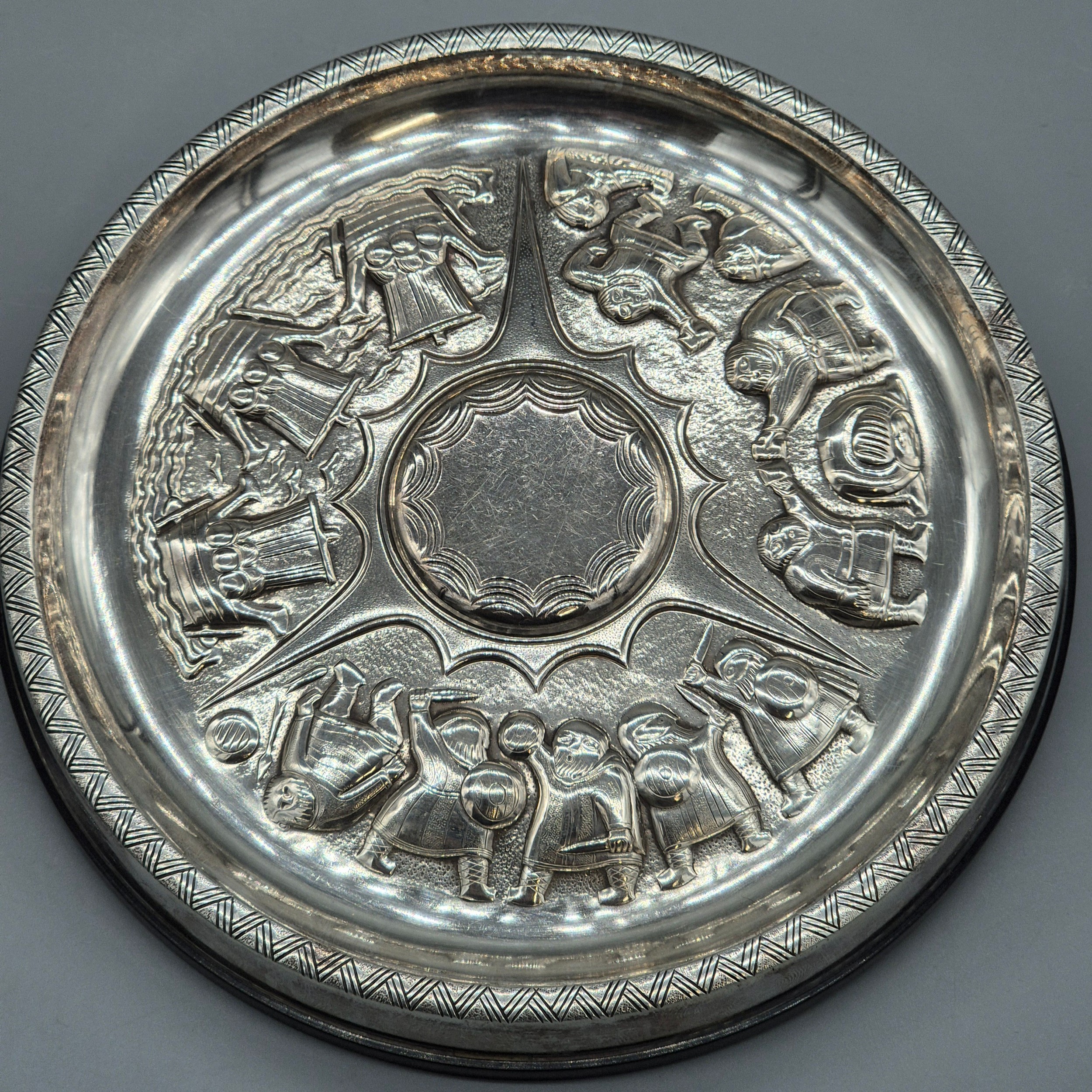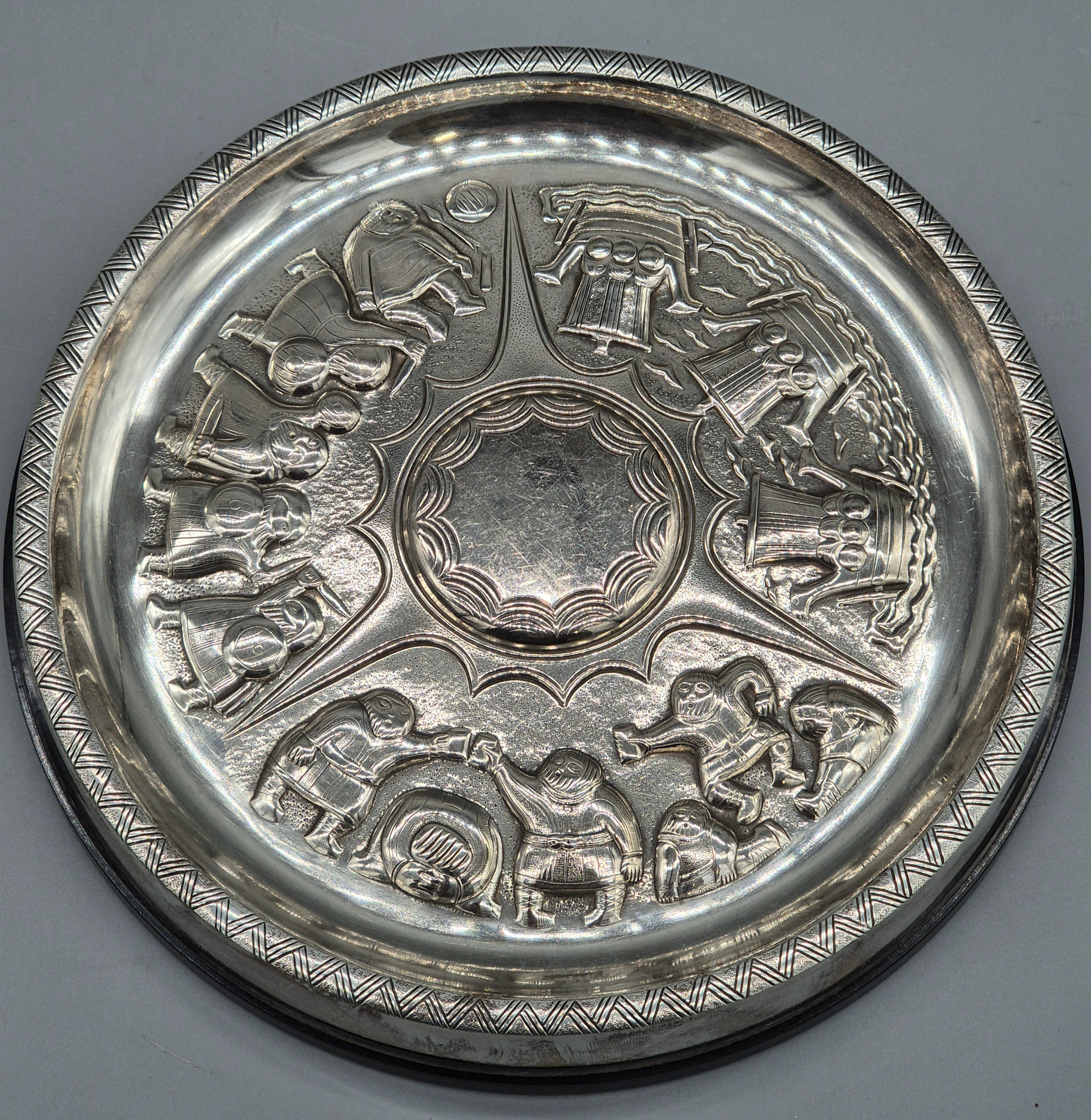 Swedish Silver Viking dish. Designed with raised relief warriors and longboats. Maker GAB. Silver is raised upon a bakelite base. 17.5cm diameter.
