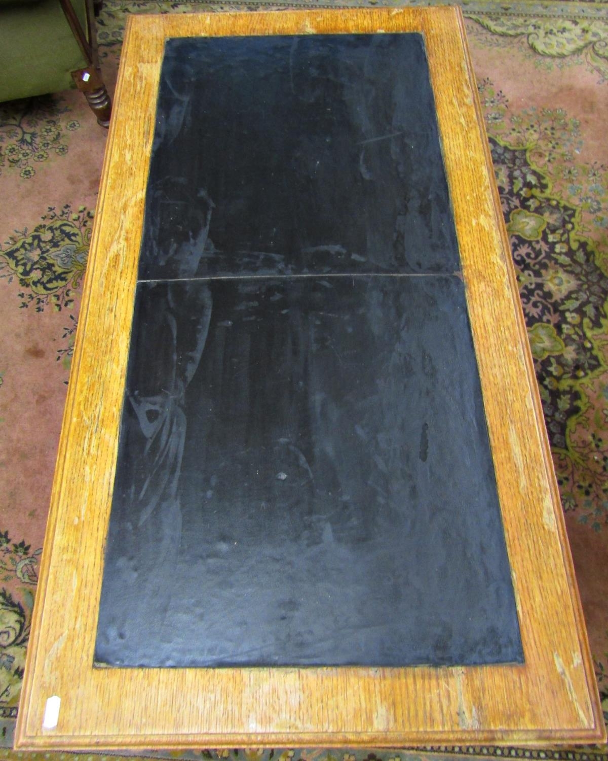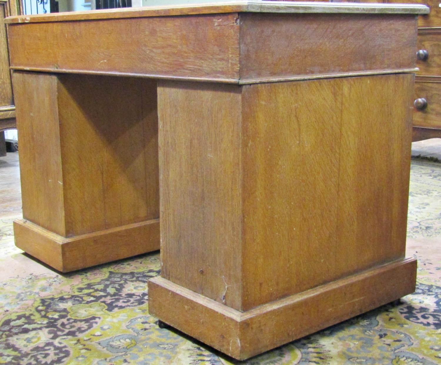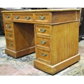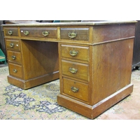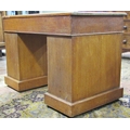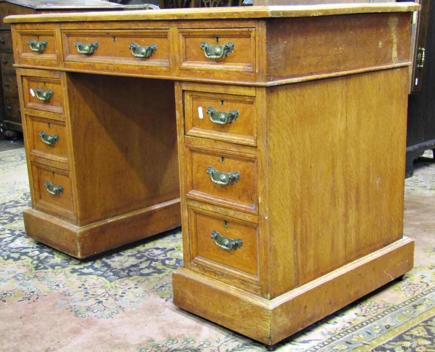 An oak pedestal desk of nine graduated drawers with brass plate handles and inset top, 110cm wide