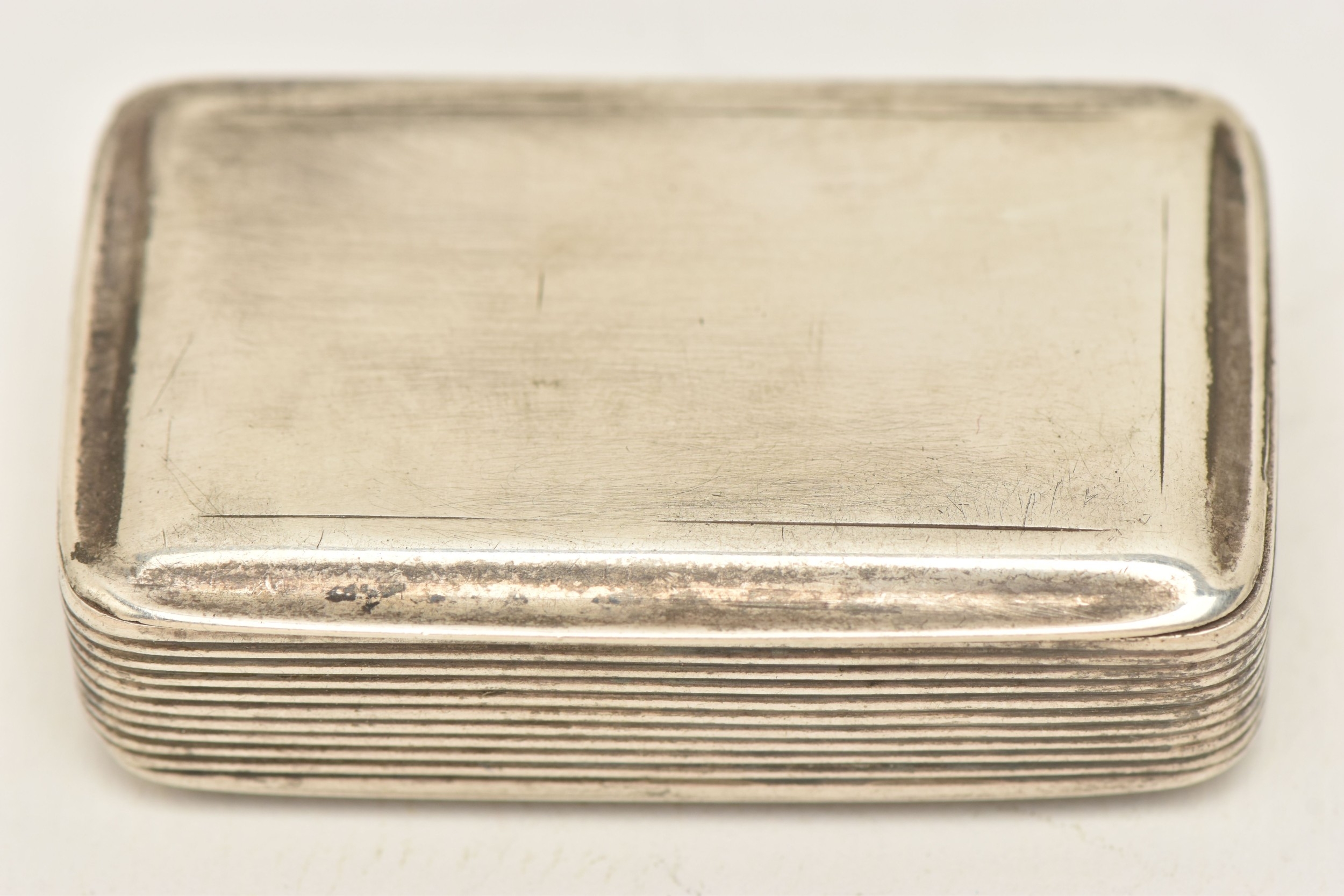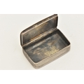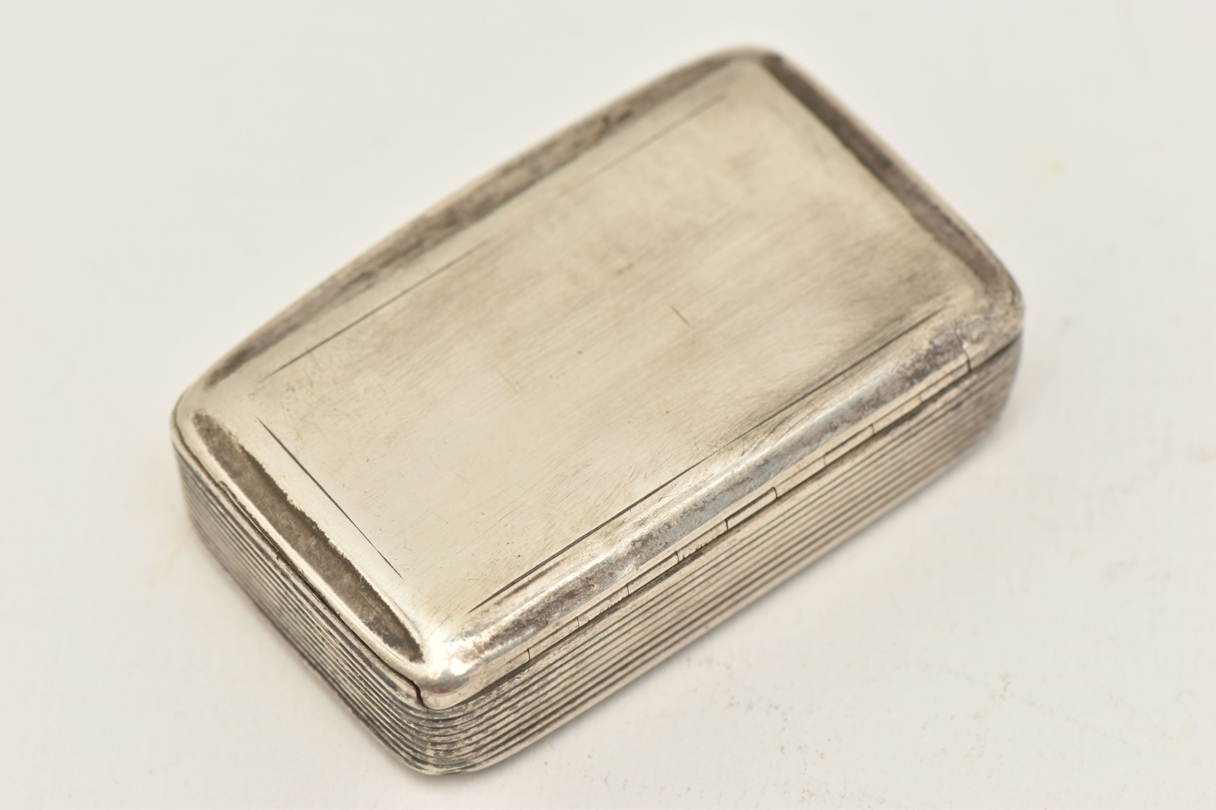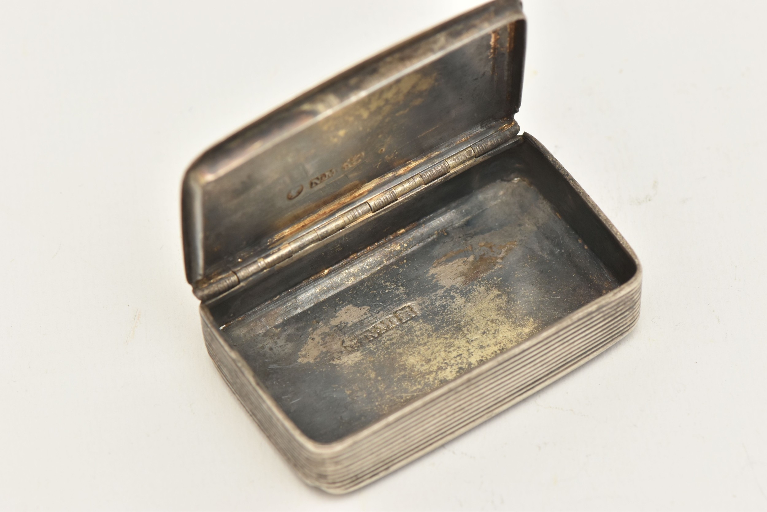 AN EARLY VICTORIAN 'NATHANIEL MILLS' SILVER SNUFF BOX, of a rectangular form with hinged cover, hallmarked 'Nathaniel Mills' Birmingham 1840, approximate length 5.5cm x 3.5cm, approximate gross weight 30.0 grams, 0.96 ozt (condition report: general wear in keeping with age, light tarnishing to the outside and moderate tarnishing to the inside, light surface scratches, overall condition good)