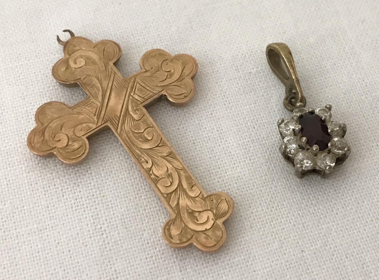 A vintage gold cross pendant with engraved detail to front. Bale needs attention. Together with a small drop pendant with central garnet surrounded by clear stones. Total weight approx. 1.9g