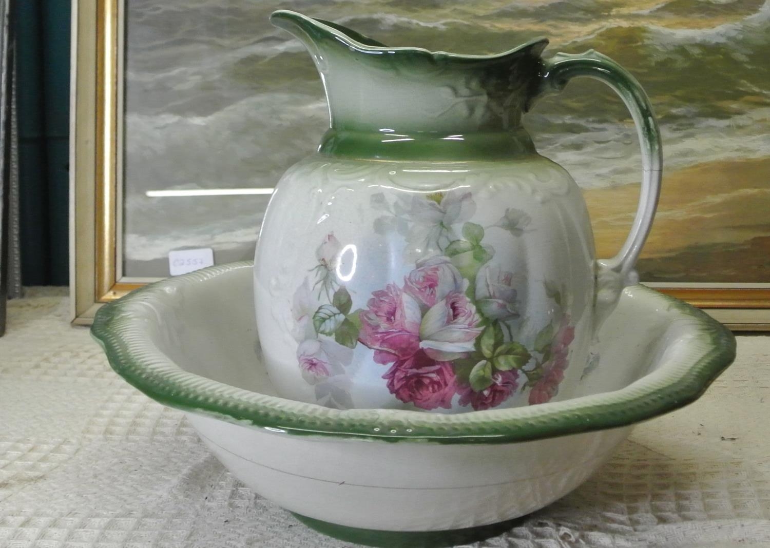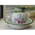 A water jug and basin with decorative floral scenes.