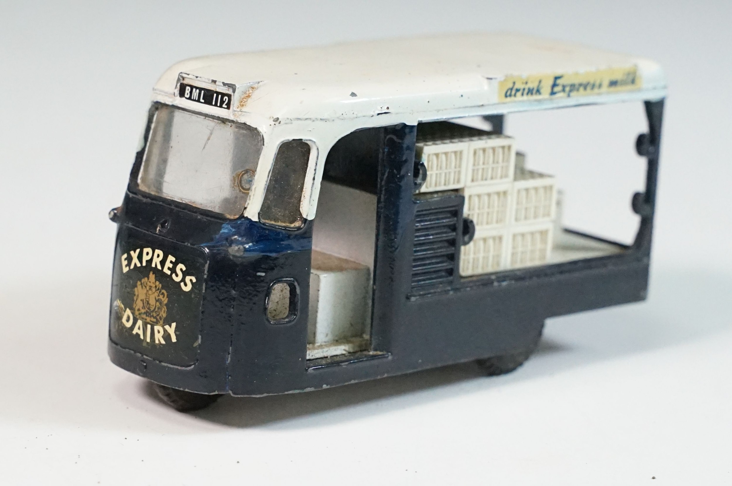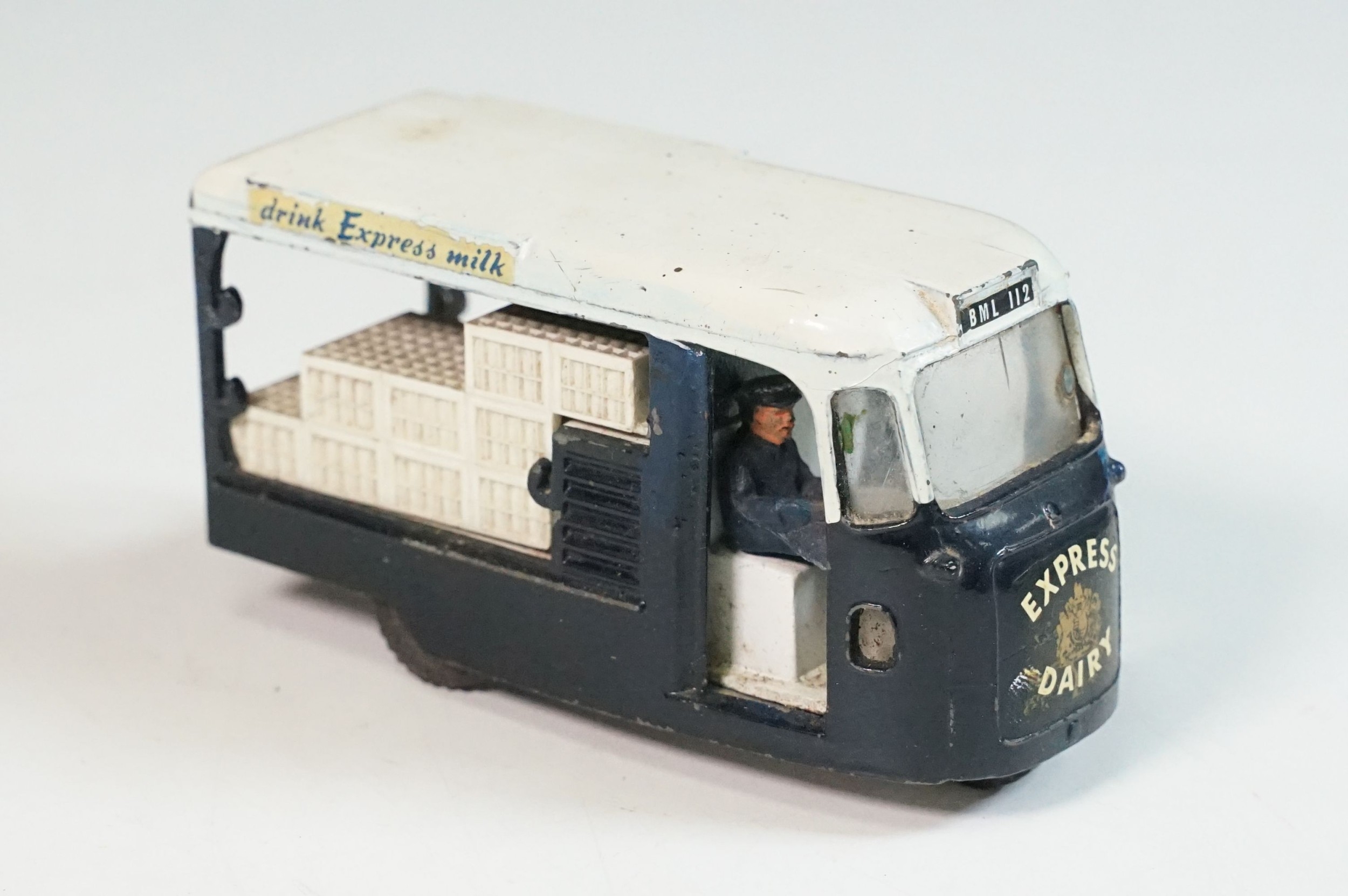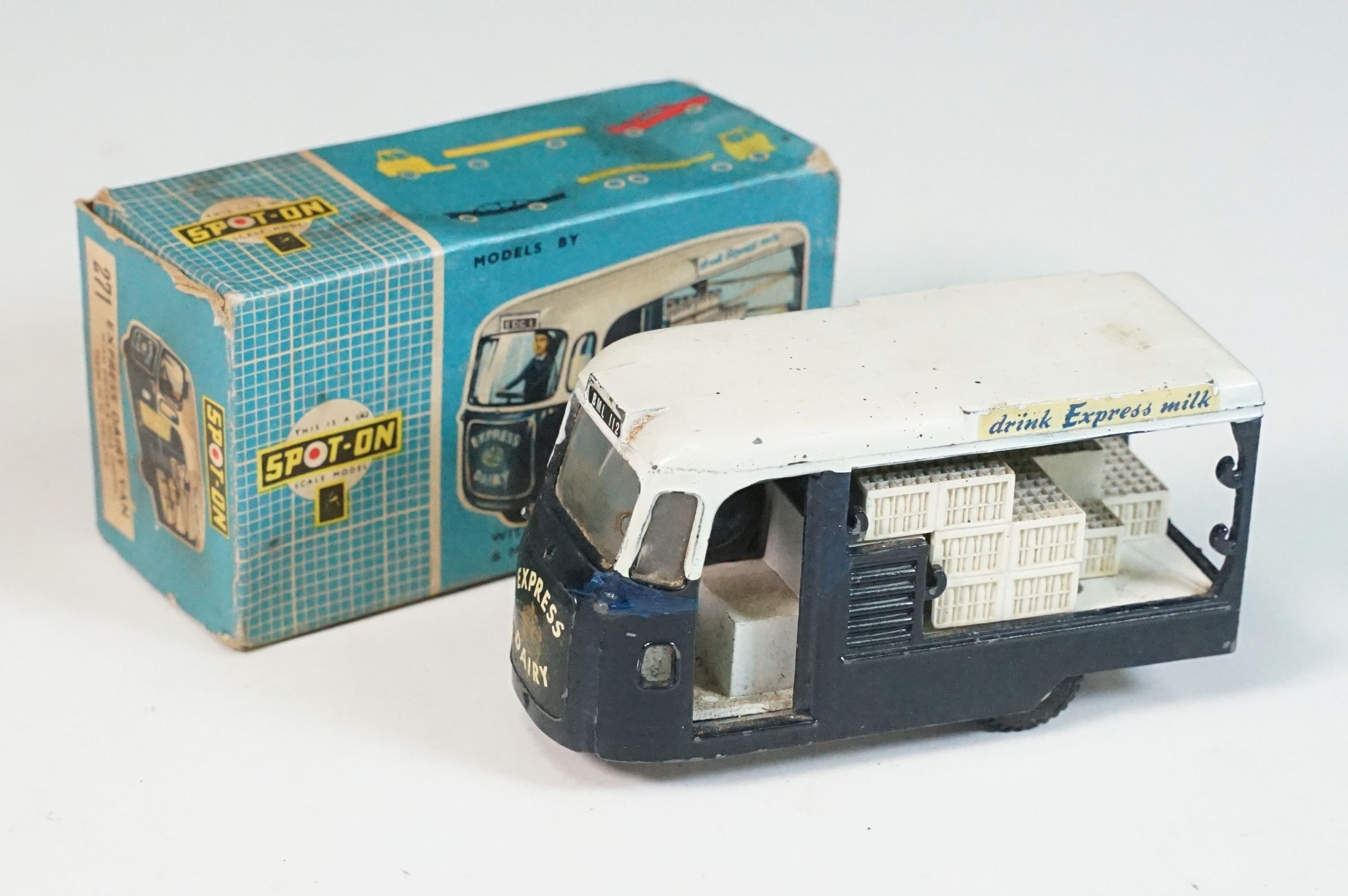 Boxed Triang Spot On 271 Express Dairy Van diecast model, with driver figure and crates, play wear and marks and grubby box missing an end flap
