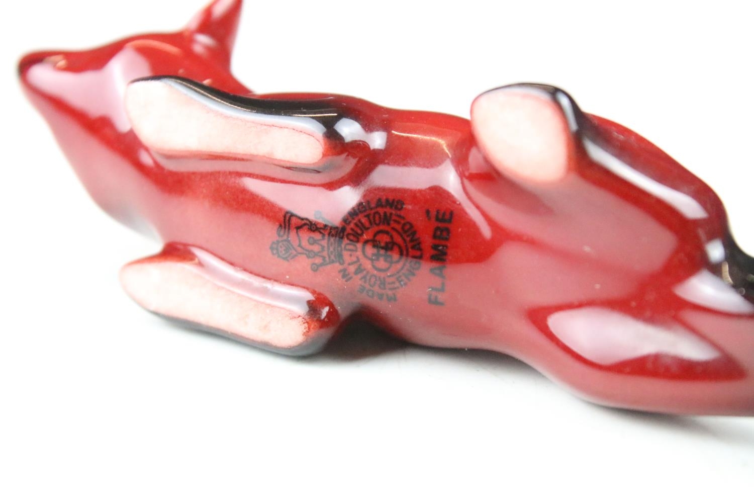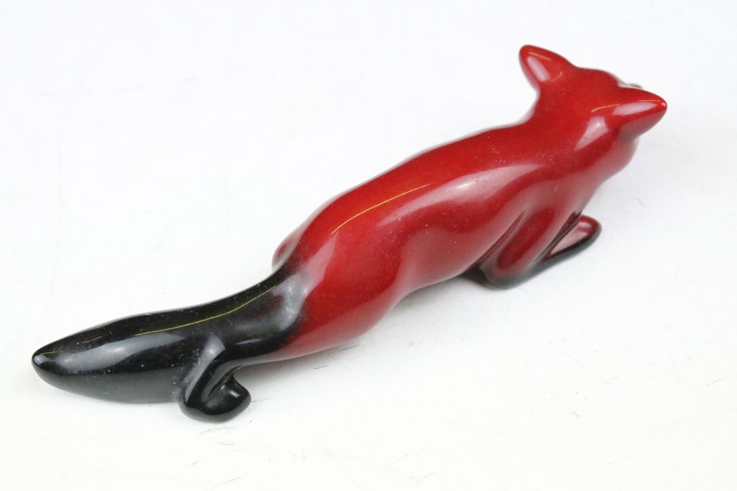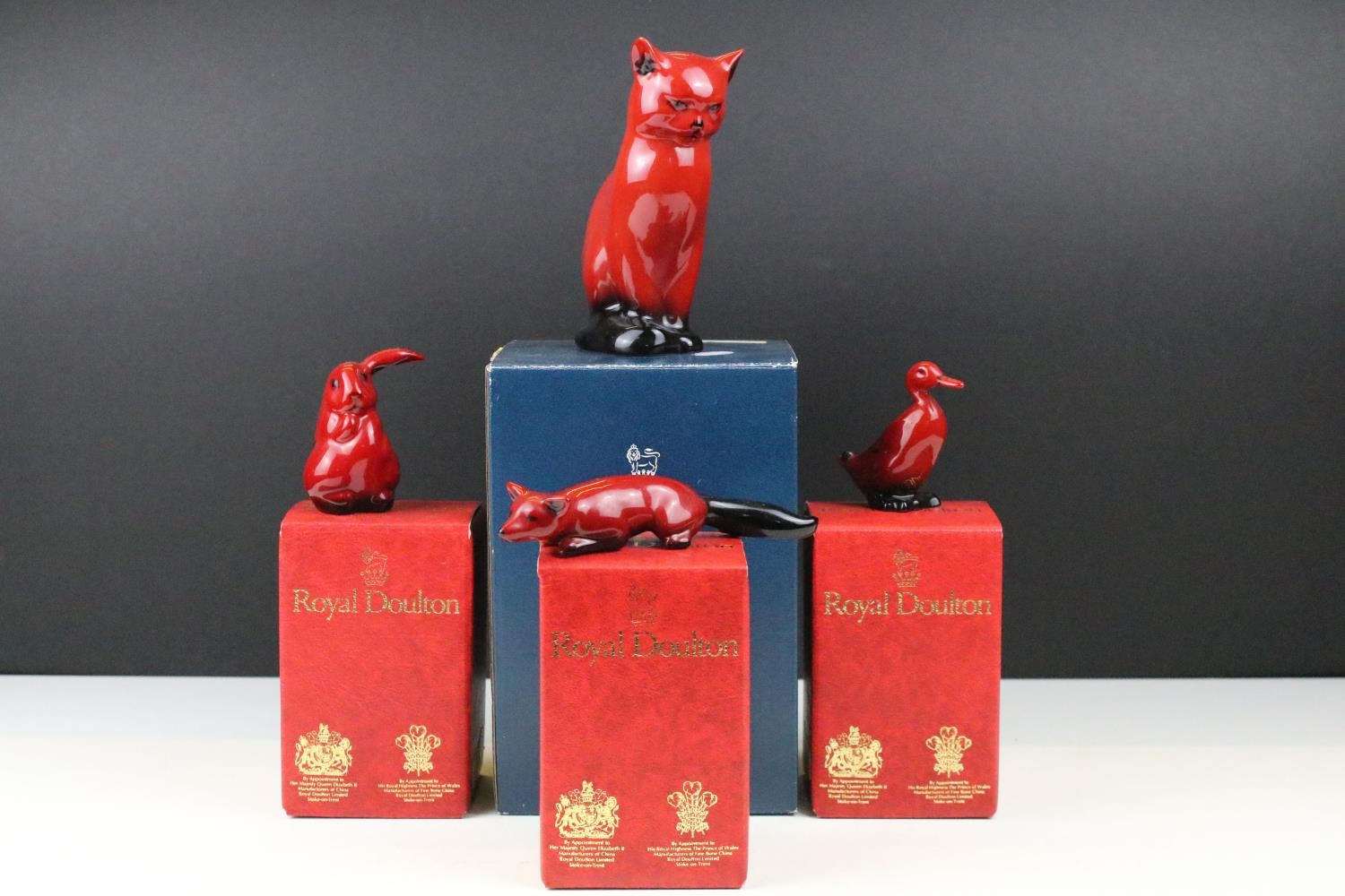 Four boxed Royal Doulton flambé porcelain animals to include Fox (298), Rabbit (113), Duck (395) and Cat 9 (01640 - approx 12.5cm tall)