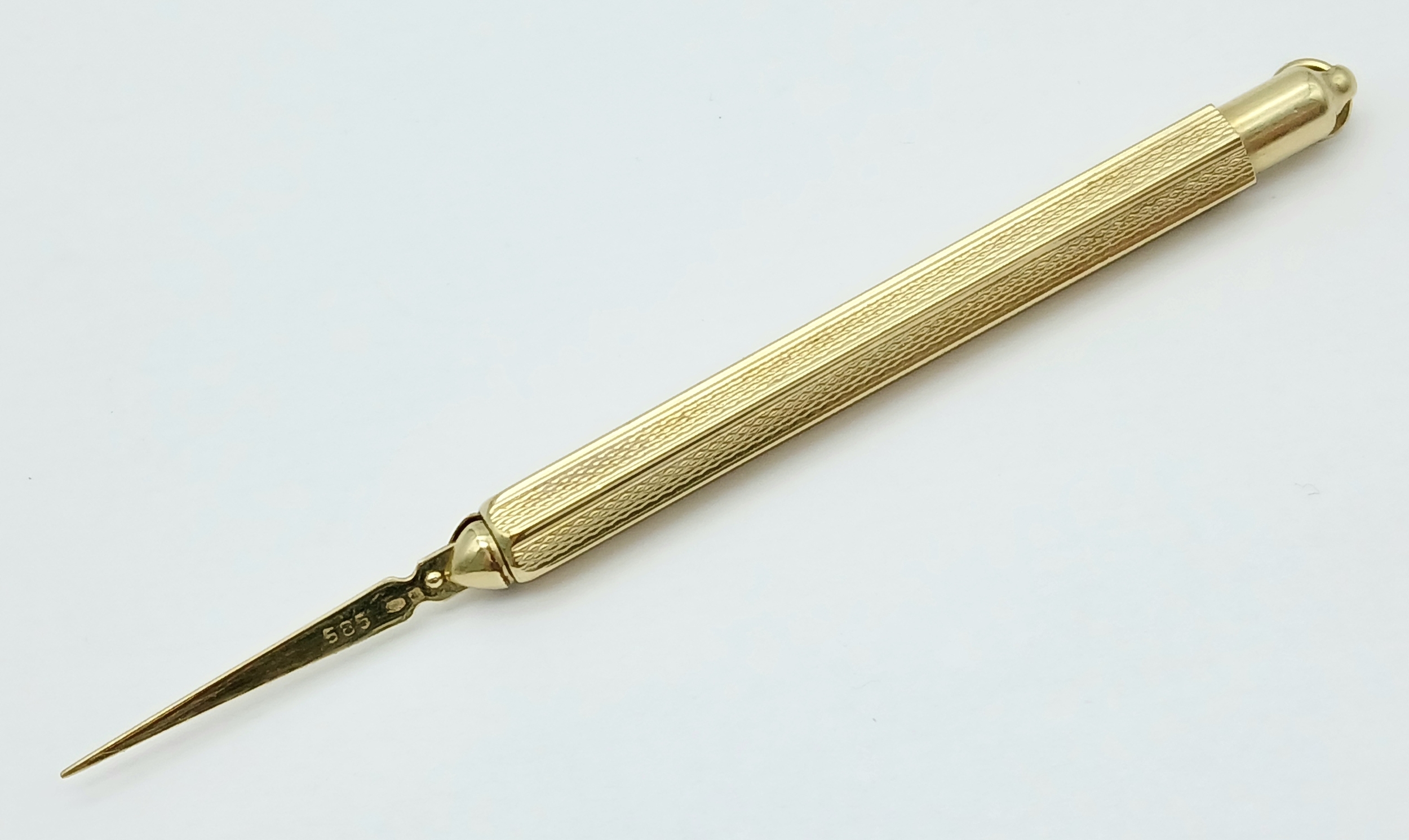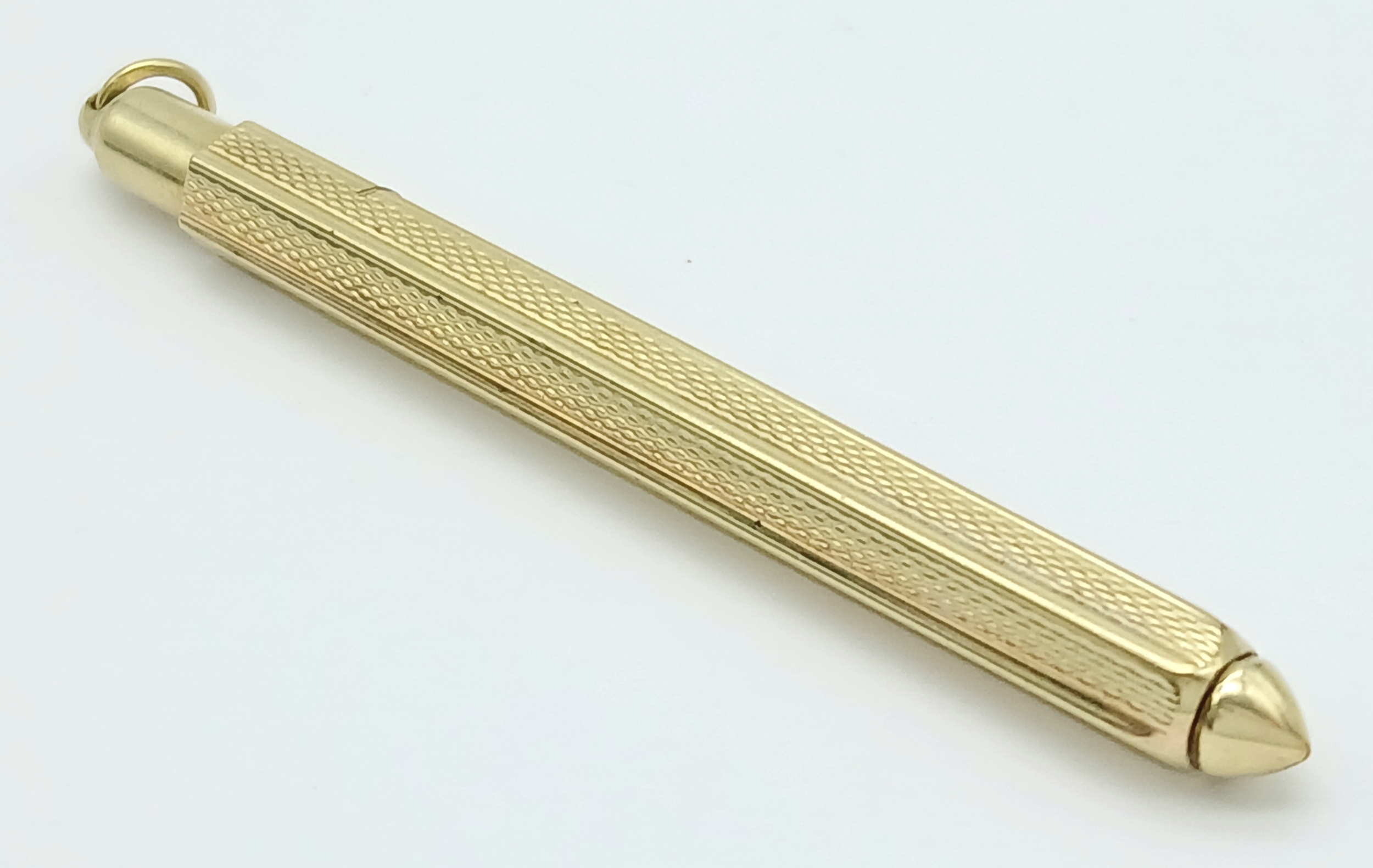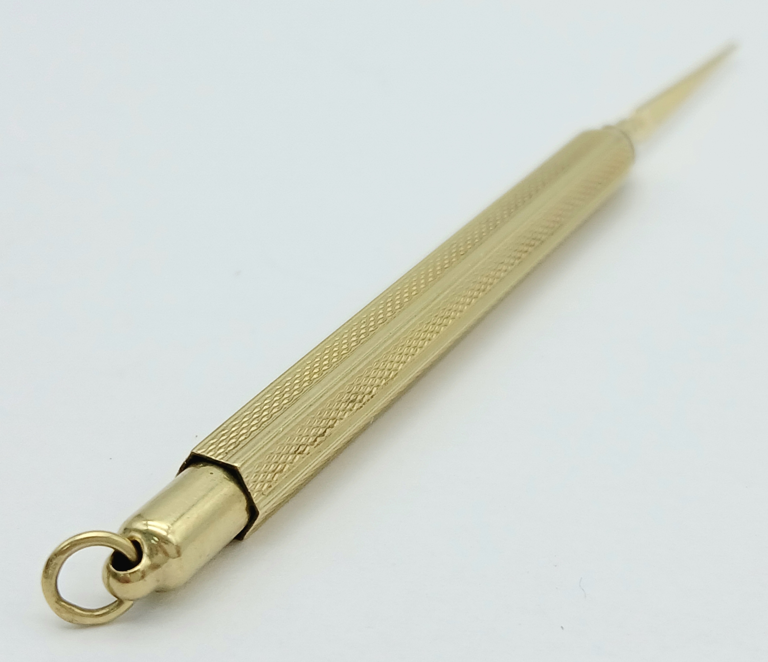 A Fascinating 14K Gold Retractable Toothpick Pendant! 6.5cm retracted. 6.1g.