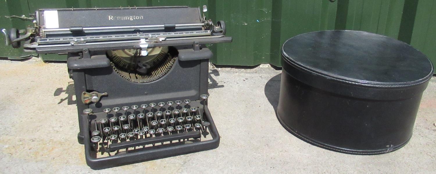 Jon Culshaw Collection - Remington desktop type writer, black textured case with Querty keyboard W49cm D37cm H25cm, and a circular black leather effect hat box D5cm (2)