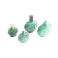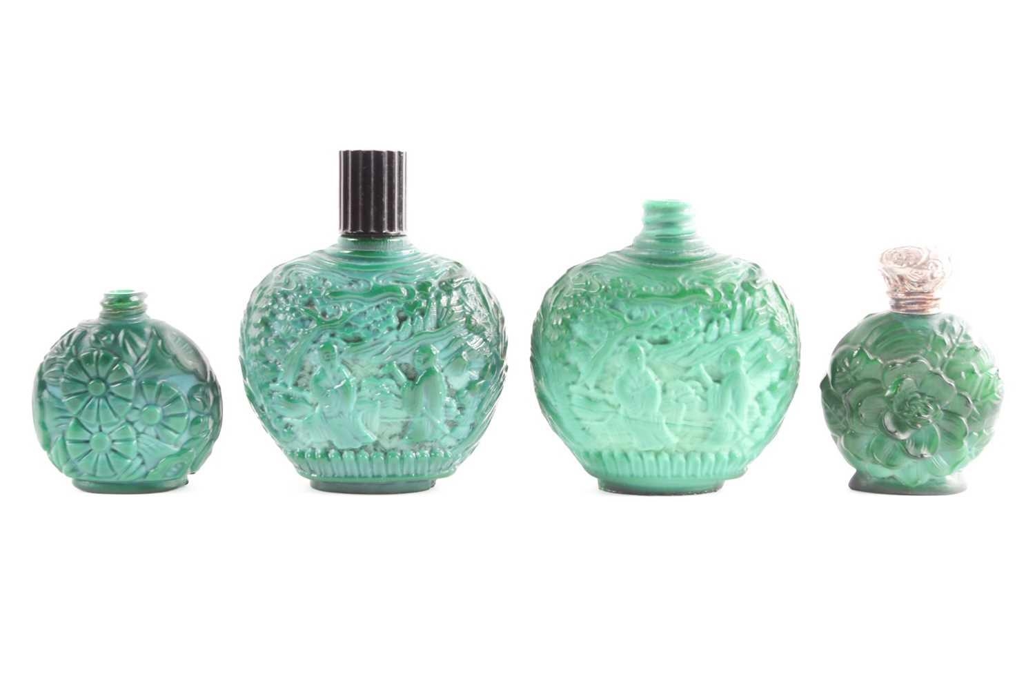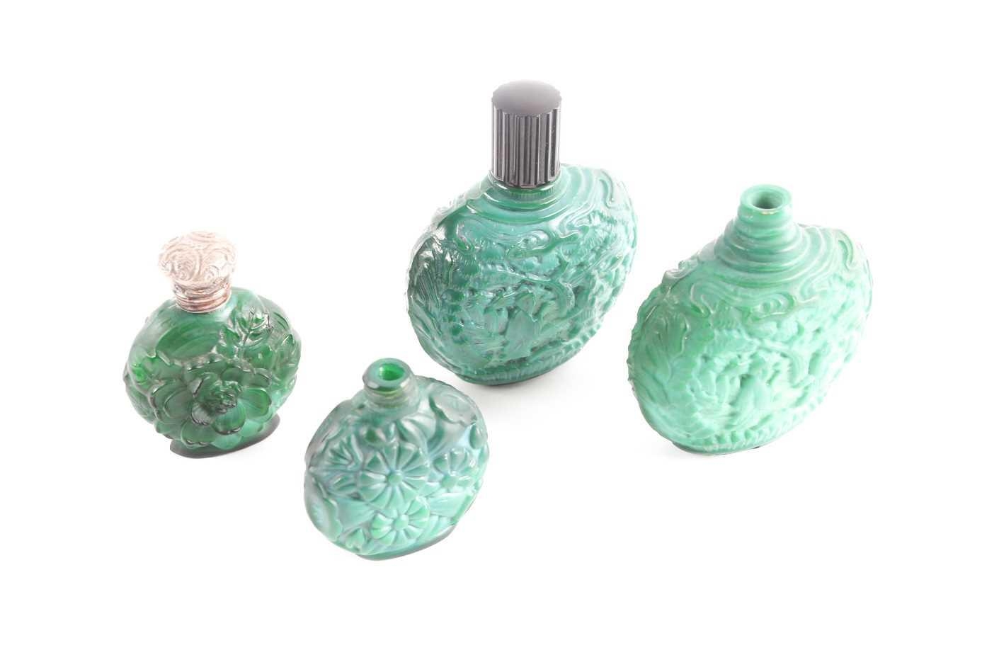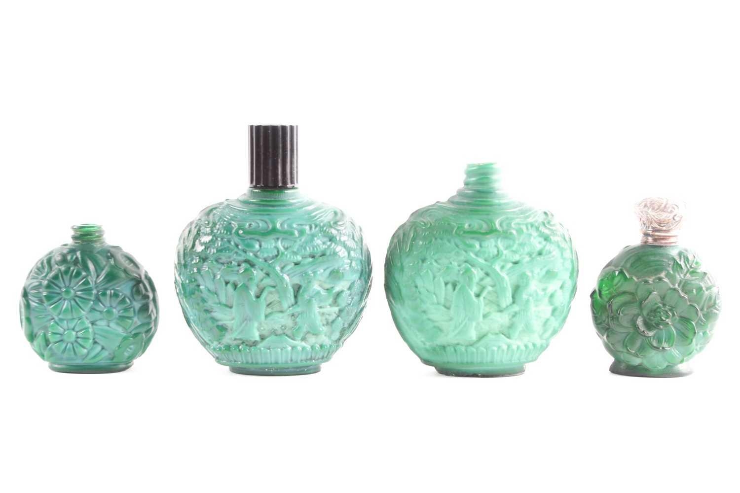 A collection of four carved and moulded green glass scent bottles; carved with scenes from rural life and flowers and foliage. one with a white metal screw off cover (4)