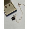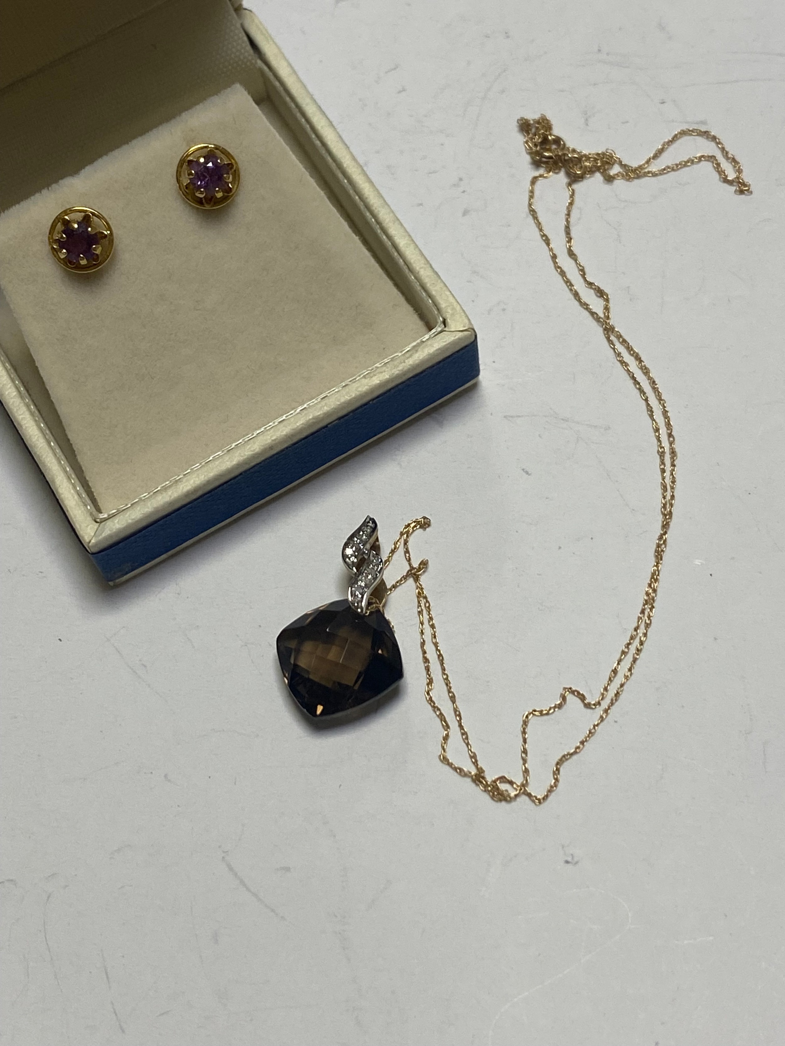 A 9ct gold quartz set pendant on chain and a pair of 9ct and amethyst earrings -