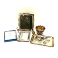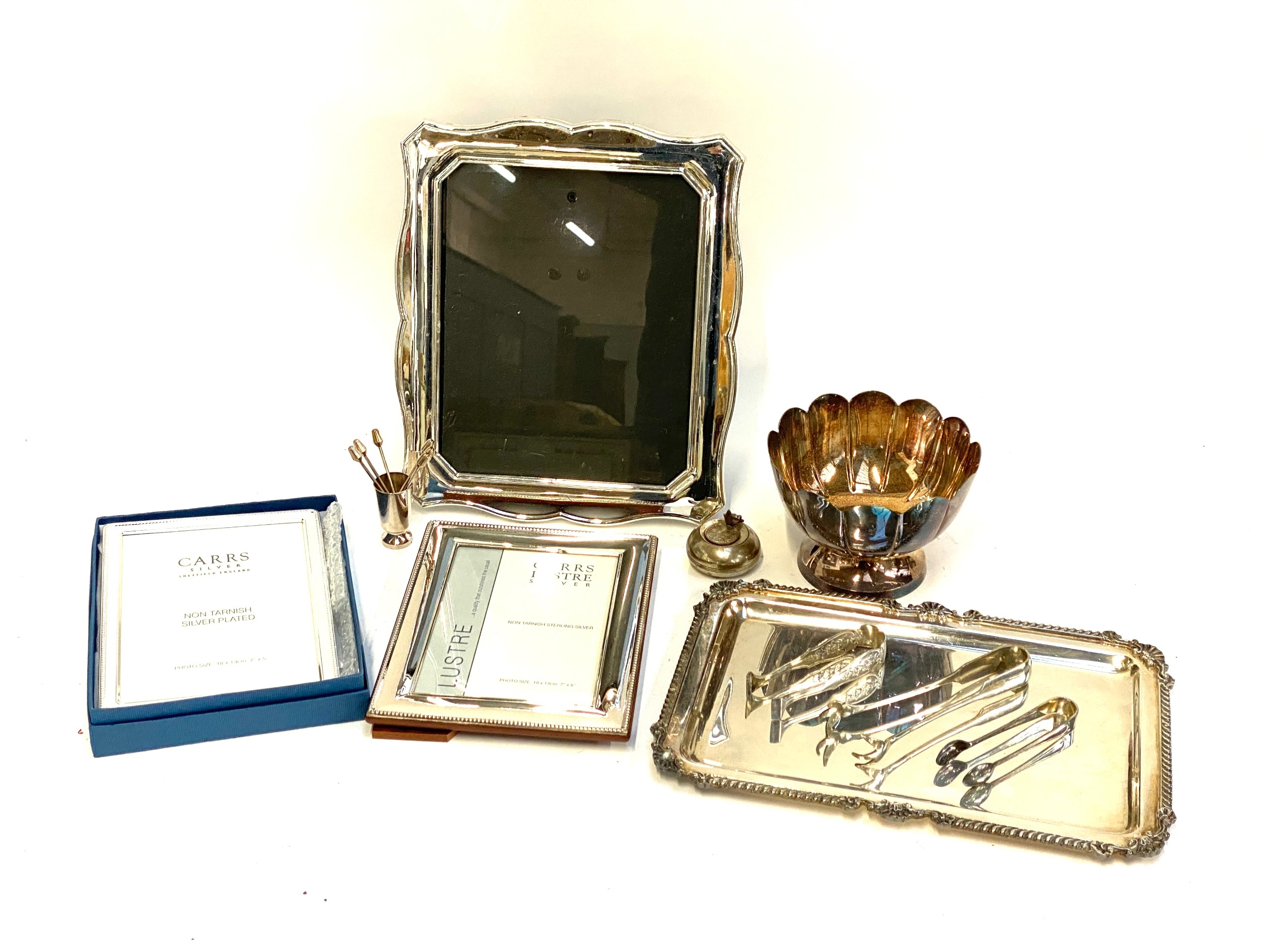 A quantity of silver plated items to include two Carrs picture frames (one new with box), a Christofle toothpick holder, Argenta tray, lobed plated bowl etc