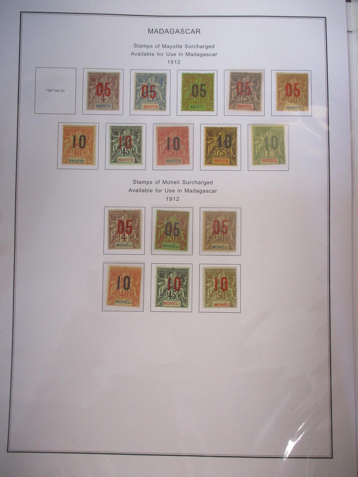 French Colonies. Coln in eight sparsely filled or empty printed page binders incl Cameroon 1941 Spitfire Fund ovpt pair M, Comoro Islands with Anjoan 1912 set to 10c on 1f M, Great Comoro 1912 set to 10c on 75c M, Mayotte 1912 set to 10 on 1f (less 05c on 2c) M and Mohéli 1912 set to 10c on 50c M, FSAAT with 1976 set to 1f.40 M, French West Africa with 1945 set to 20f M with dupl vals M/U, 1947-58 vals to 25f M/U with P.Dues M and Tunisia. (See photos). (1½B)