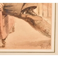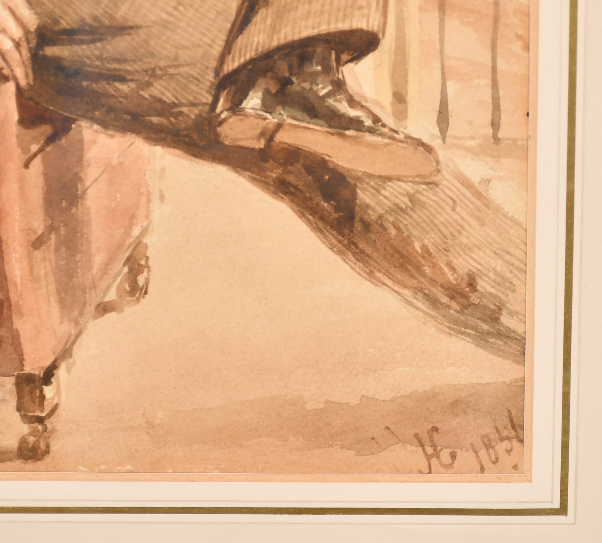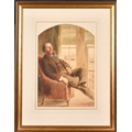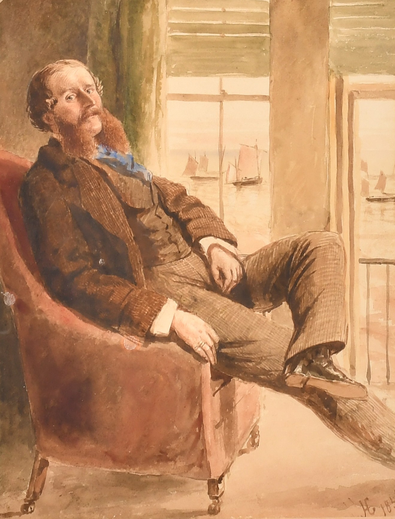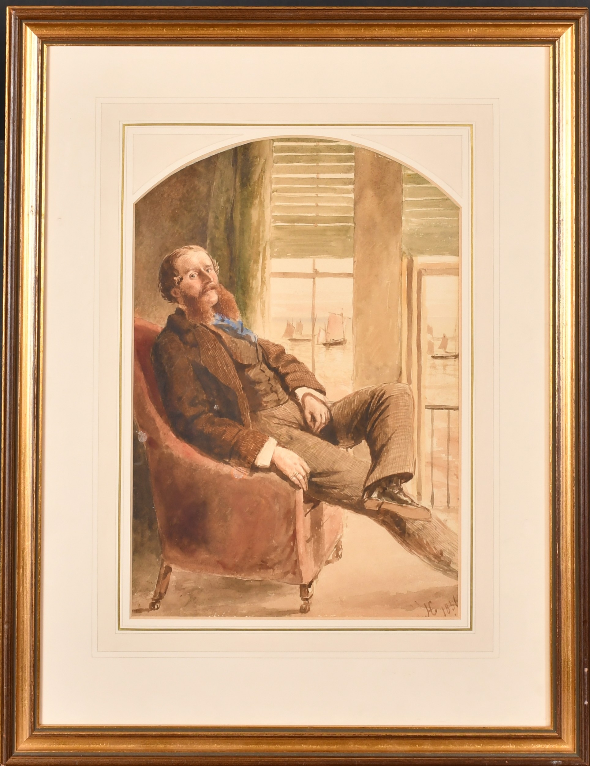19th Century English School. Portrait of a Man seated by a Window with boats on a river beyond, Watercolour, Signed with monogram and dated 1856, Arched 14.5" x 10" (36.8 x 25.4cm)