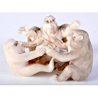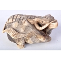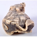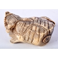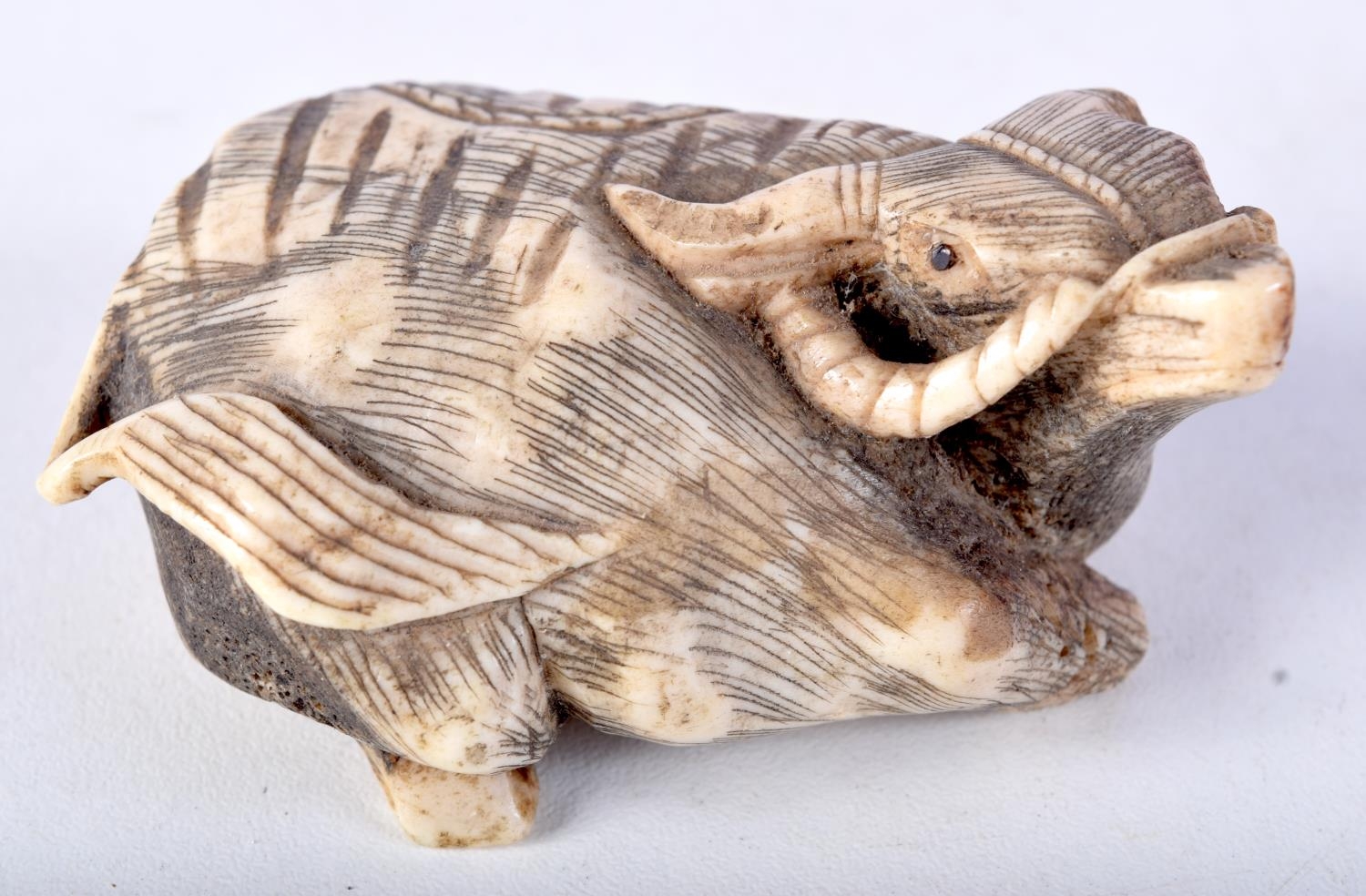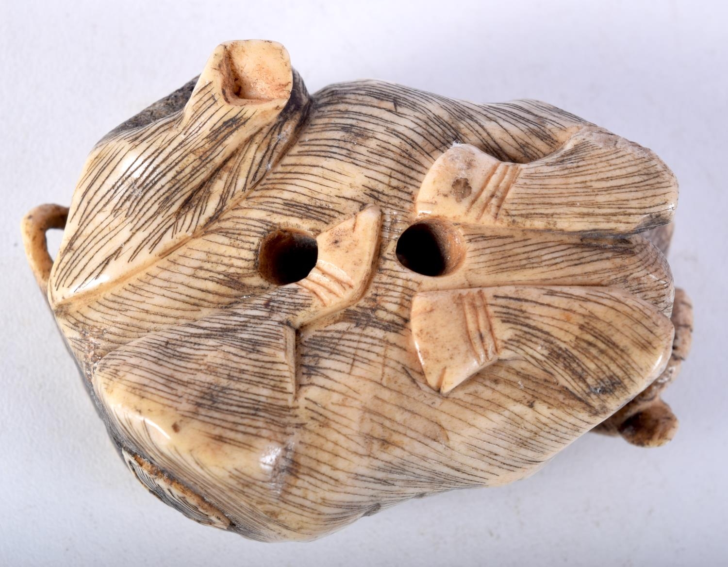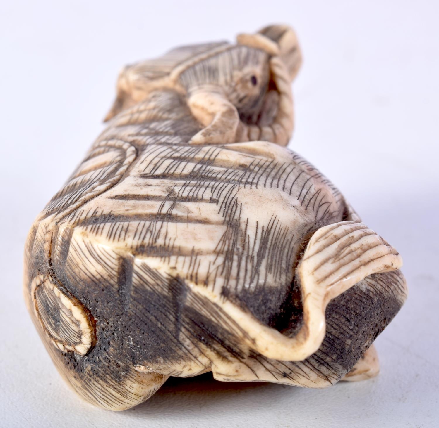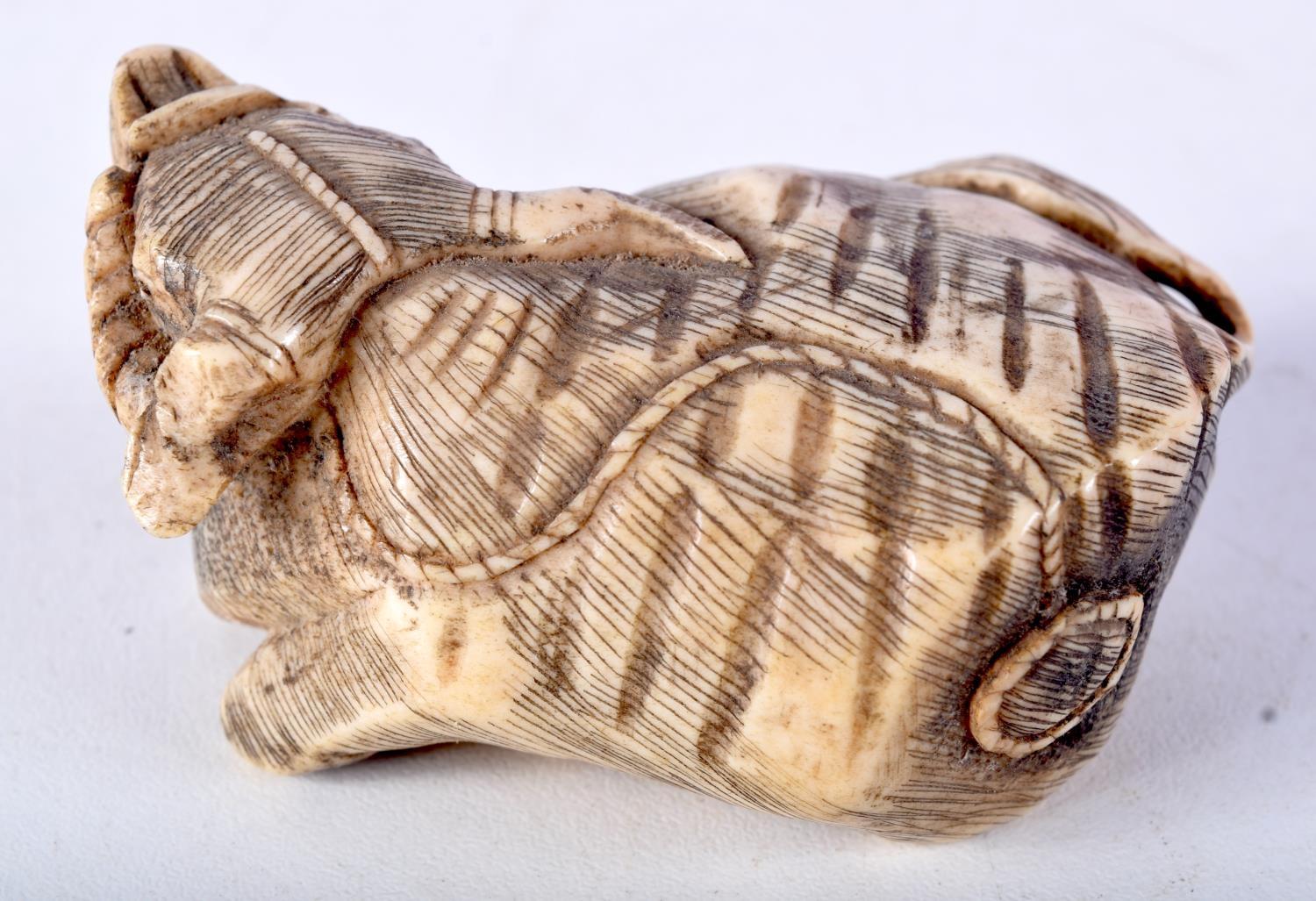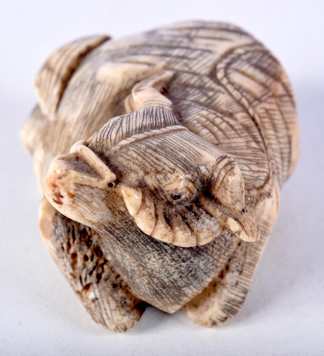 A LARGE 19TH CENTURY JAPANESE MEIJI PERIOD CARVED BONE NETSUKE modelled as a seated bullock. 6 cm x 4 cm.