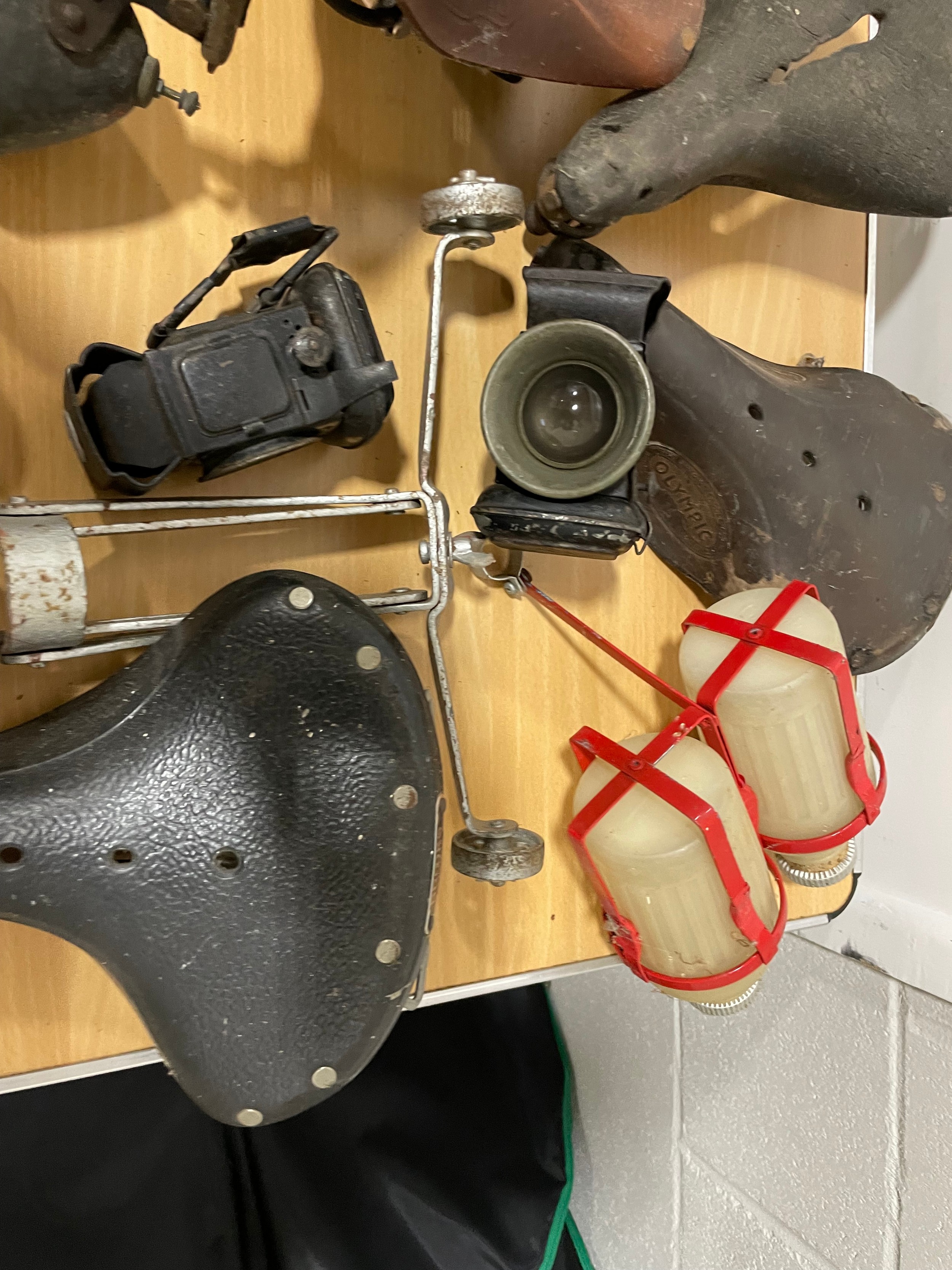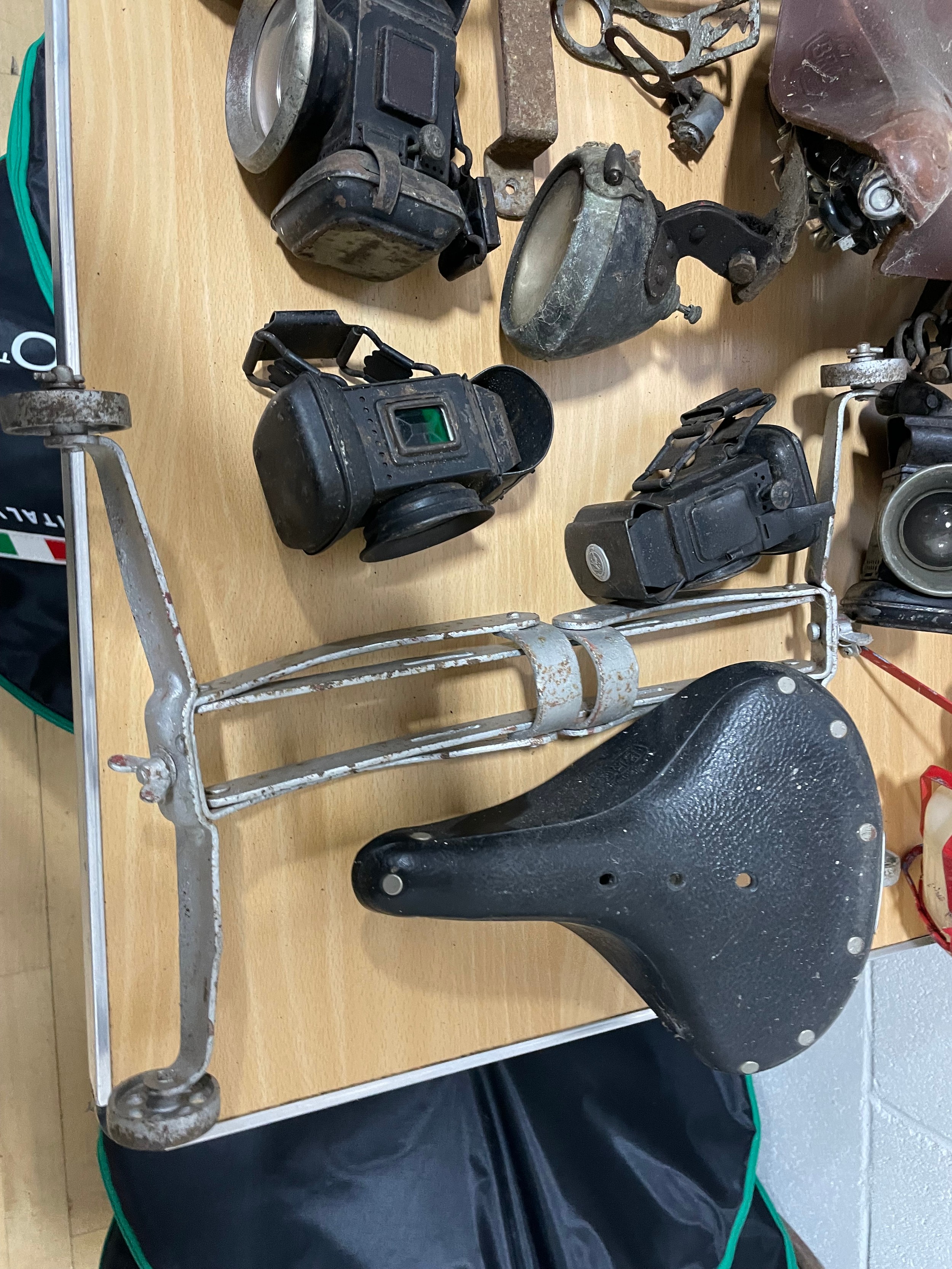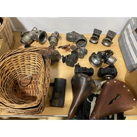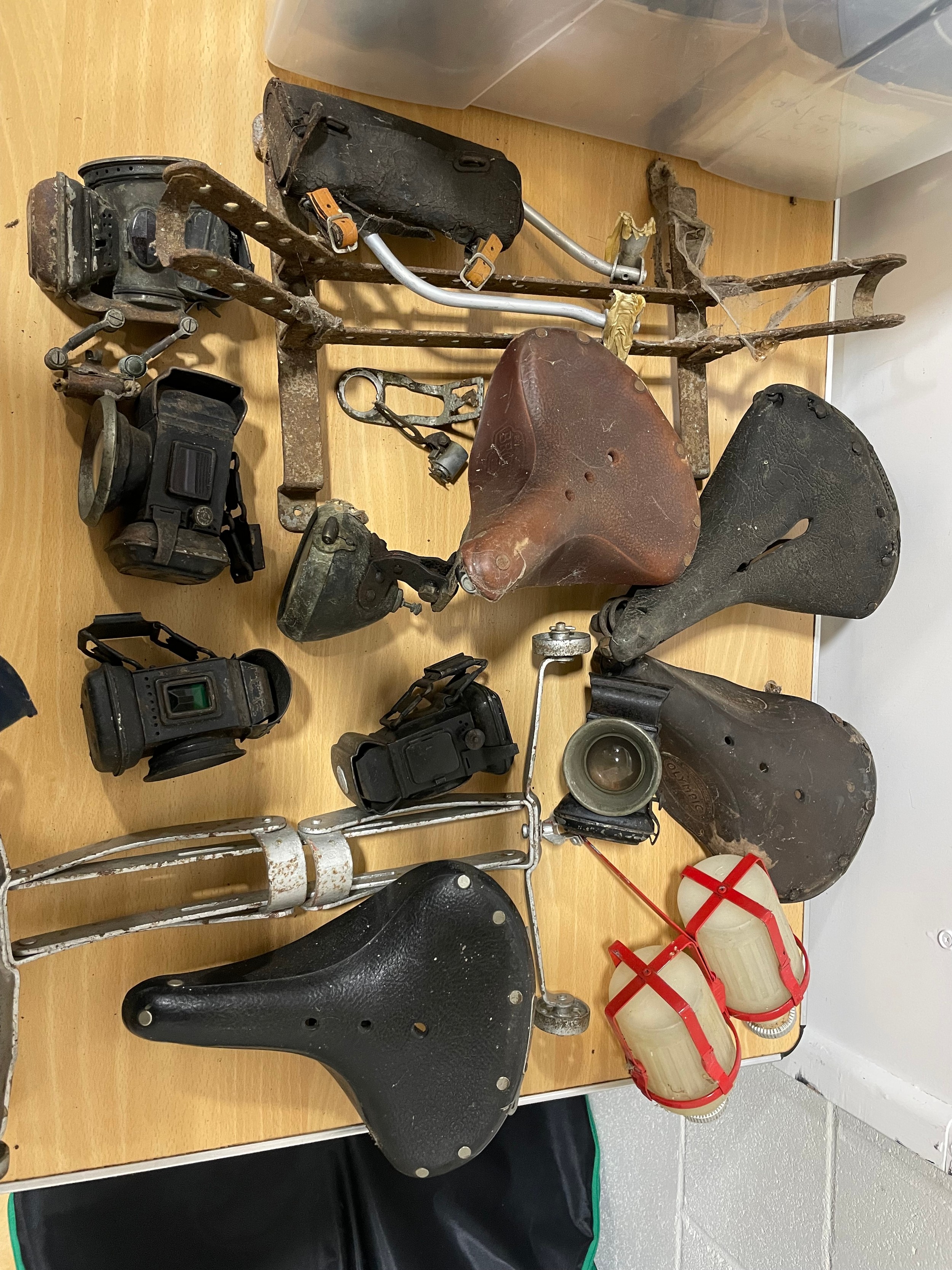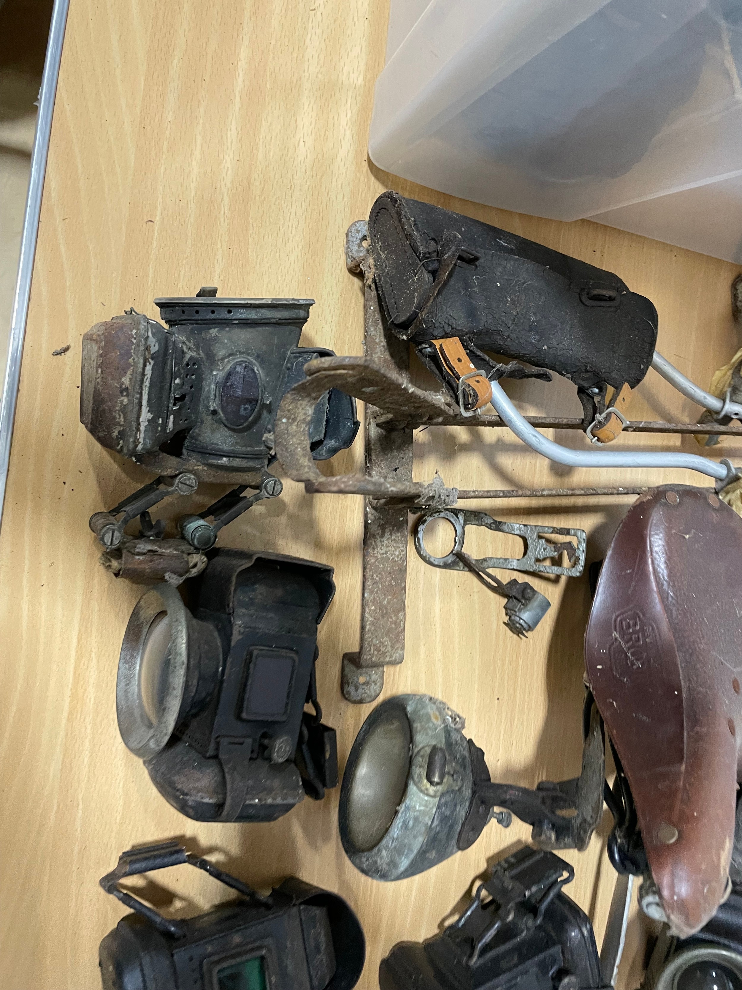 Box of Sundry Bicycle Parts, Saddles, Lamps, Etc