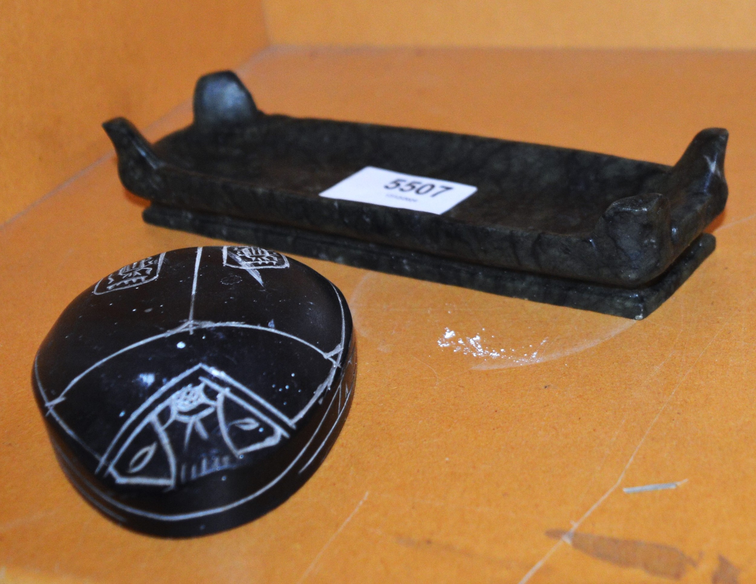 A Stone Scarab Paperweight and a "Basalt" Carved Mini Trough