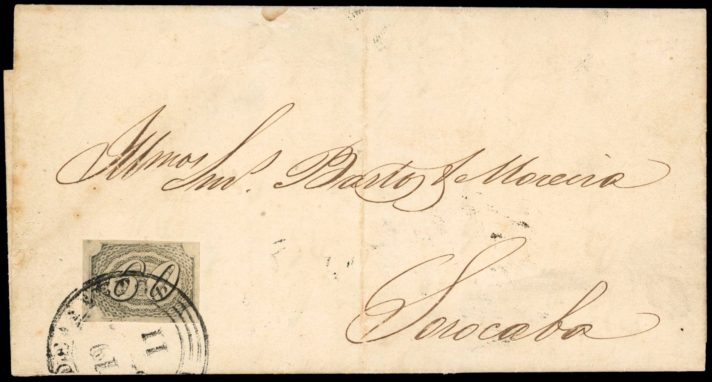 Slanting Figures: 1845 (19 Nov) entire to Sorocaba franked 60r. black, type II, Worn Impression on thin yellowish paper, good to clear margins tied Santos date stamps, an unusual example with stamp on front, Moorhouse Cert (2010), Ex. Bopp