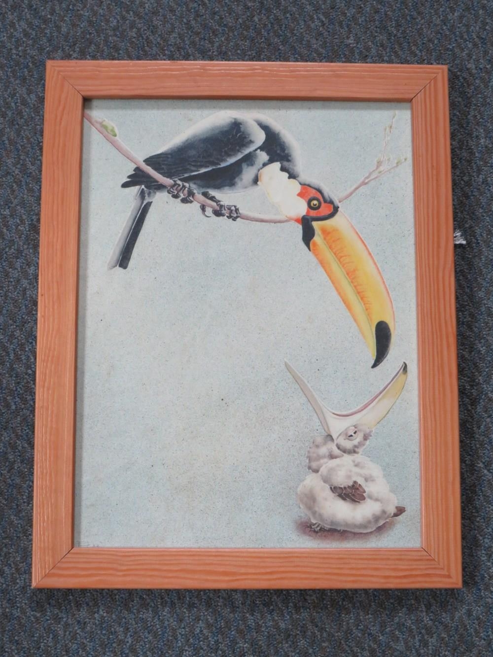 F.P. ?; An illustration of a toucan feeding its young, signed with monogram and dated 1933 lower left, watercolour, framed and glazed, 39 x 29 cm