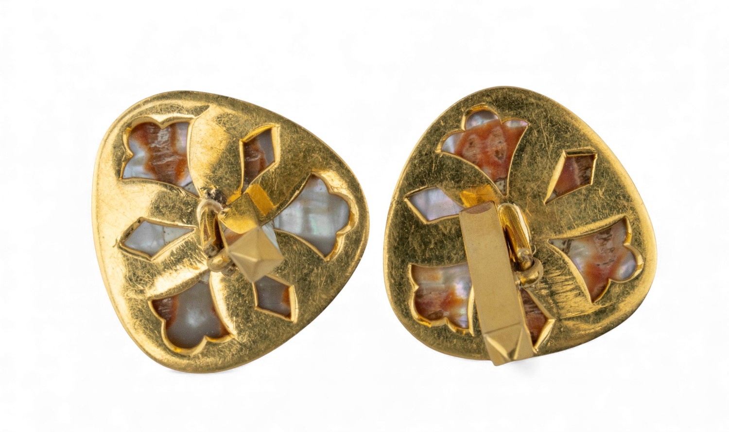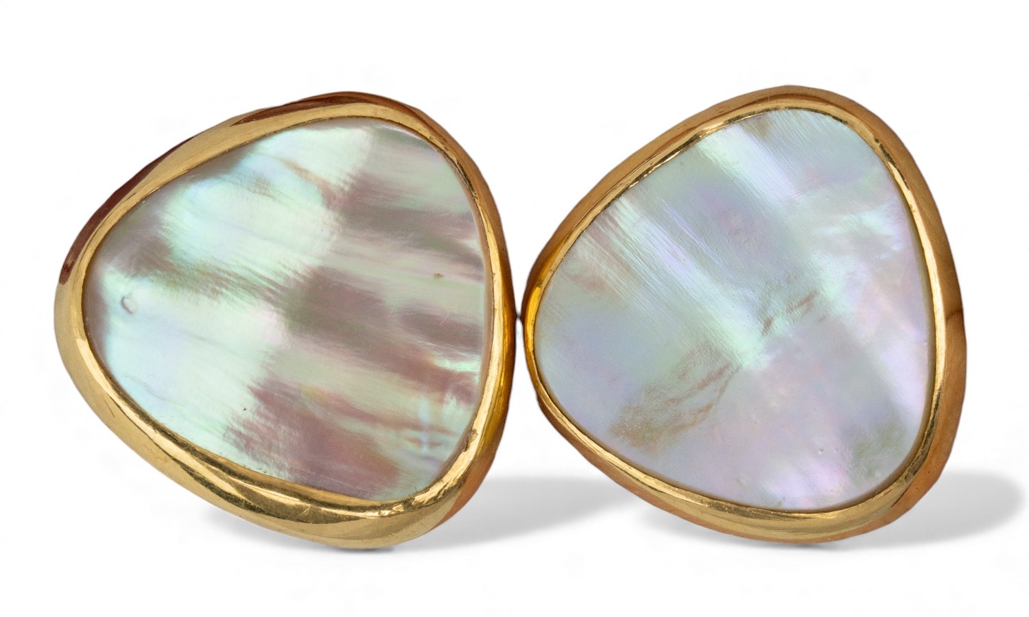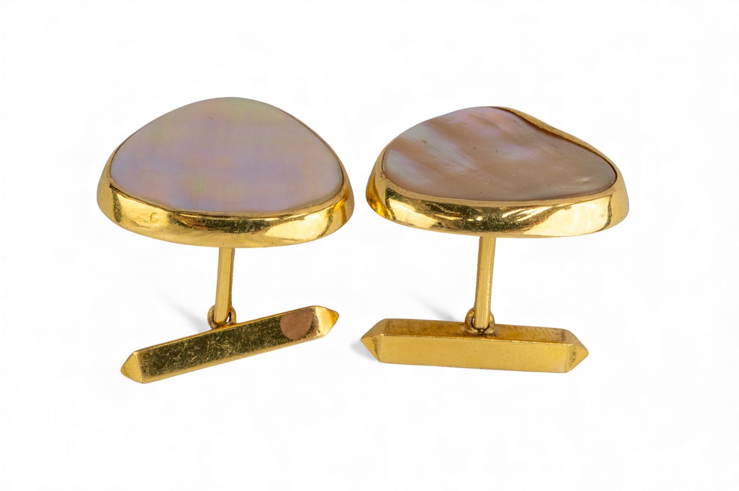 A pair of mother of pearl and yellow metal triangular shaped cufflinks
